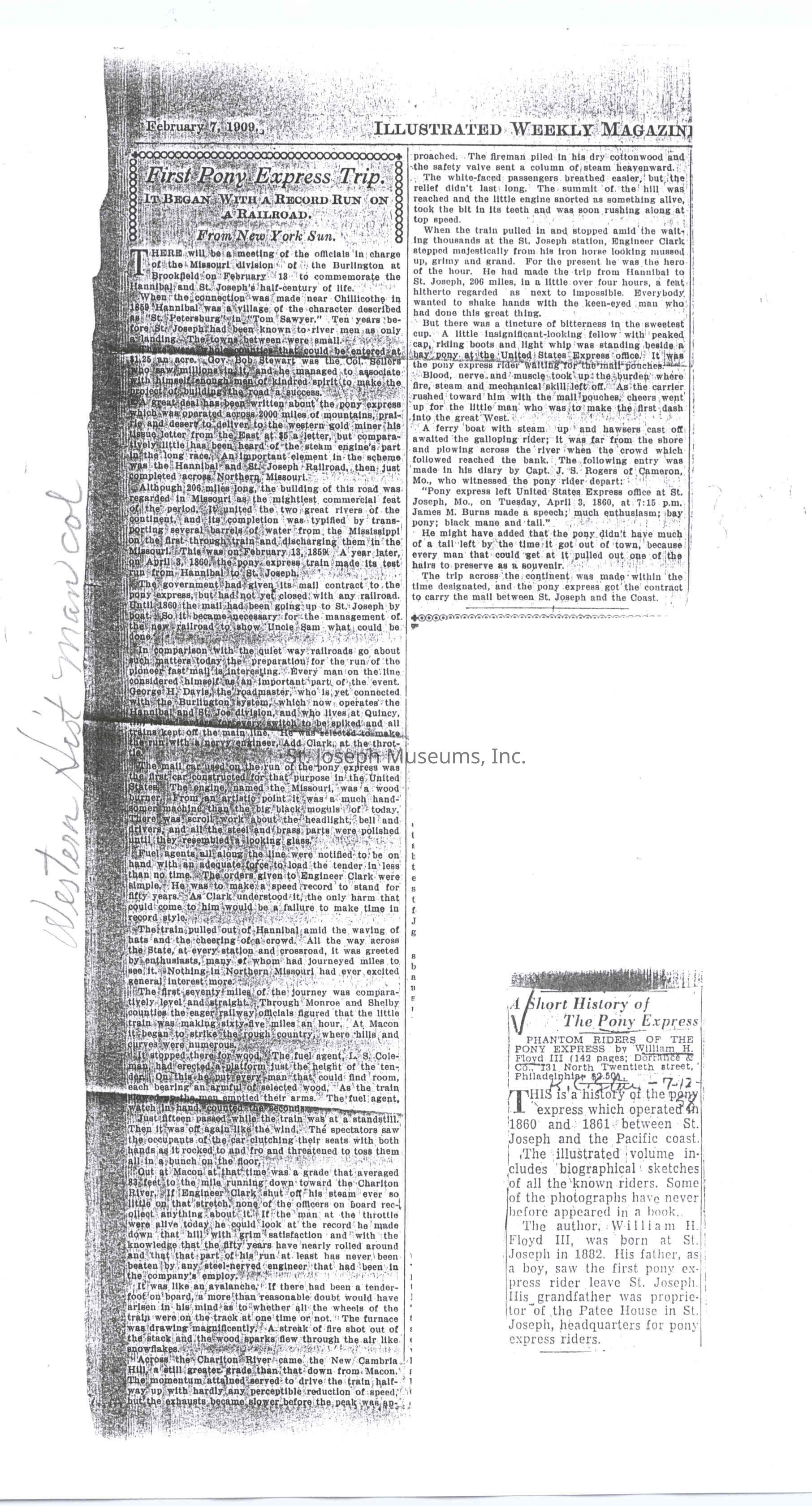 Files contain correspondence with Pony Rider descendants, Pony Express rider biographies, newspaper clippings related to the Pony Express, and miscellaneous records, photos, and documents collected from major private and University libraries among other sources. NOTE ABOUT ORIGIN OF LIBRARIES FILE. Prior to the opening of the renovated Pony Express Museum in 1993, St. Joseph Museum staff did extensive research on the Pony Express. All of the libraries in this folder were visited and copies of all material related to the Pony Express were made. This was done from 1991 to 1993. Information from this research was used in the new exhibits of the Pony Express Museum and in preparation of the book On the Winds of Destiny. In 2015, the file from the Pony Express Museum was added. Jackie Lewin 7/27/15 CD containing scans of actual documents found in Pony Express Research Files located in file cabinets in Document Storage II area.