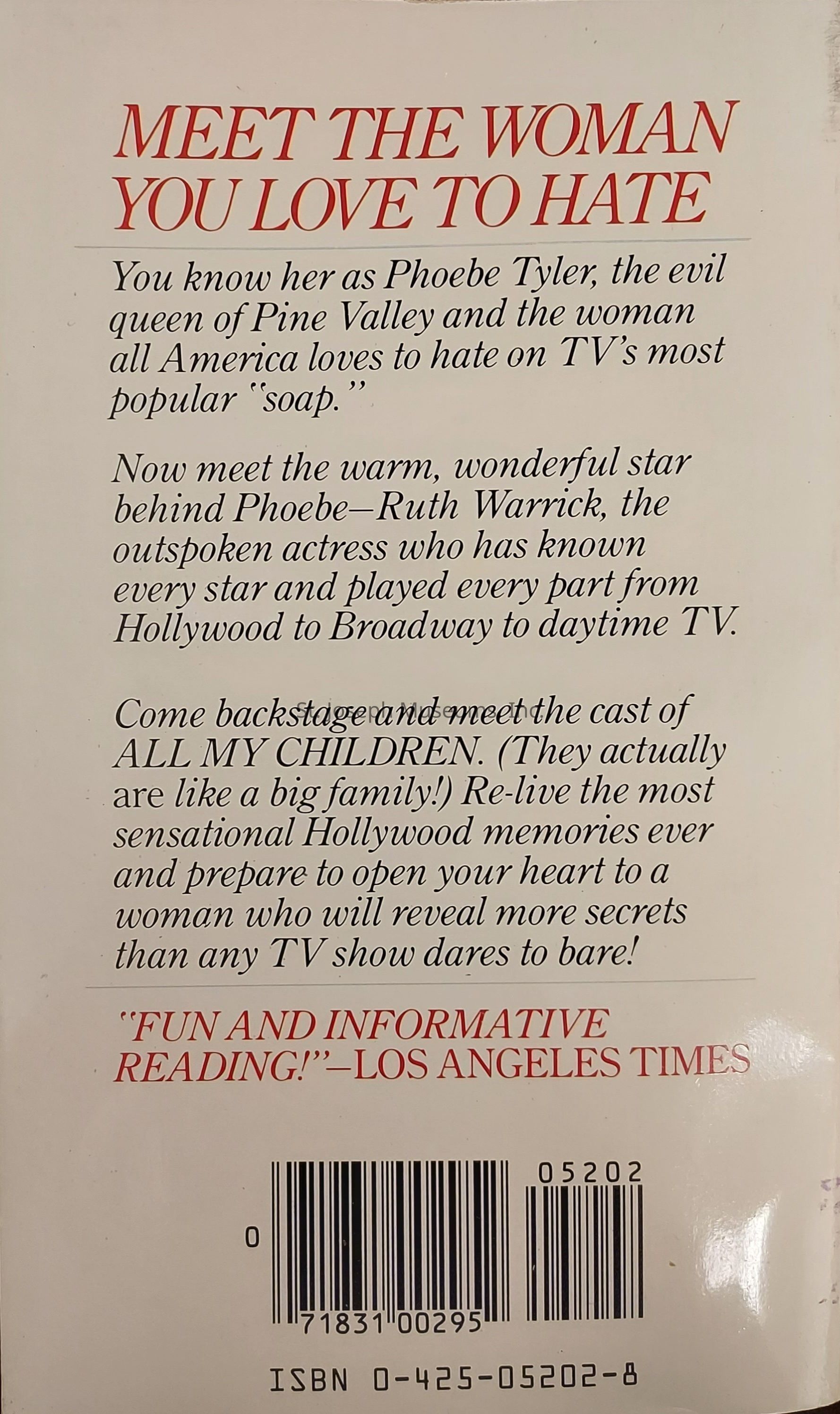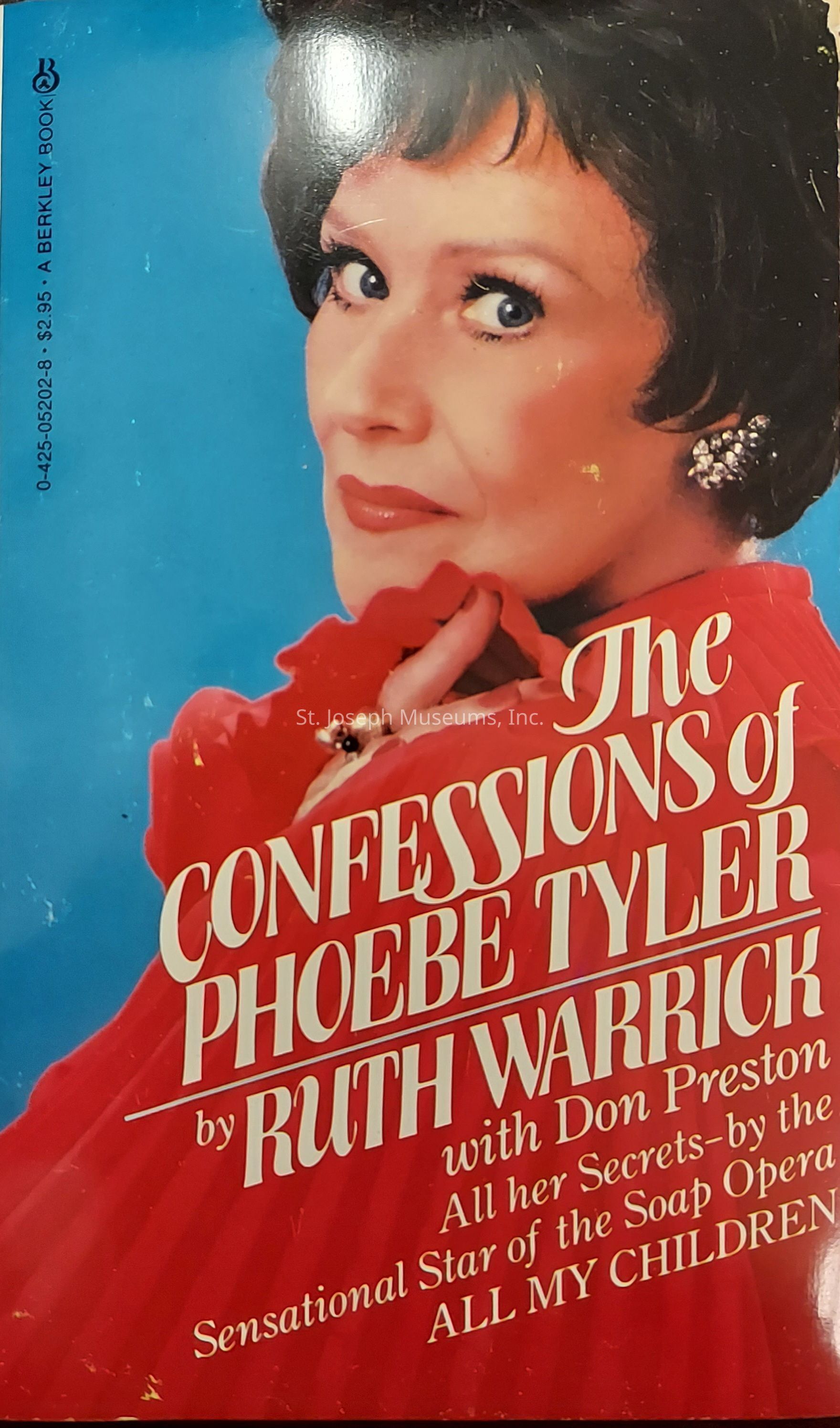 Confessions of Phoebe Tyler is a biography of Ruth Warrick, actress born in St. Joseph in 1916. She died in New York City in 2005. Warrick lived in St. Joseph until her late teens and then pursued her acting career. Appeared in Citizen Kane, Peyton Place TV series and All My Children soap opera. Phoebe Tyler was her soap opera character. Book is about her life and career.Collection