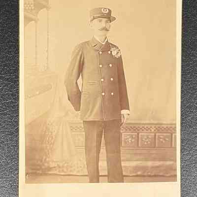 Speake Photography Photo of Fireman, c. 1895. Studio portrait, full-length except for feet, of man in uniform that could be fireman or policeman. The uniform is long double-breasted jacket, with two rows of large brass buttons. The hat is round, flat-topped cap with insignia. He has a mustache and is wearing a flower boutonniere. Unidentified. Sepia, 4¼" x 6½" on cardboard backing.