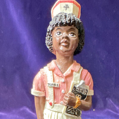 Ceramic figurine of a Black nurse dressed in white and pink, holding a clipboard.