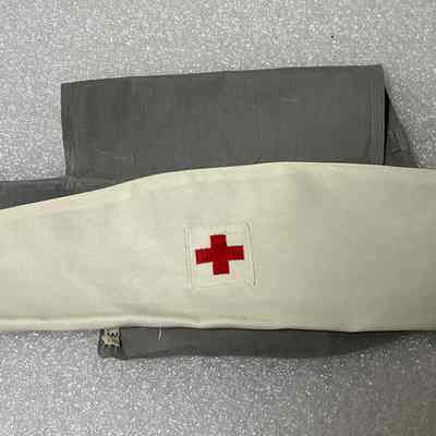 Cap/Gray Lady Uniform/gray and white/patch with red cross stitched on front/two button closure at back/worn by Thelma Burnett Lawson who was a Volunteer at the State Hospital No. 2, where her sister was a patient/aunt of donor/c. 1940