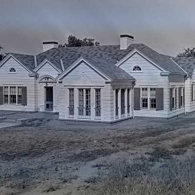 Black-and-white image showcasing the exterior of the McCord home located at 2801 Lovers Lane, St. Joseph, Missouri featuring a charming, single-story white house with a symmetrical design, multiple gabled roofs, and large windows with shutters. The property is surrounded by a natural landscape with trees and open land.
