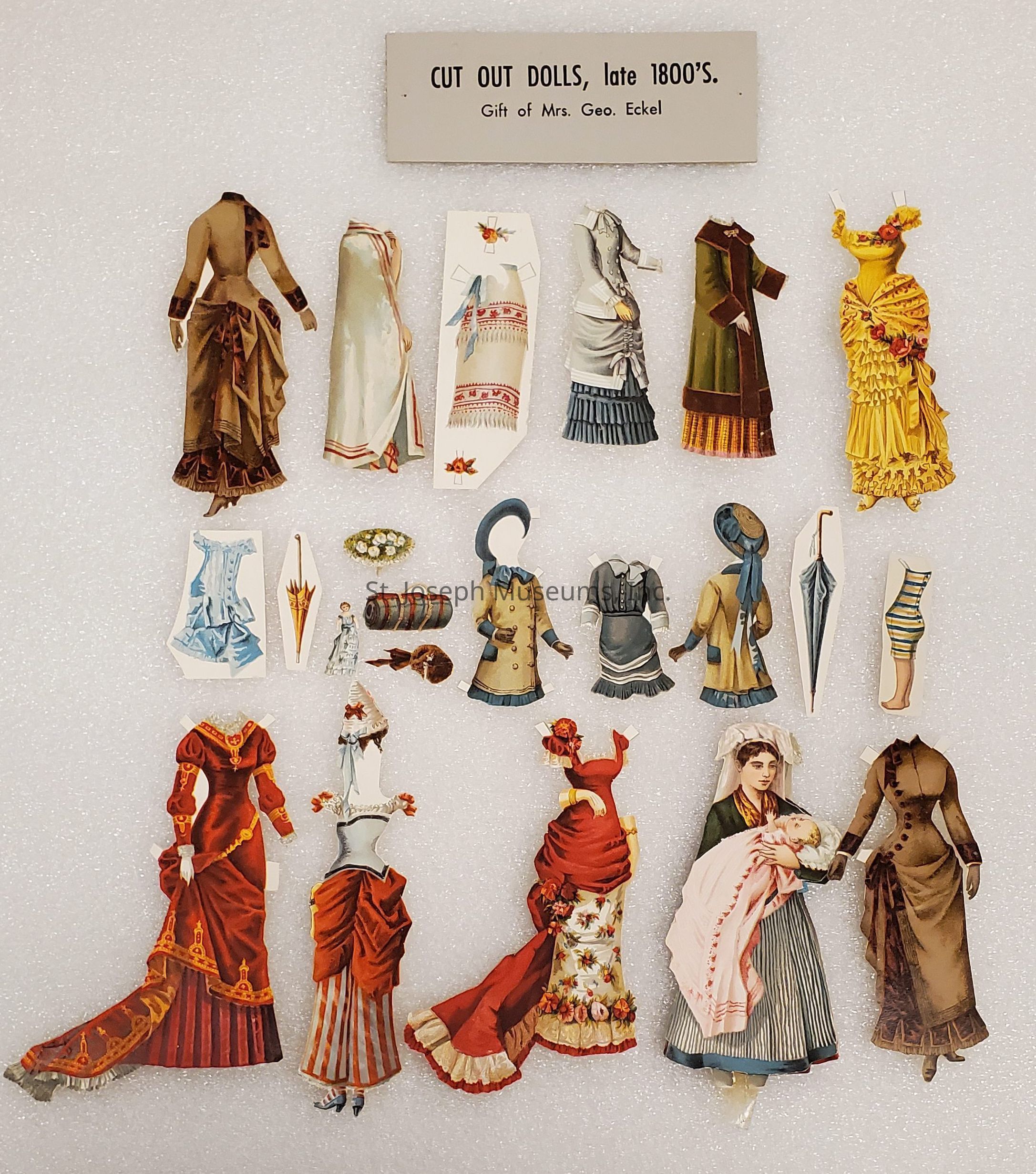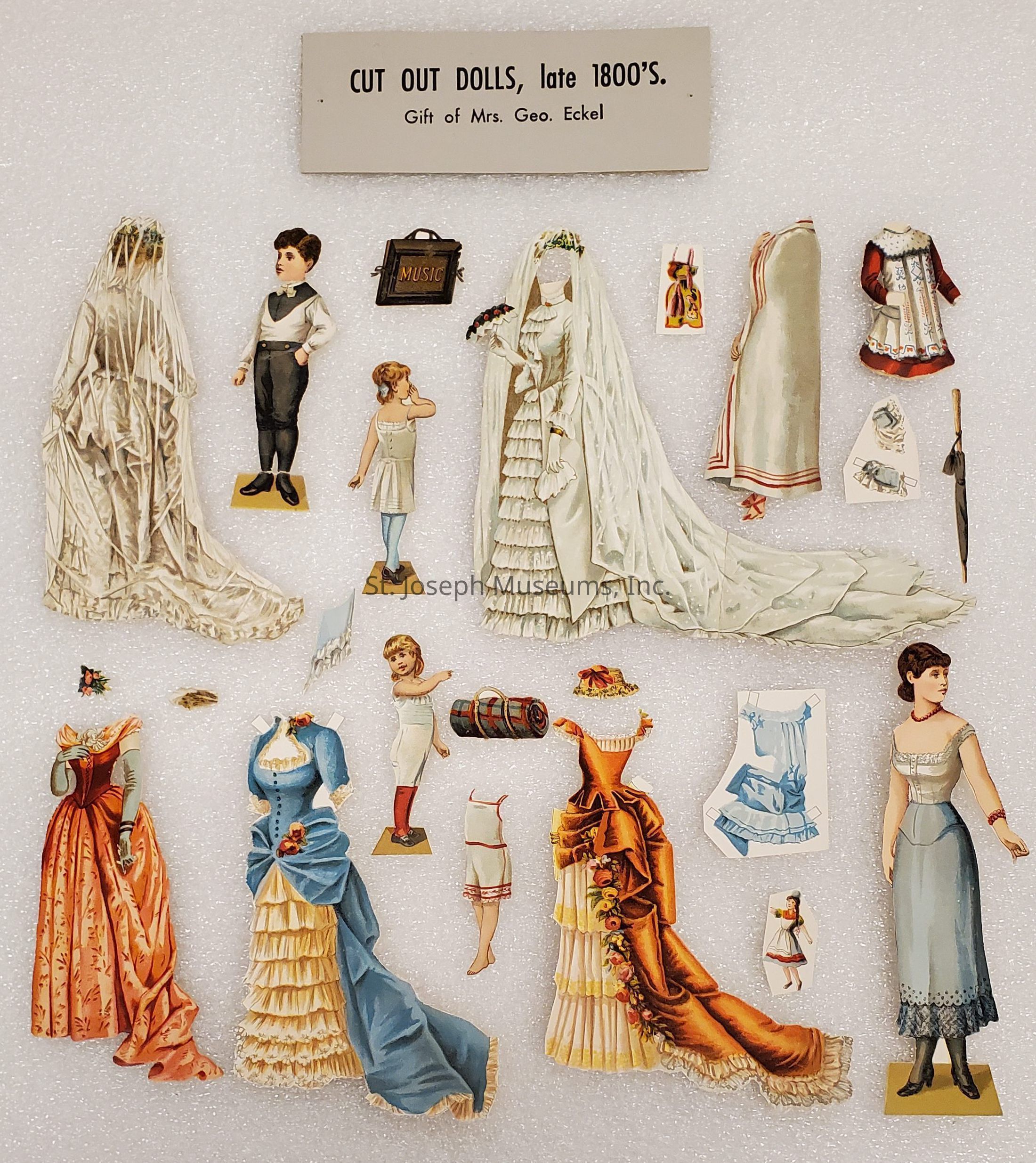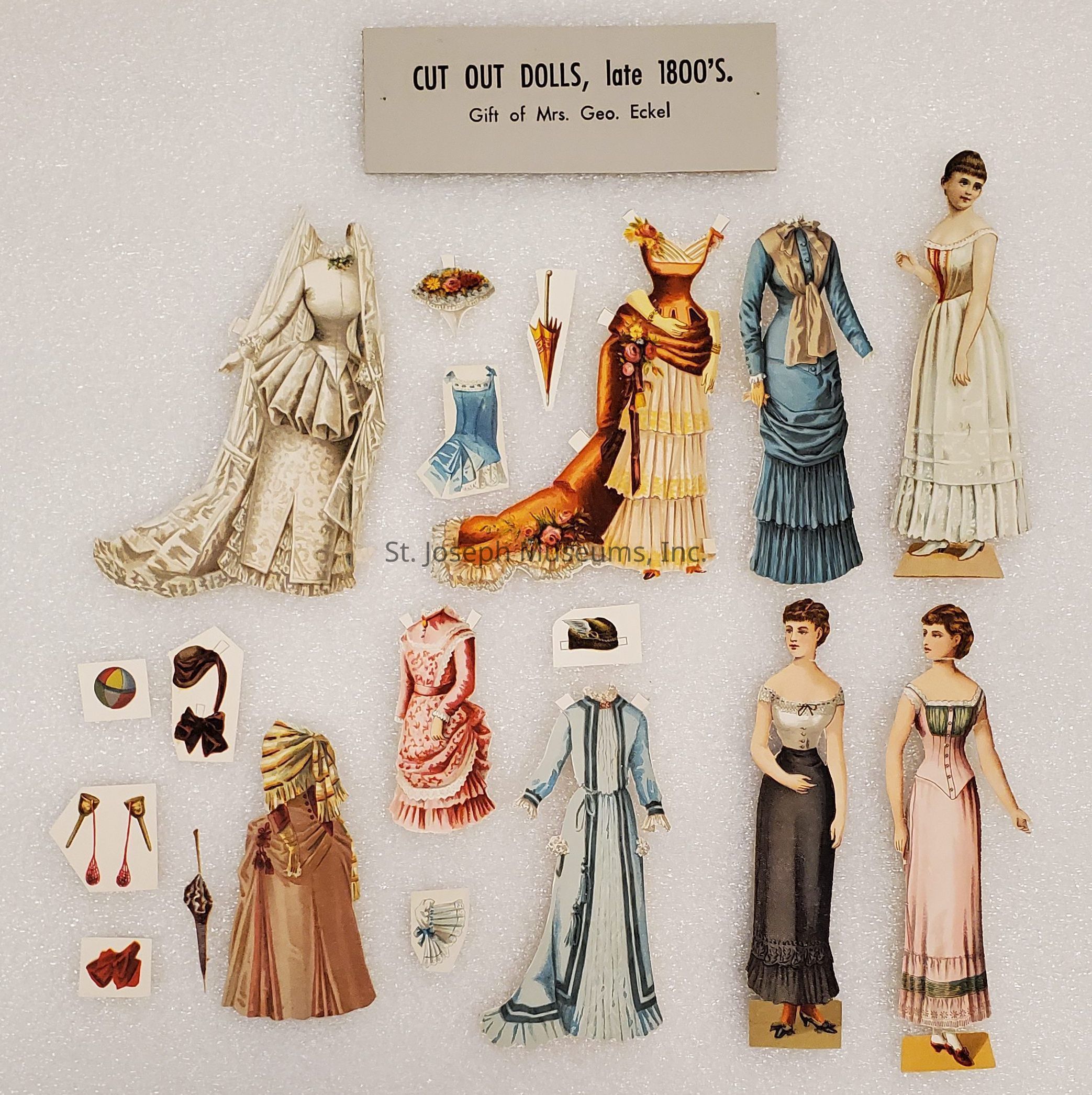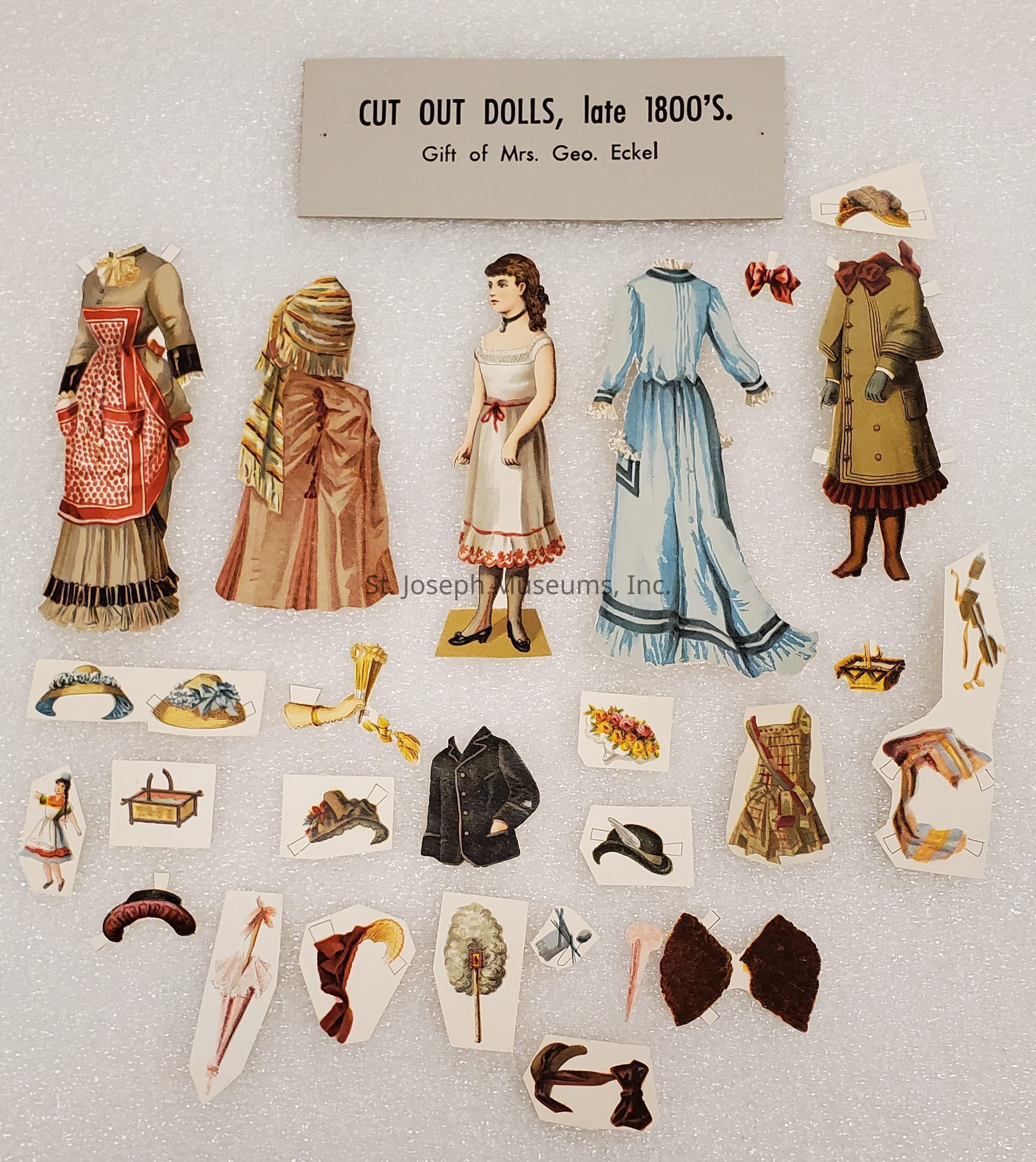 Paper Dolls from Bibi Lacy Eckel Collection, c. 1880s. Numerous paper dolls, both male & female with clothing and accessories. From the collection of Mrs. George Eckel.Lexicon