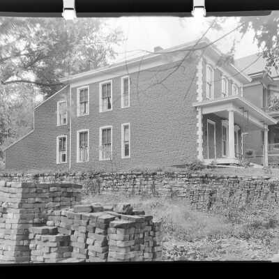 Black-and-white image showcasing a two-story brick house in St. Joseph, Missouri.