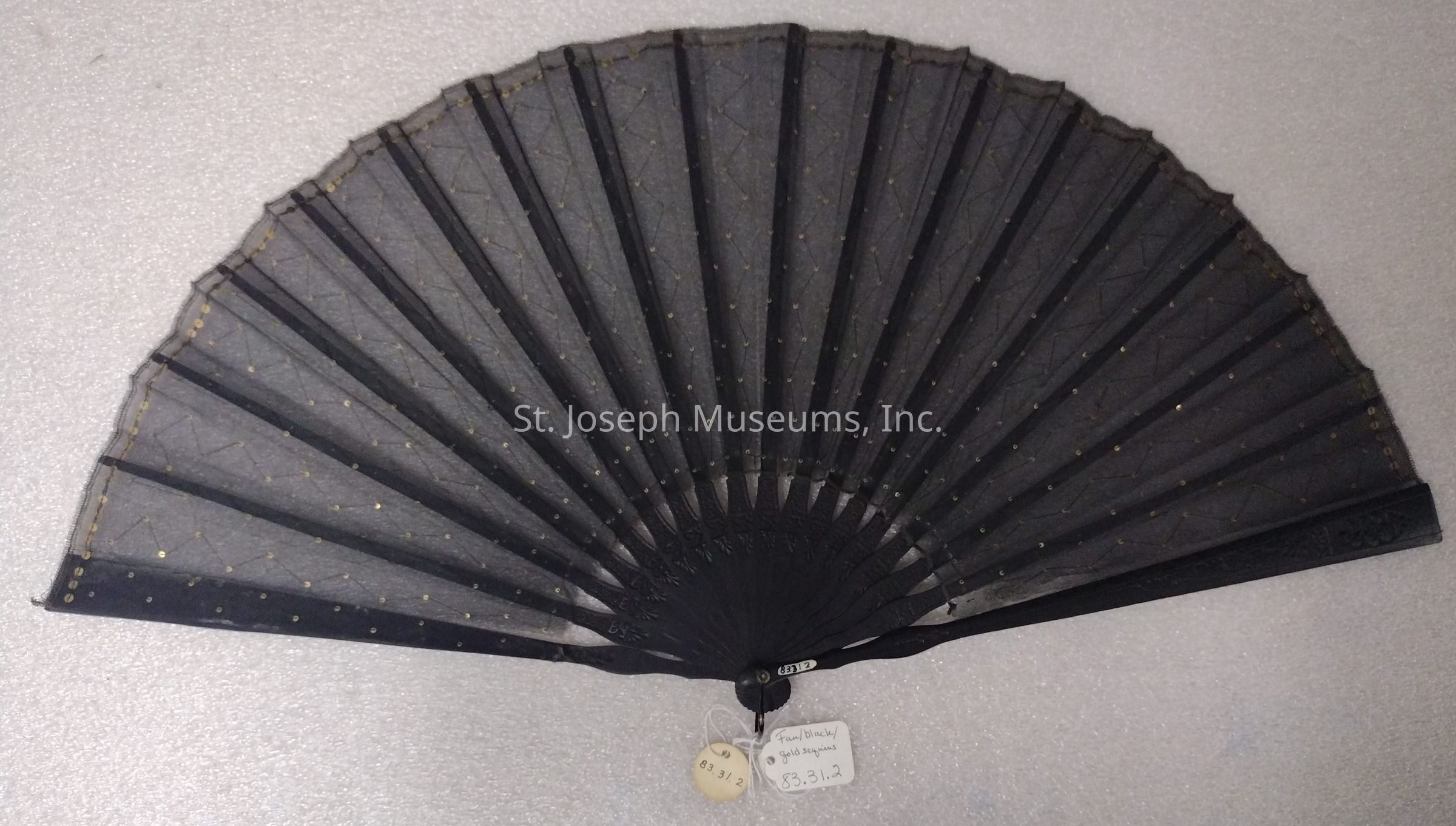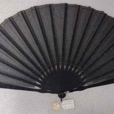 FOLDING TYPE/CARVED STICKS/BLACK WITH GOLD COLORED SEQUINS SEWN IN GEOMETRIC DESIGN.