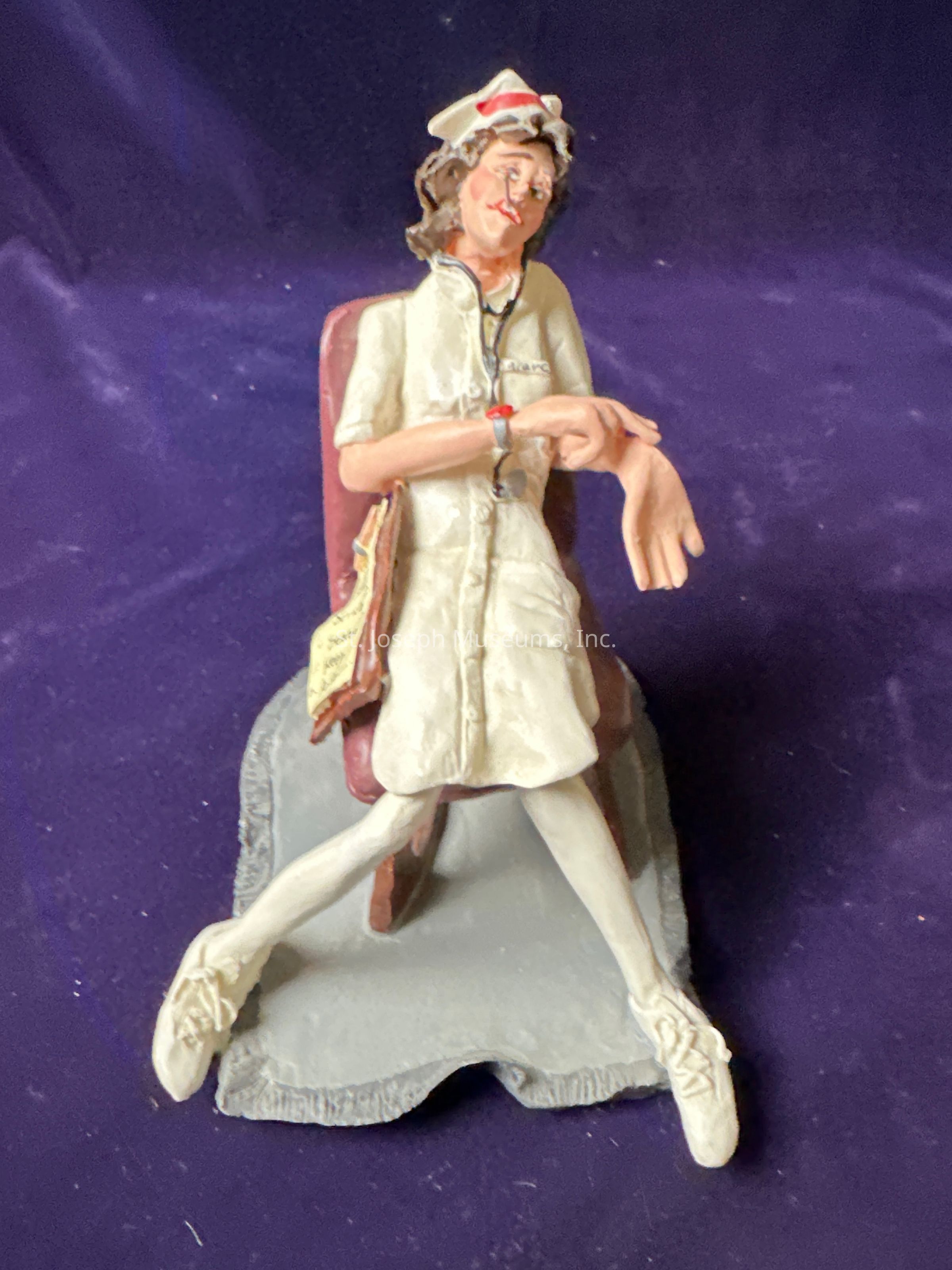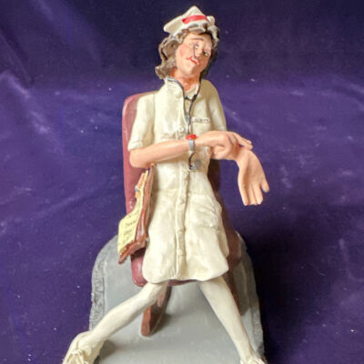 Ceramic figurine of a tired nurse in white in a chair checking her own vitals, with a check list stating:
