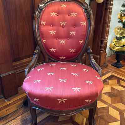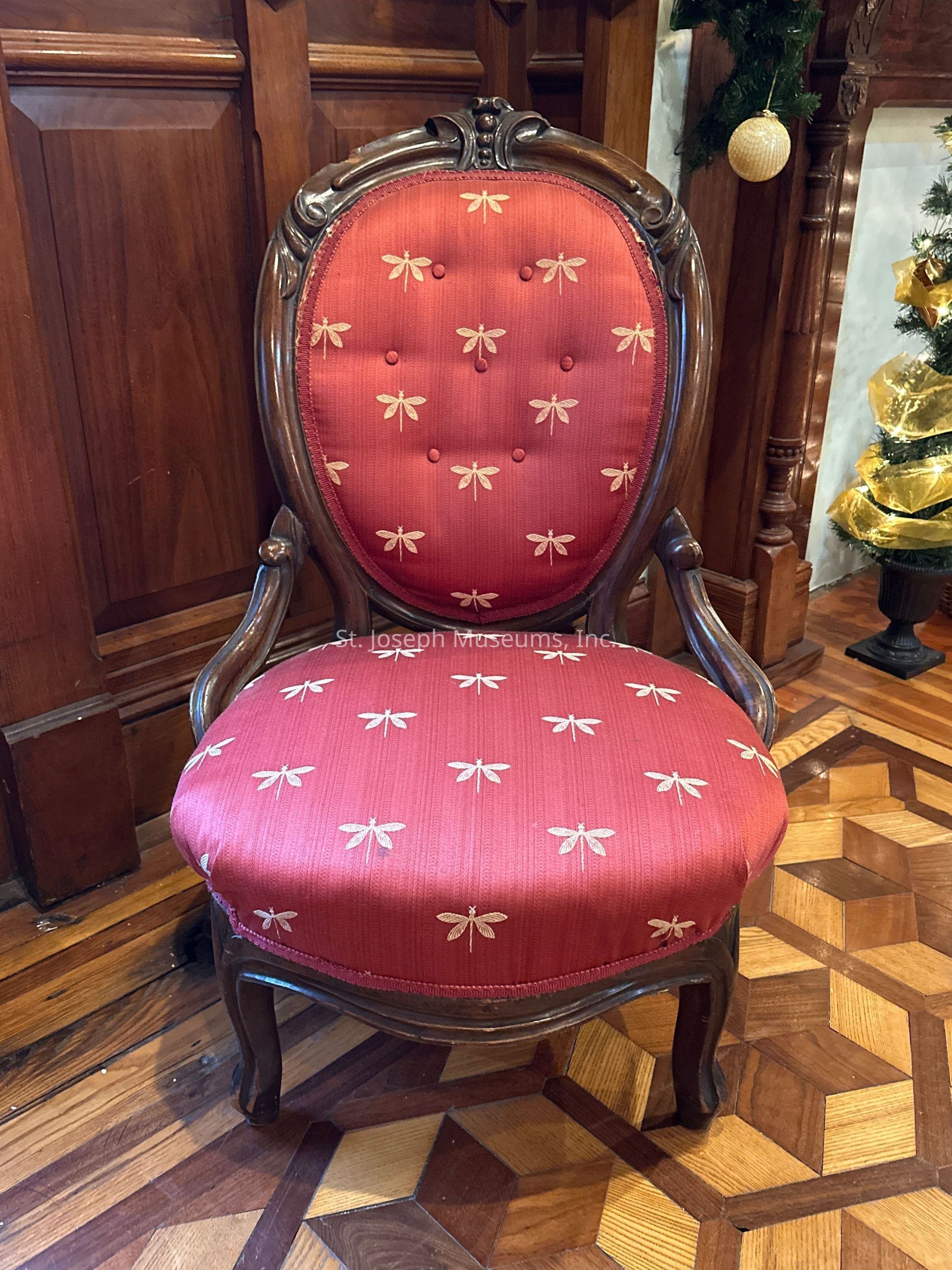 Red Victorian backed parlor chair with dark wood frame and golden dragonfly pattern.Context
