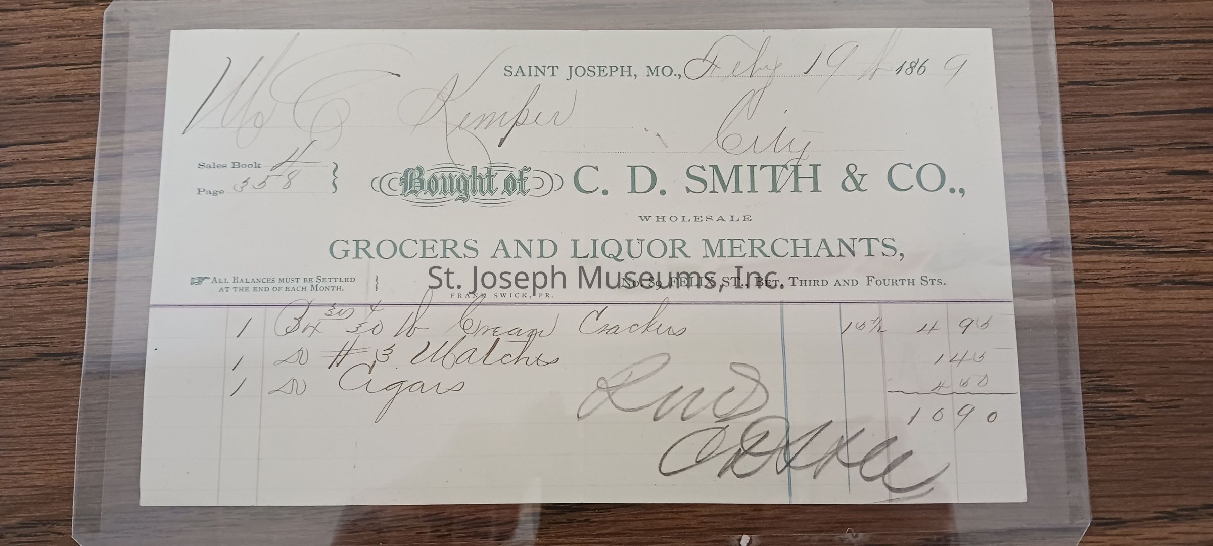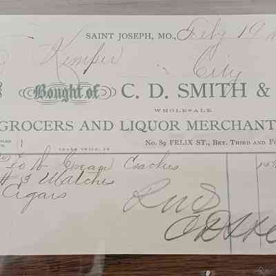 Receipt for Charles Kemper from C.D. Smith & Co. Grocer & Liquor Merchants - 89 Felix between 3rd & 4th, St. Joseph, MO. 02/19/1869Lexicon