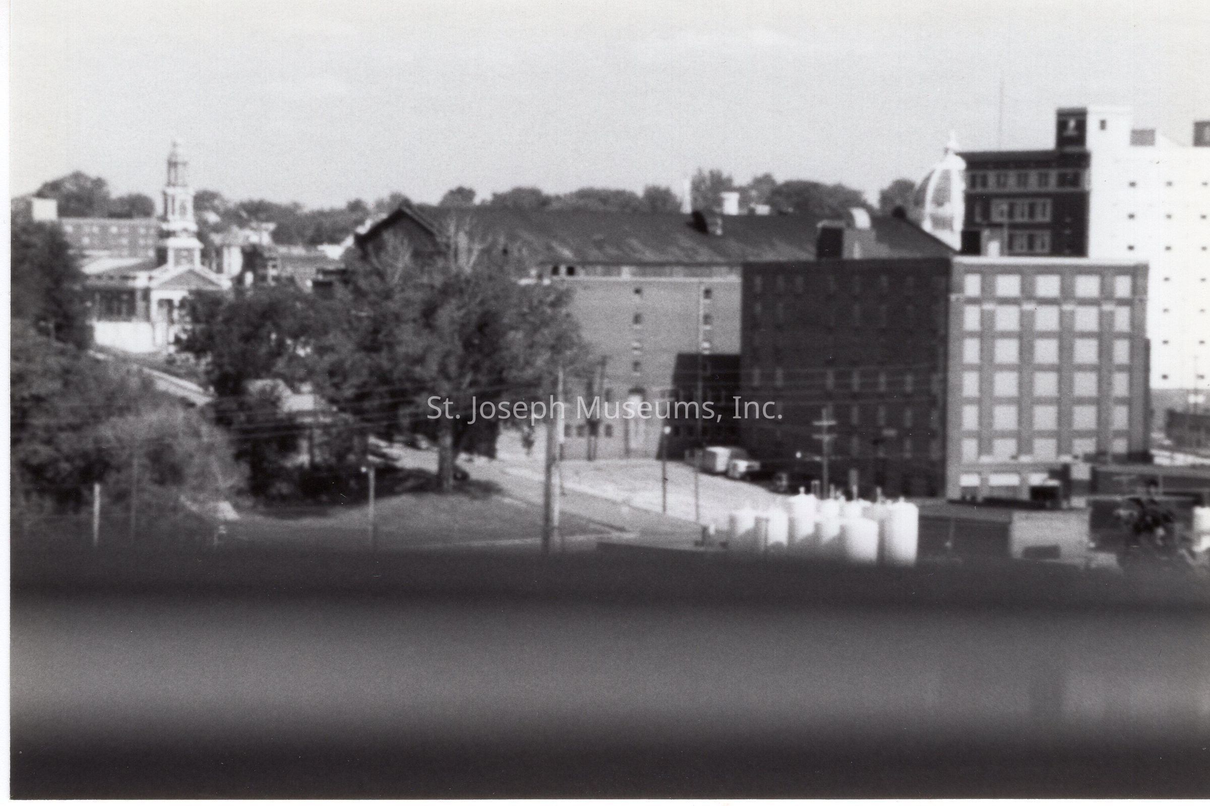 City Auditorium, 4th & Jules, Snapshots (8), 1985. b/w. Seven views of the City Auditorium as it stood in 1985 before it was demolished after the erection of a new Civic Arena a few blocks south of this structure. Shows the 3-story brick auditorium that occupied the entire block from various angles as below. Also one view of the downtown area as seen from the site of the Auditorium.