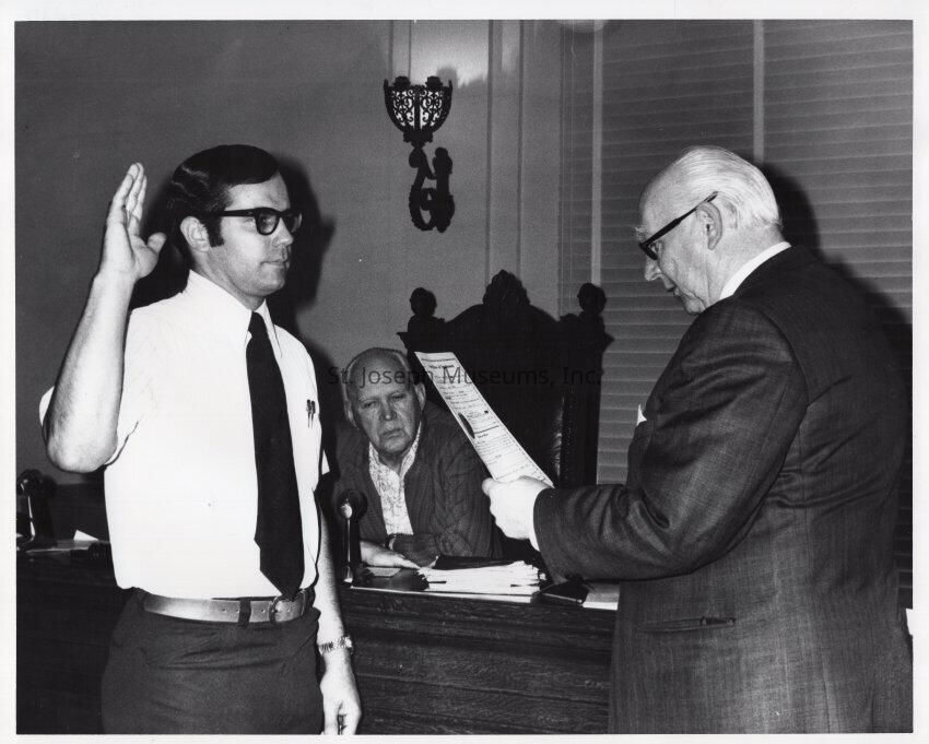 City Council Member, Bob Walrop, Taking Oath of Office, 1973. b/w. Walter Welsh administering oath of office to Walrop, in shirt/tie, in Council Chambers. Jim Sollars at desk behind. dated on back: "Aug. 14, 1973".Made/Created