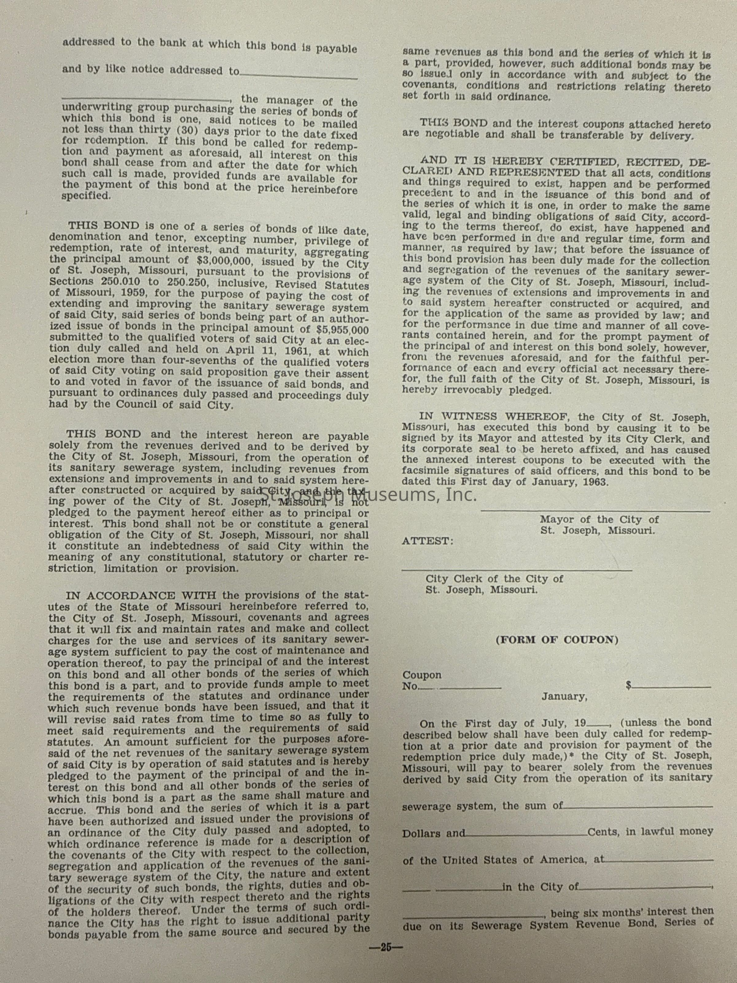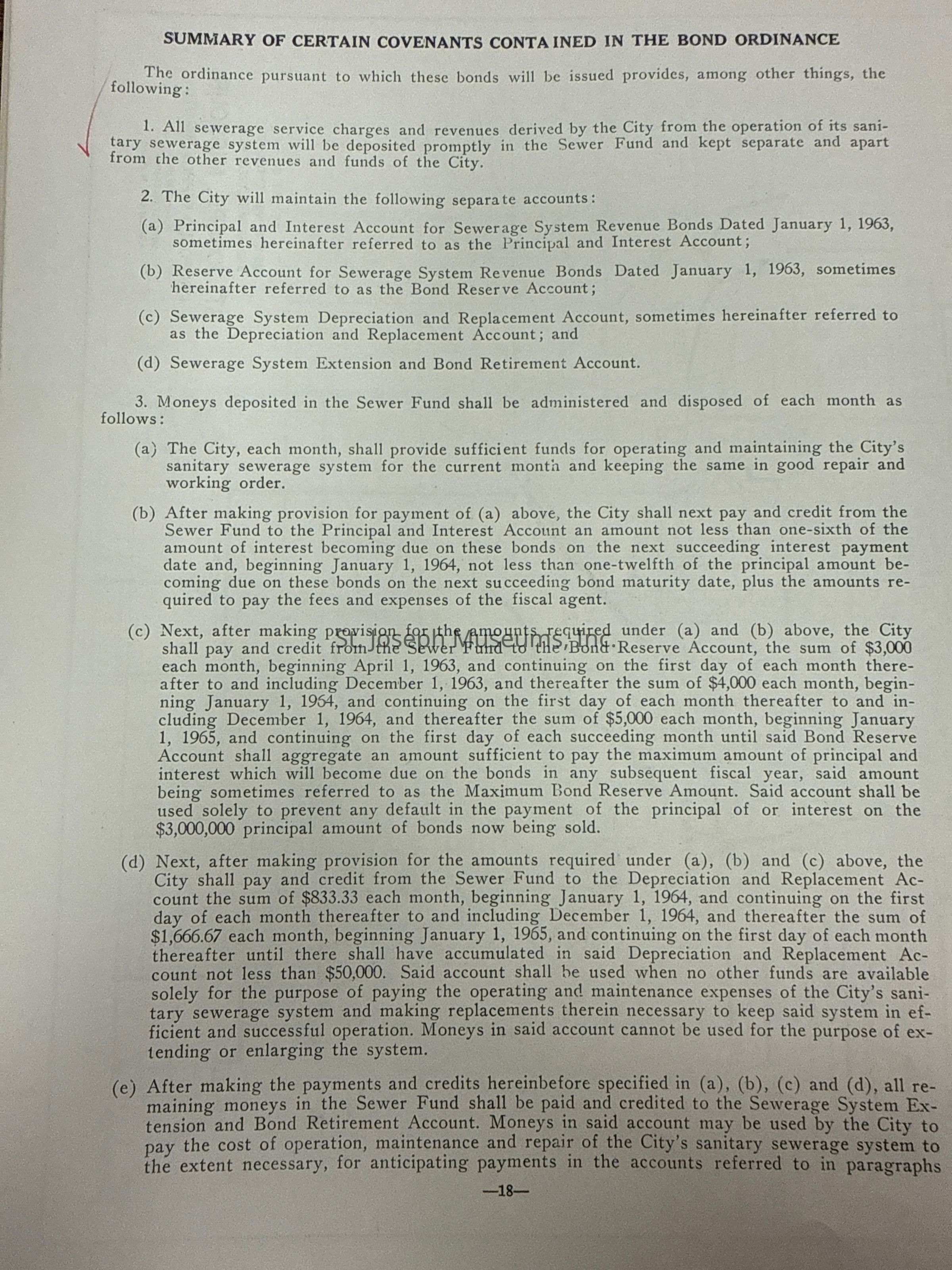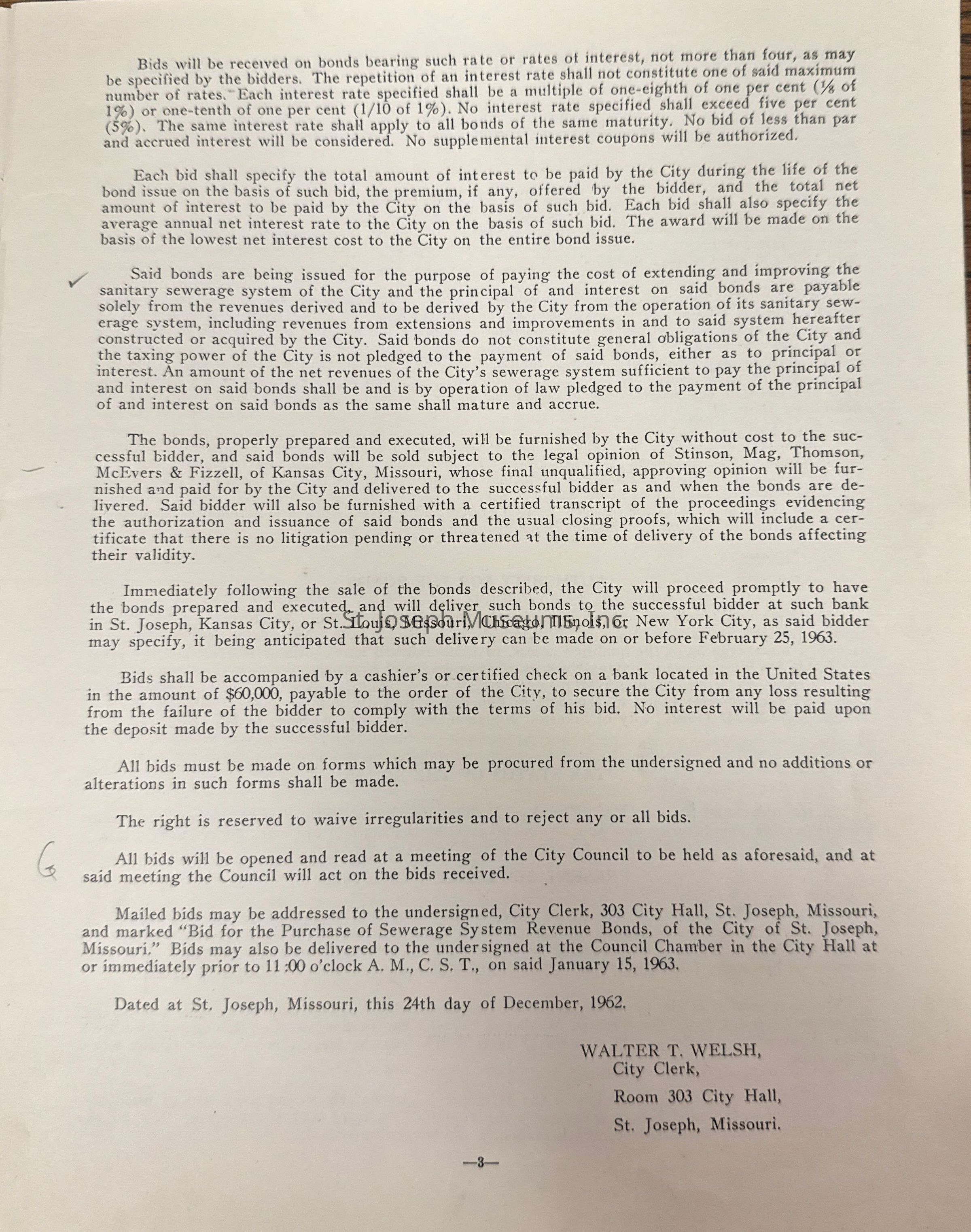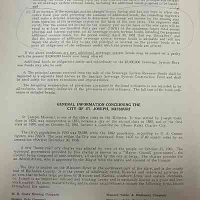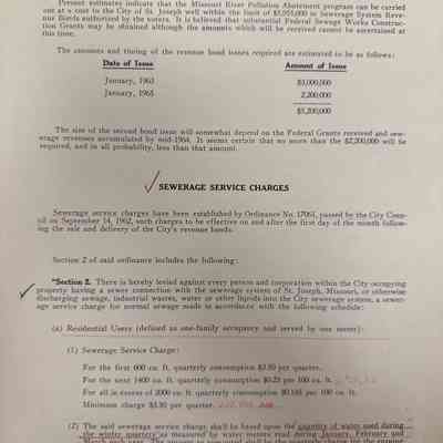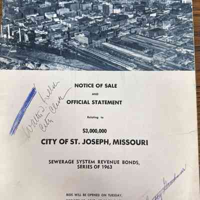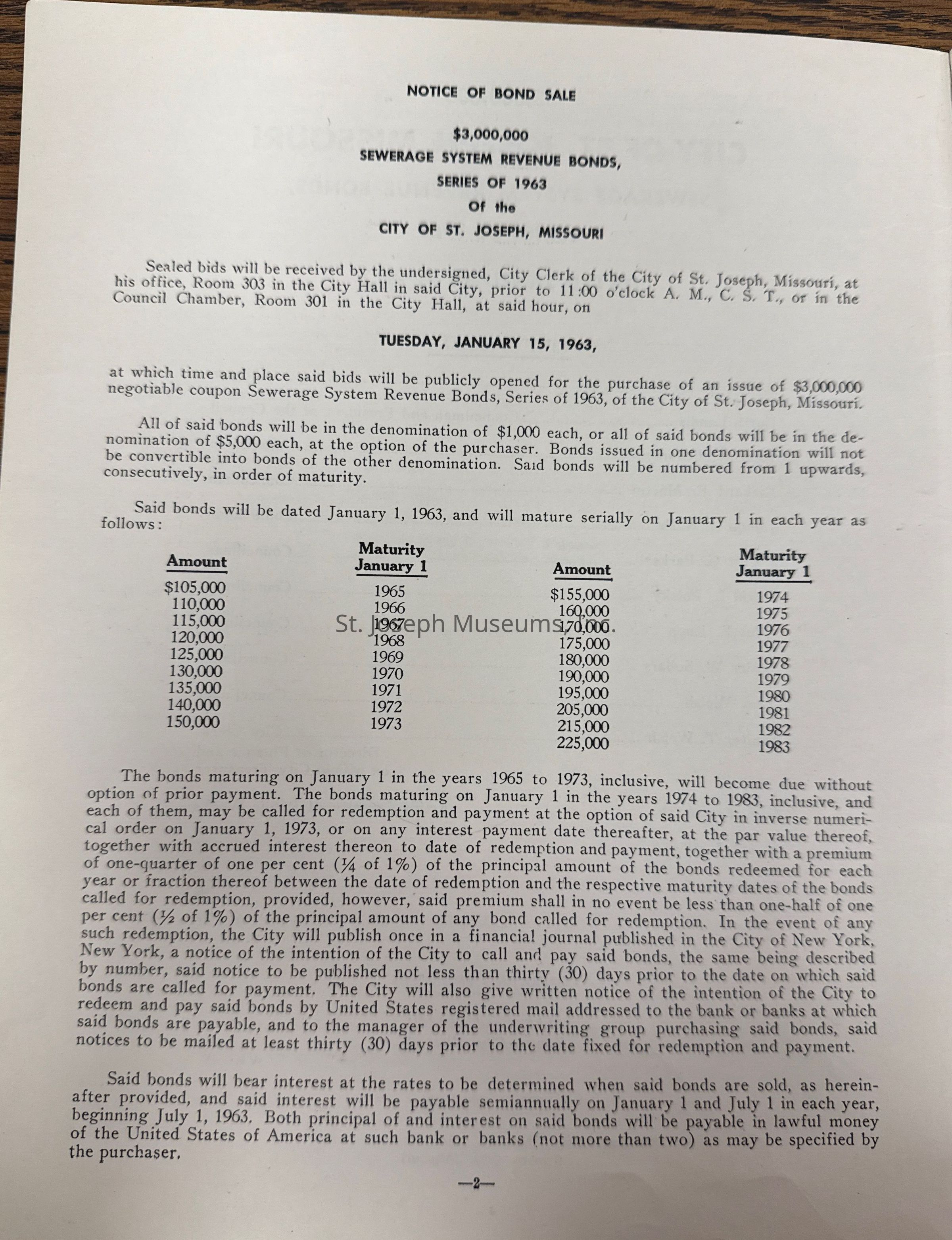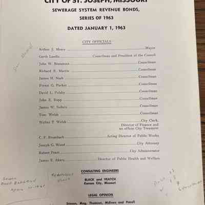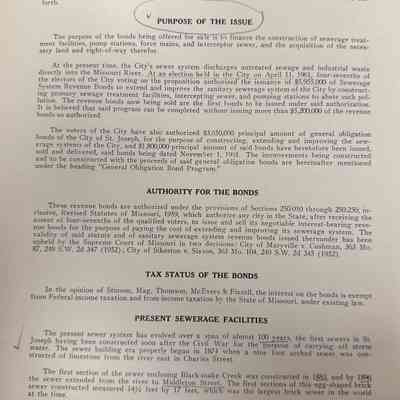 City of St. Joseph, Notice of Sale of Sewage Bonds, 1963. Booklet "Notice of Sale and Official Statement Relating to $3,000,000 City of St. Joseph, Missouri Sewage System Revenue Bonds, Series of 1963" Bids opened January 15, 1963. 31 pages. Handwritten notes throughout.