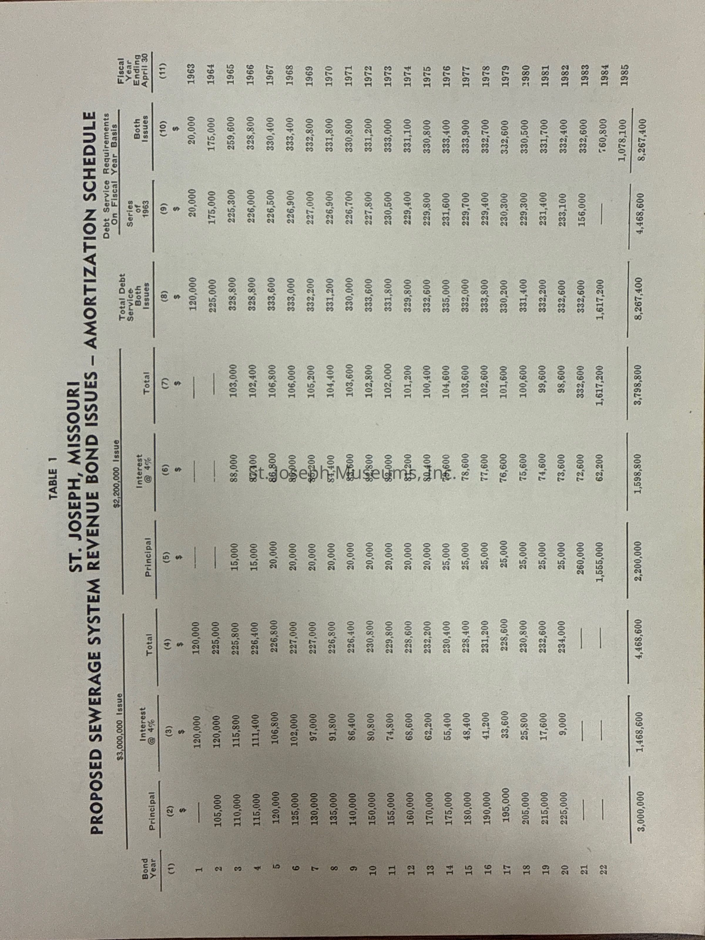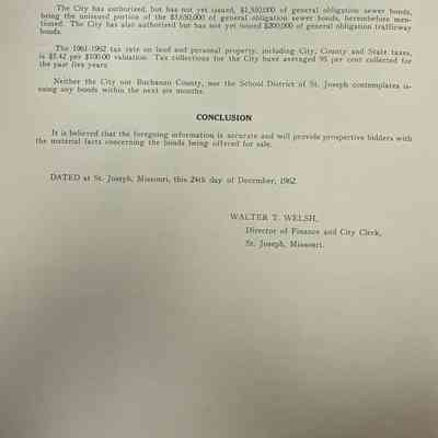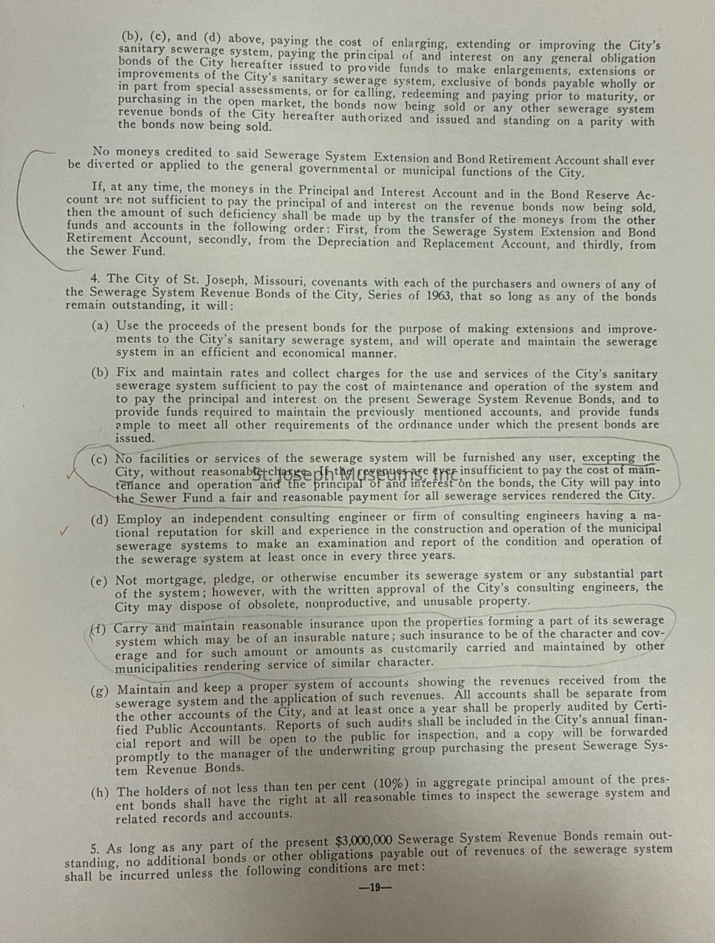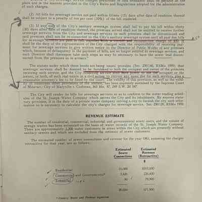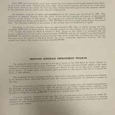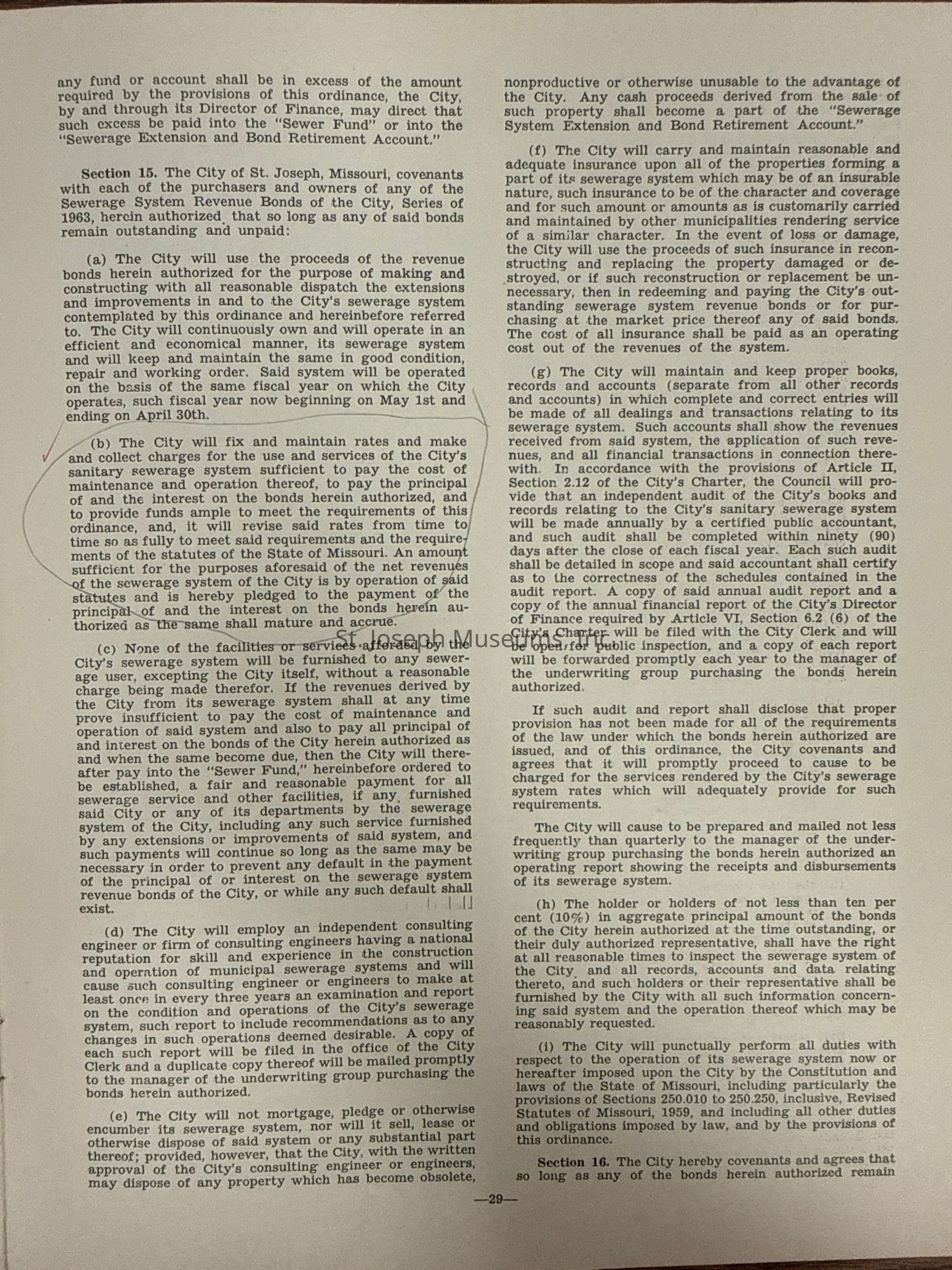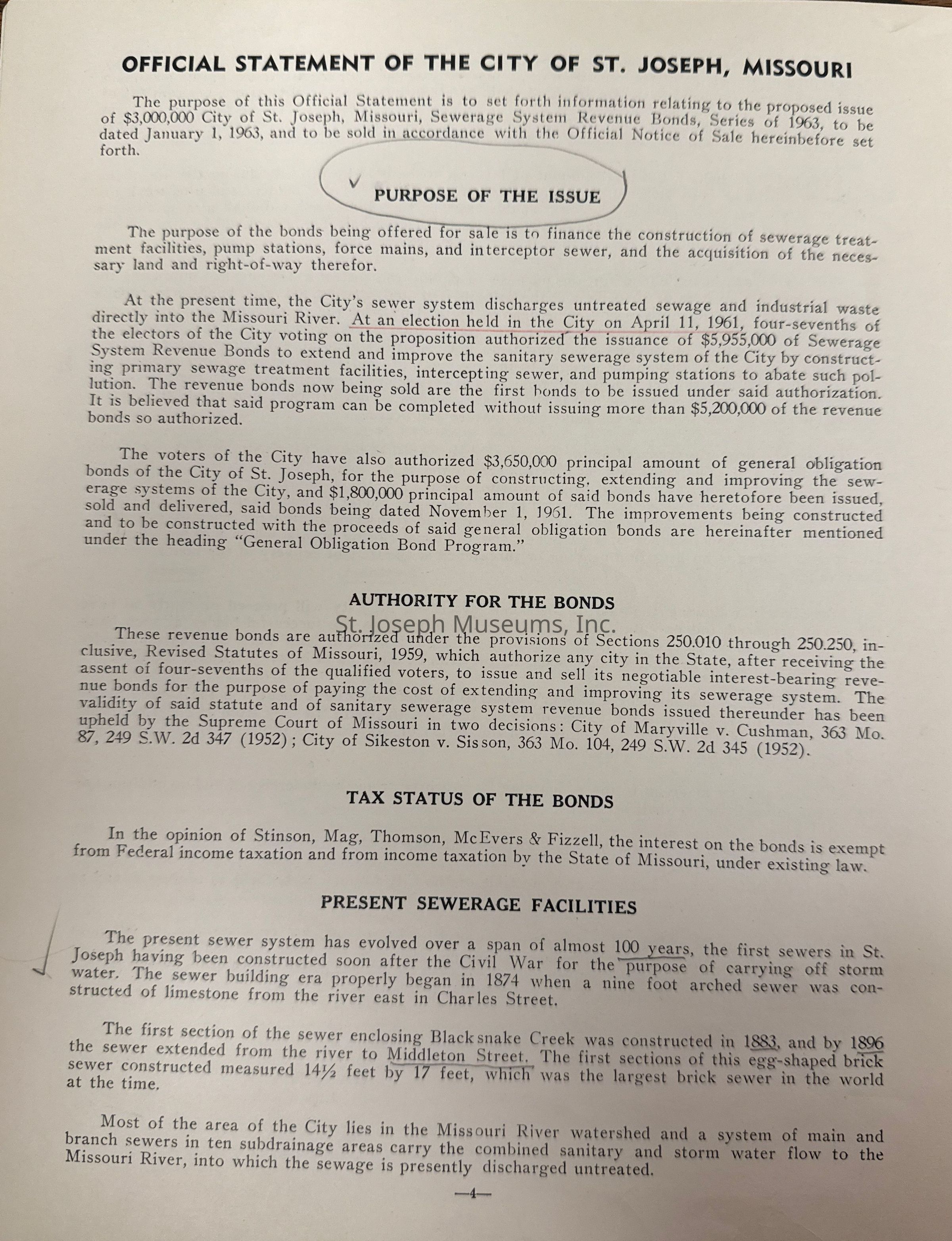 City of St. Joseph, Notice of Sale of Sewage Bonds, 1963. Booklet "Notice of Sale and Official Statement Relating to $3,000,000 City of St. Joseph, Missouri Sewage System Revenue Bonds, Series of 1963" Bids opened January 15, 1963. 31 pages. Handwritten notes throughout.
