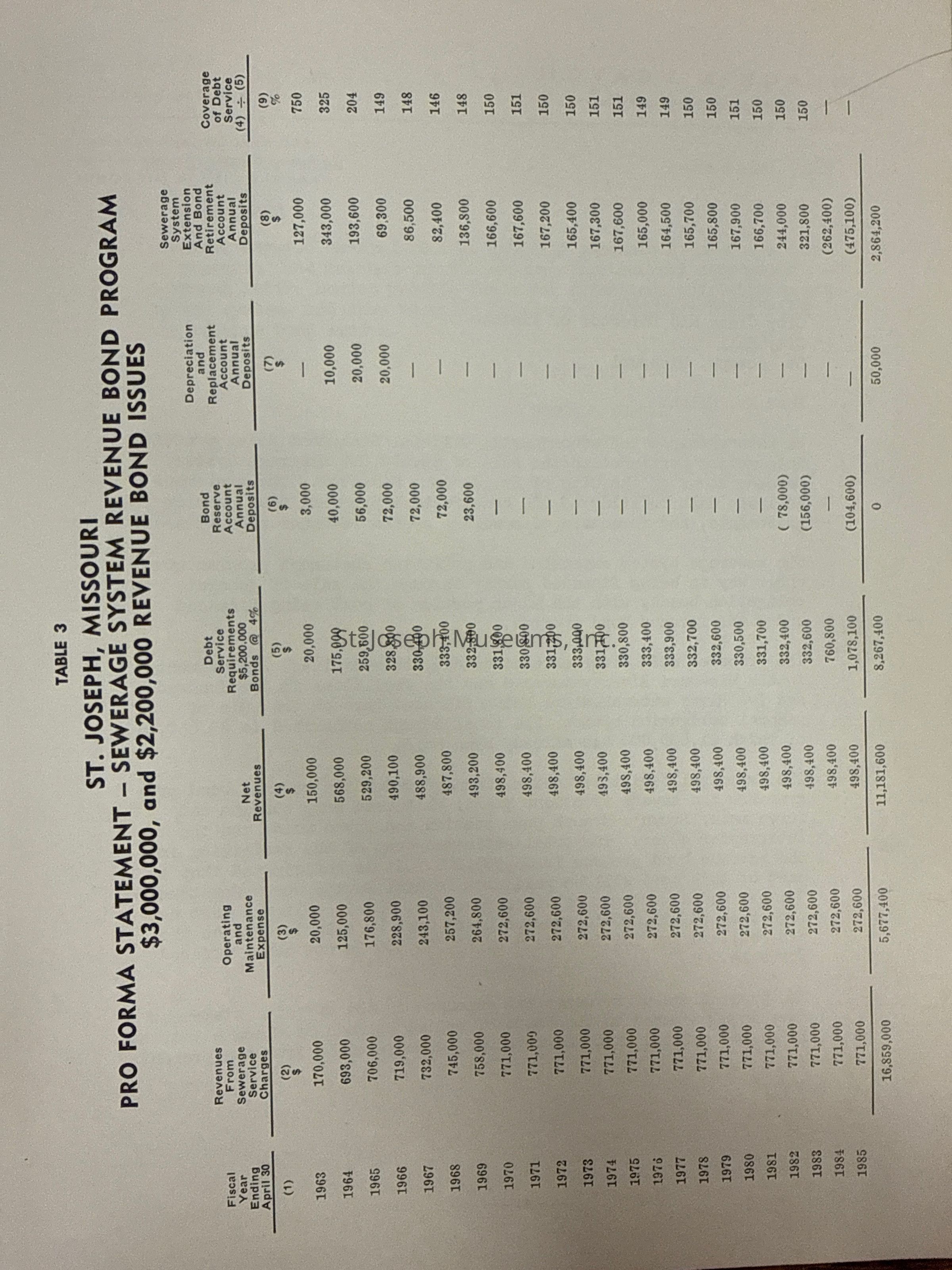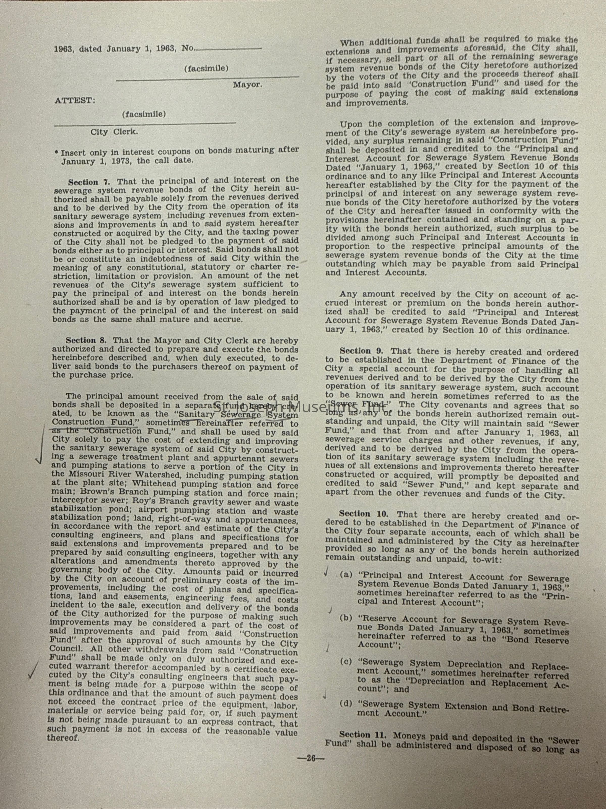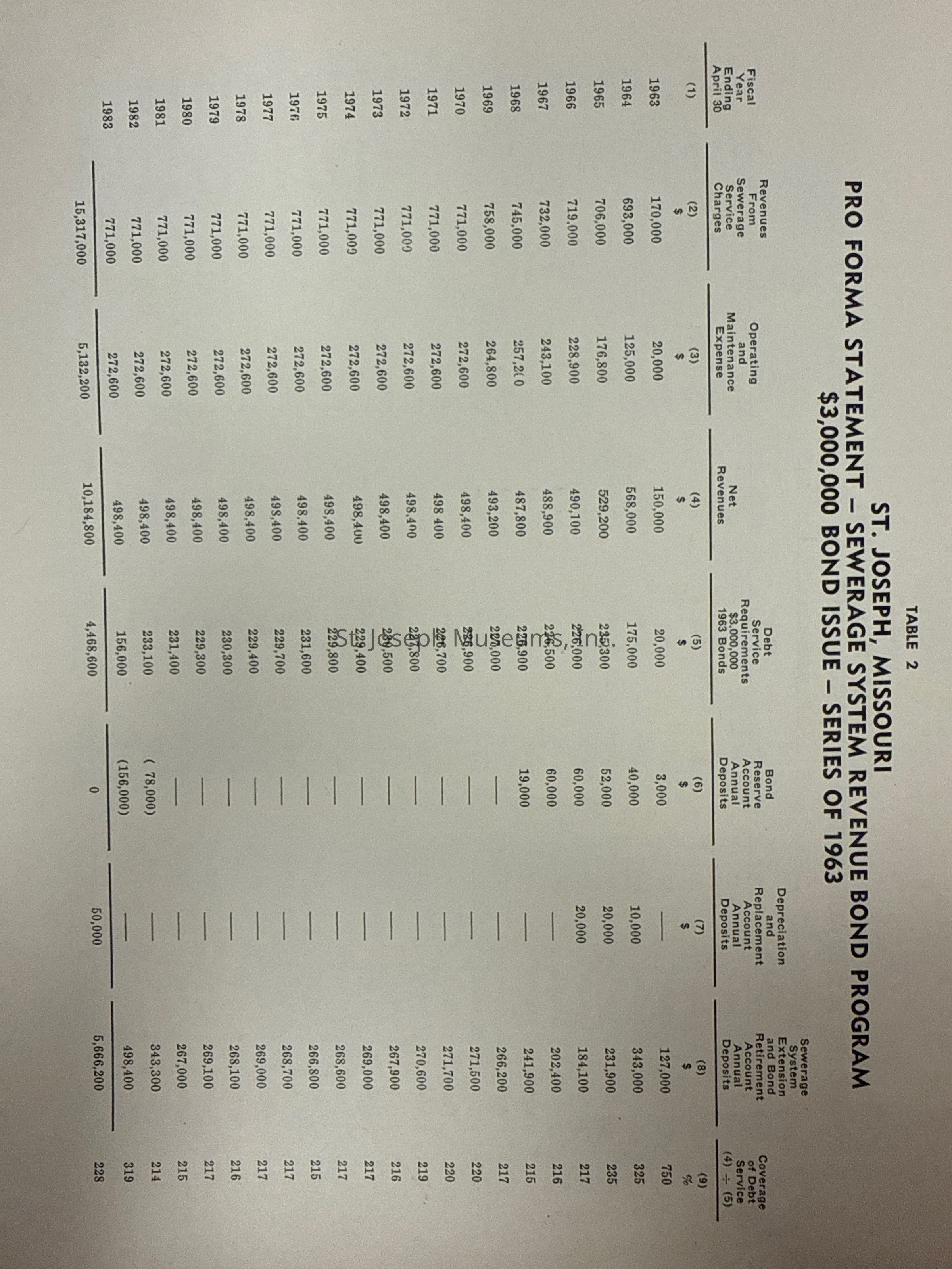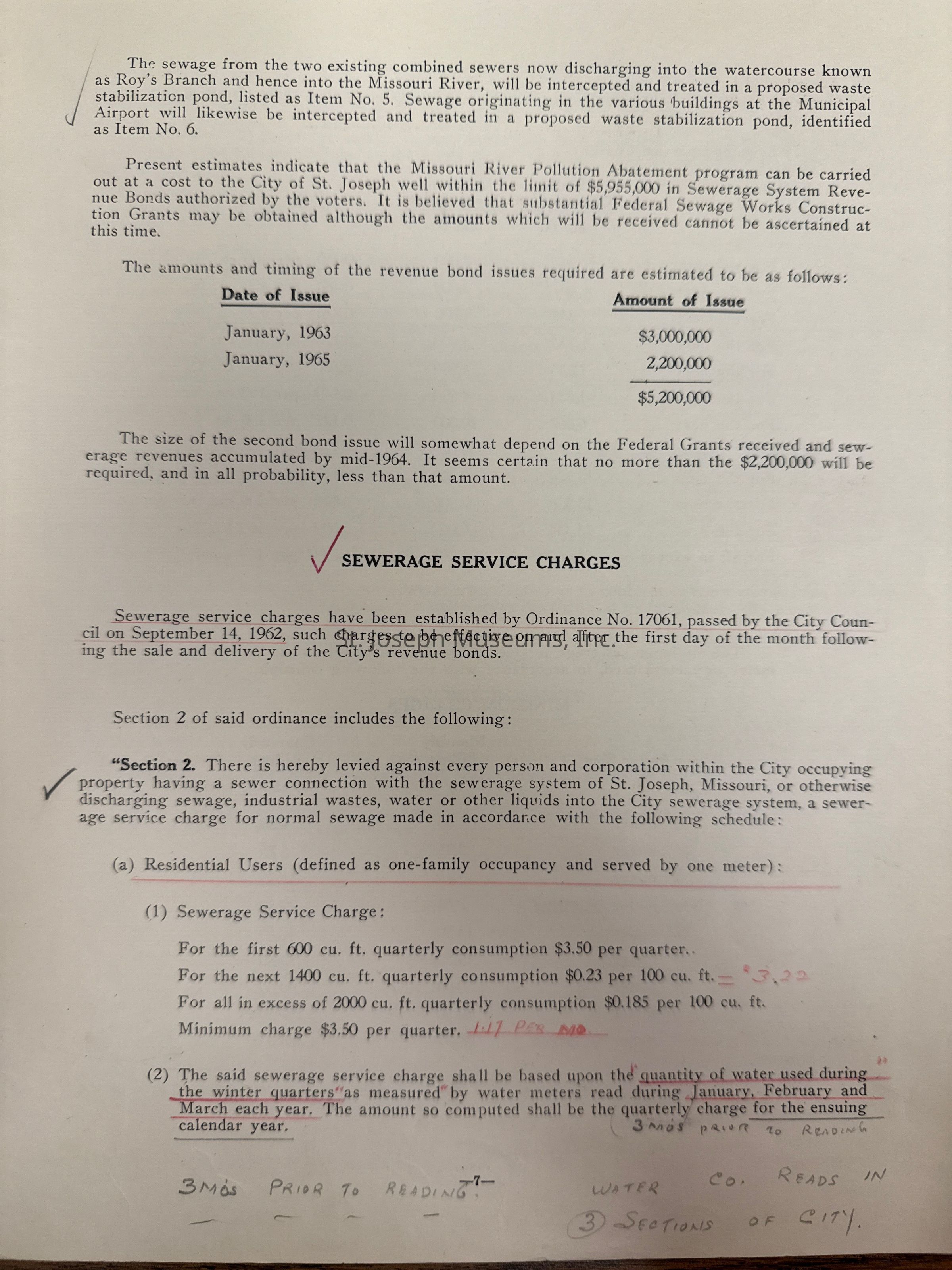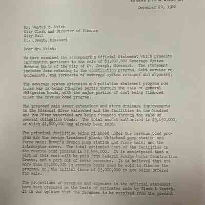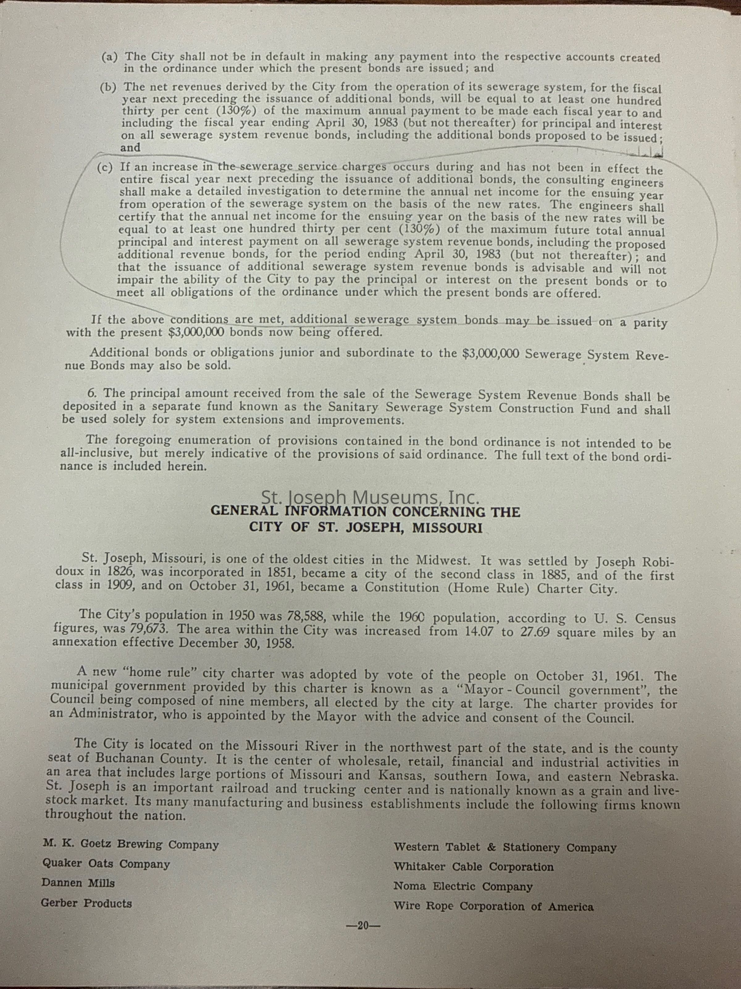 City of St. Joseph, Notice of Sale of Sewage Bonds, 1963. Booklet "Notice of Sale and Official Statement Relating to $3,000,000 City of St. Joseph, Missouri Sewage System Revenue Bonds, Series of 1963" Bids opened January 15, 1963. 31 pages. Handwritten notes throughout.