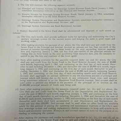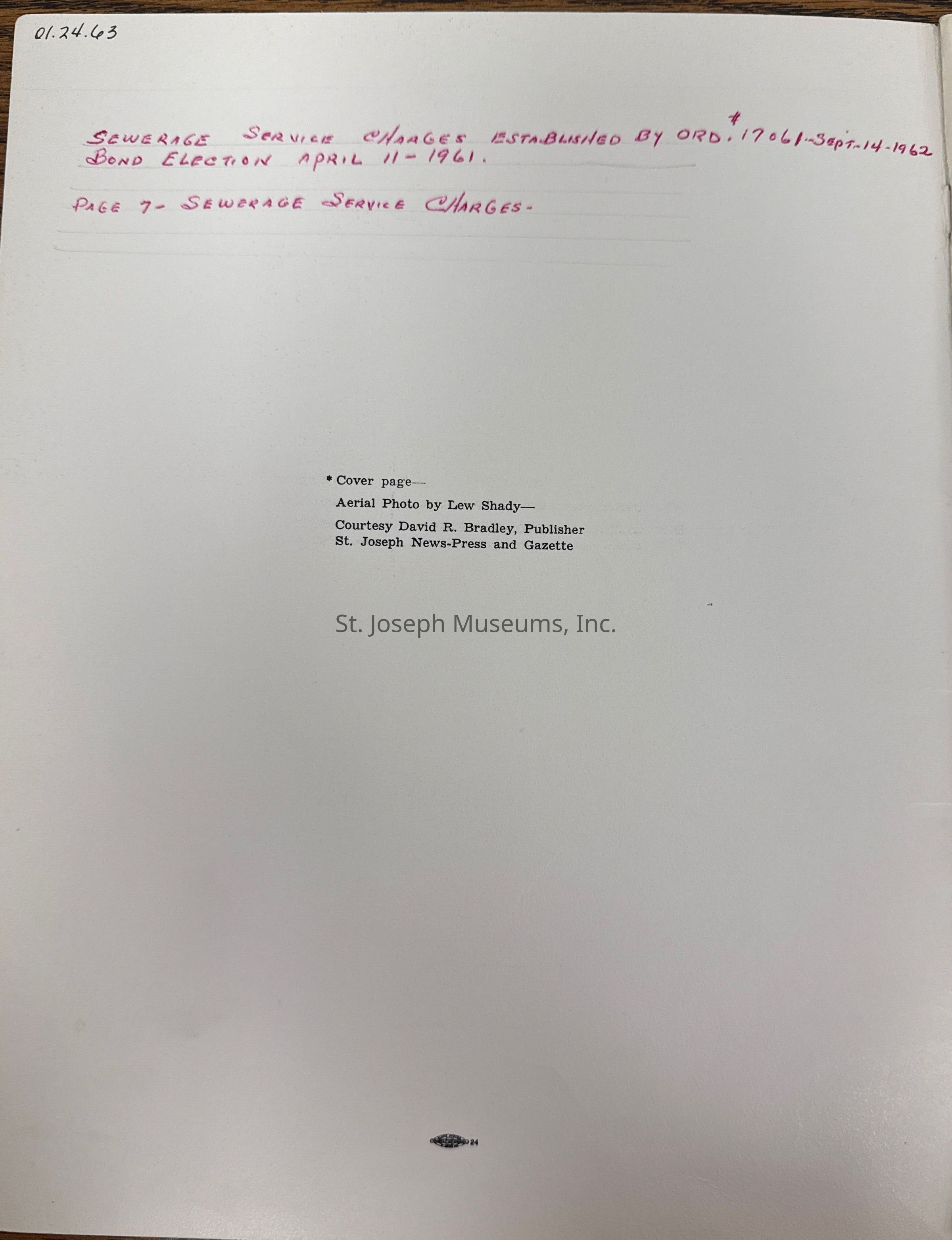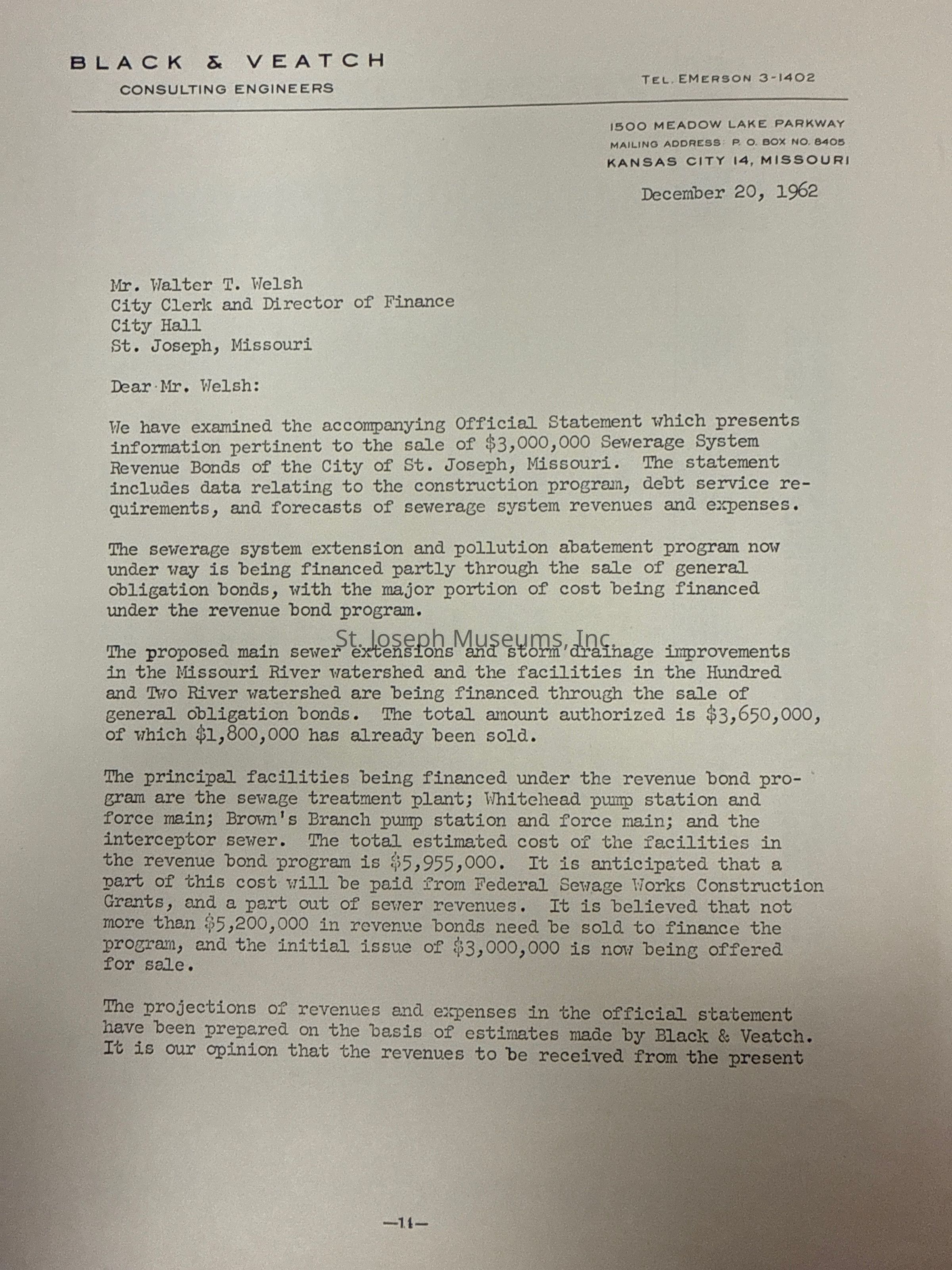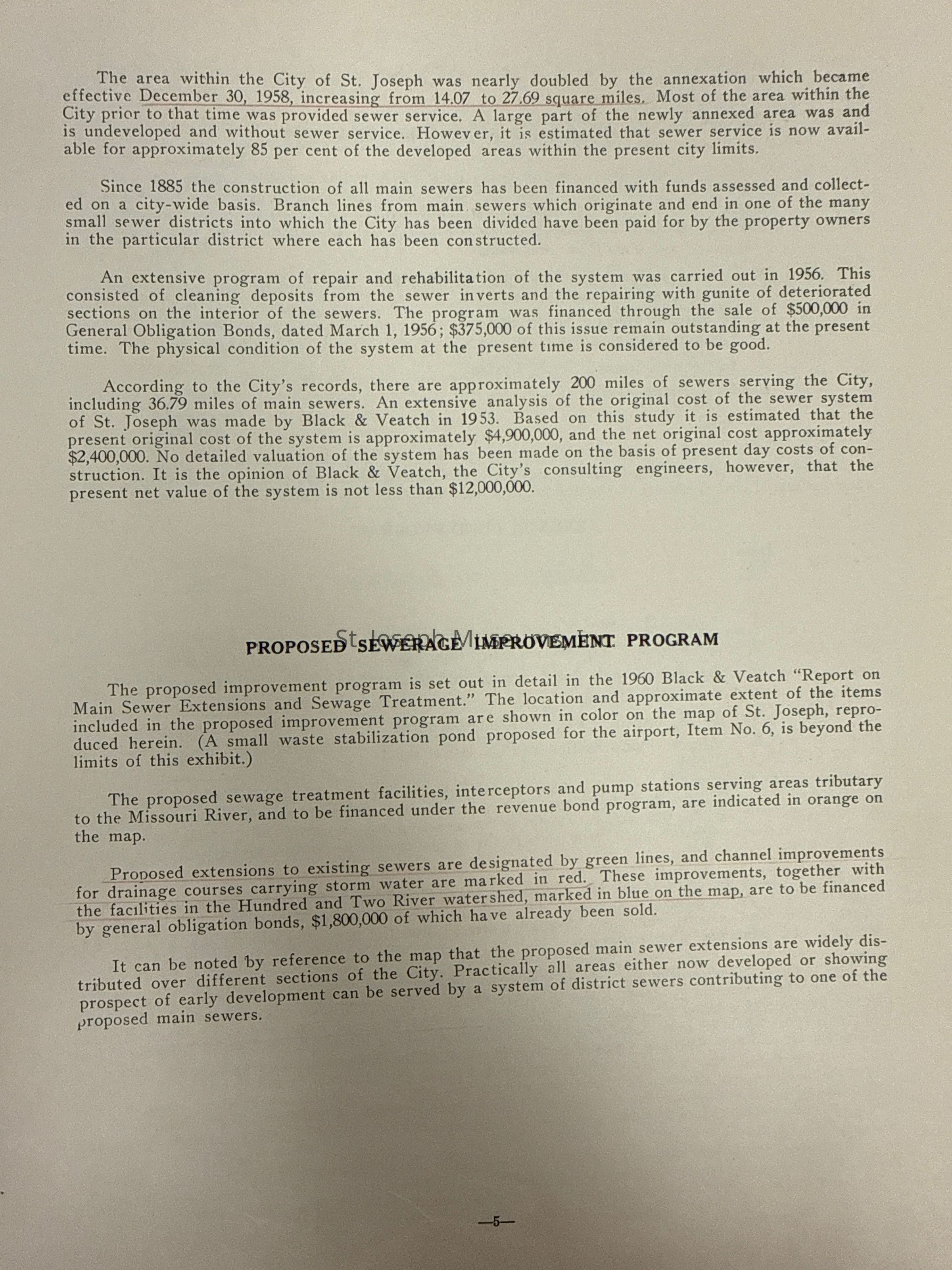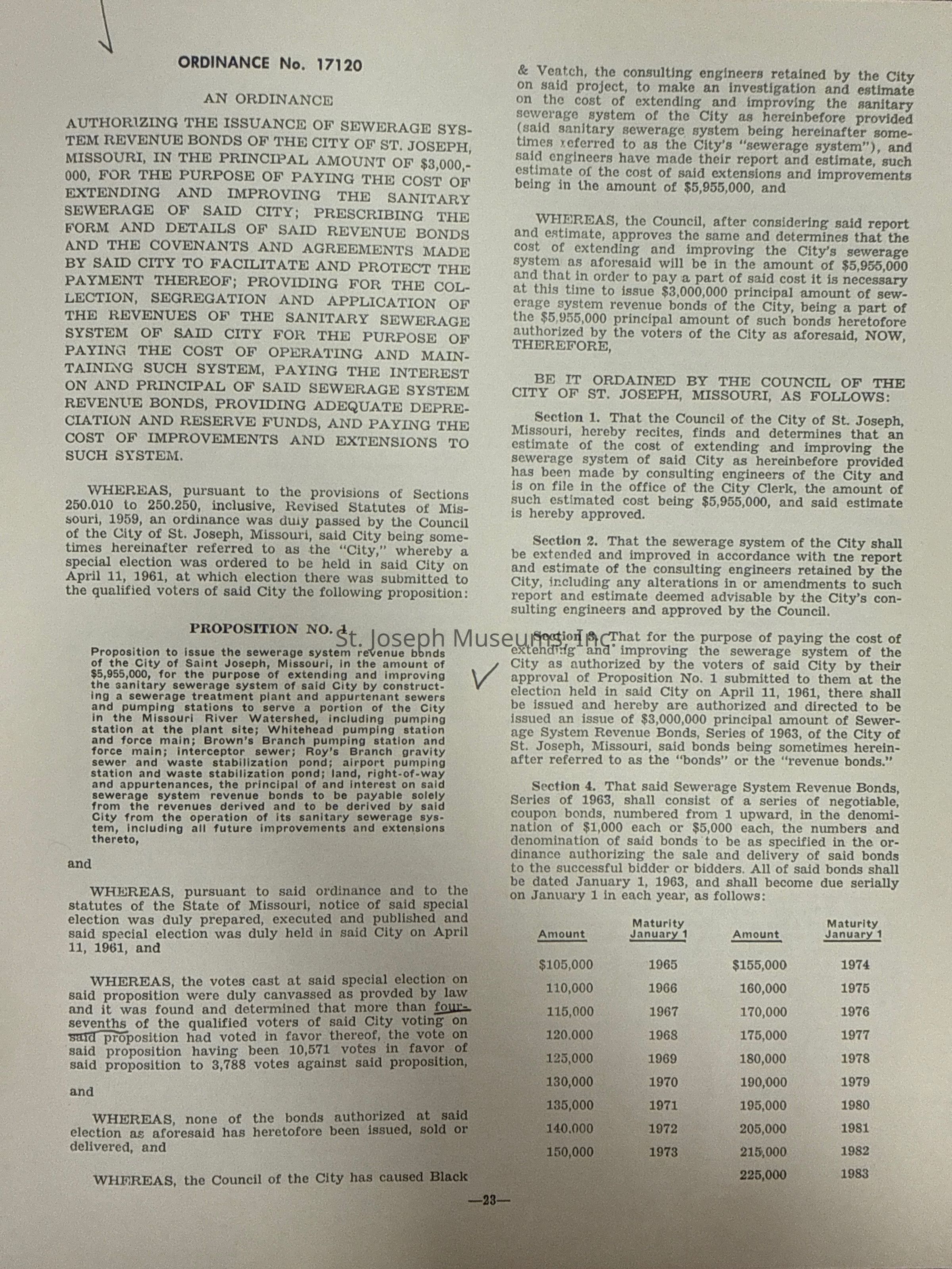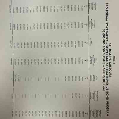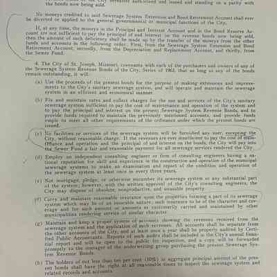 City of St. Joseph, Notice of Sale of Sewage Bonds, 1963. Booklet "Notice of Sale and Official Statement Relating to $3,000,000 City of St. Joseph, Missouri Sewage System Revenue Bonds, Series of 1963" Bids opened January 15, 1963. 31 pages. Handwritten notes throughout.