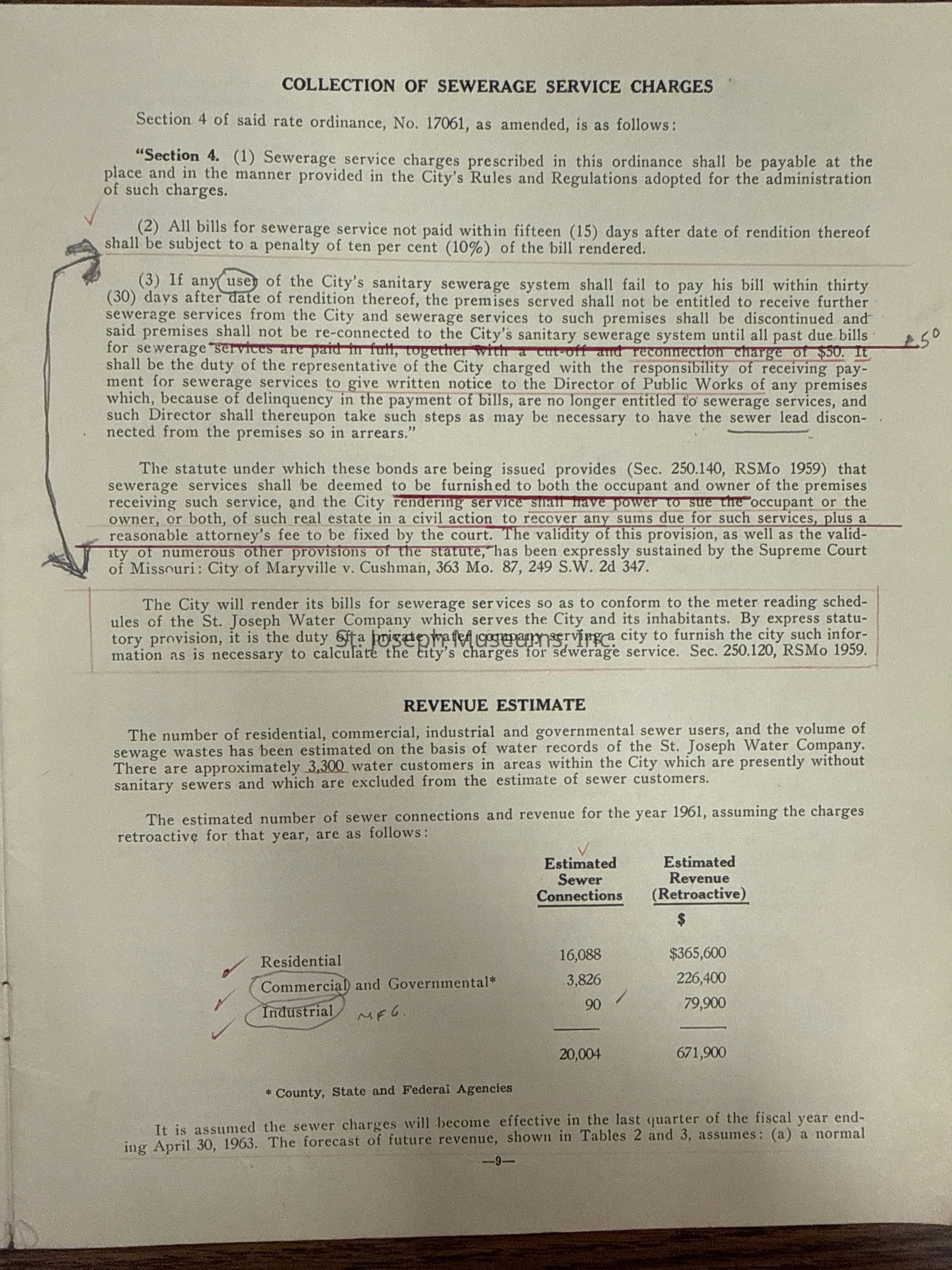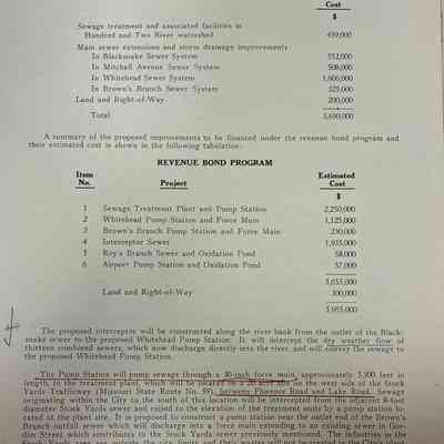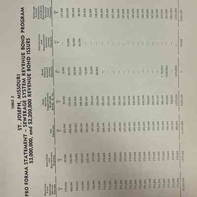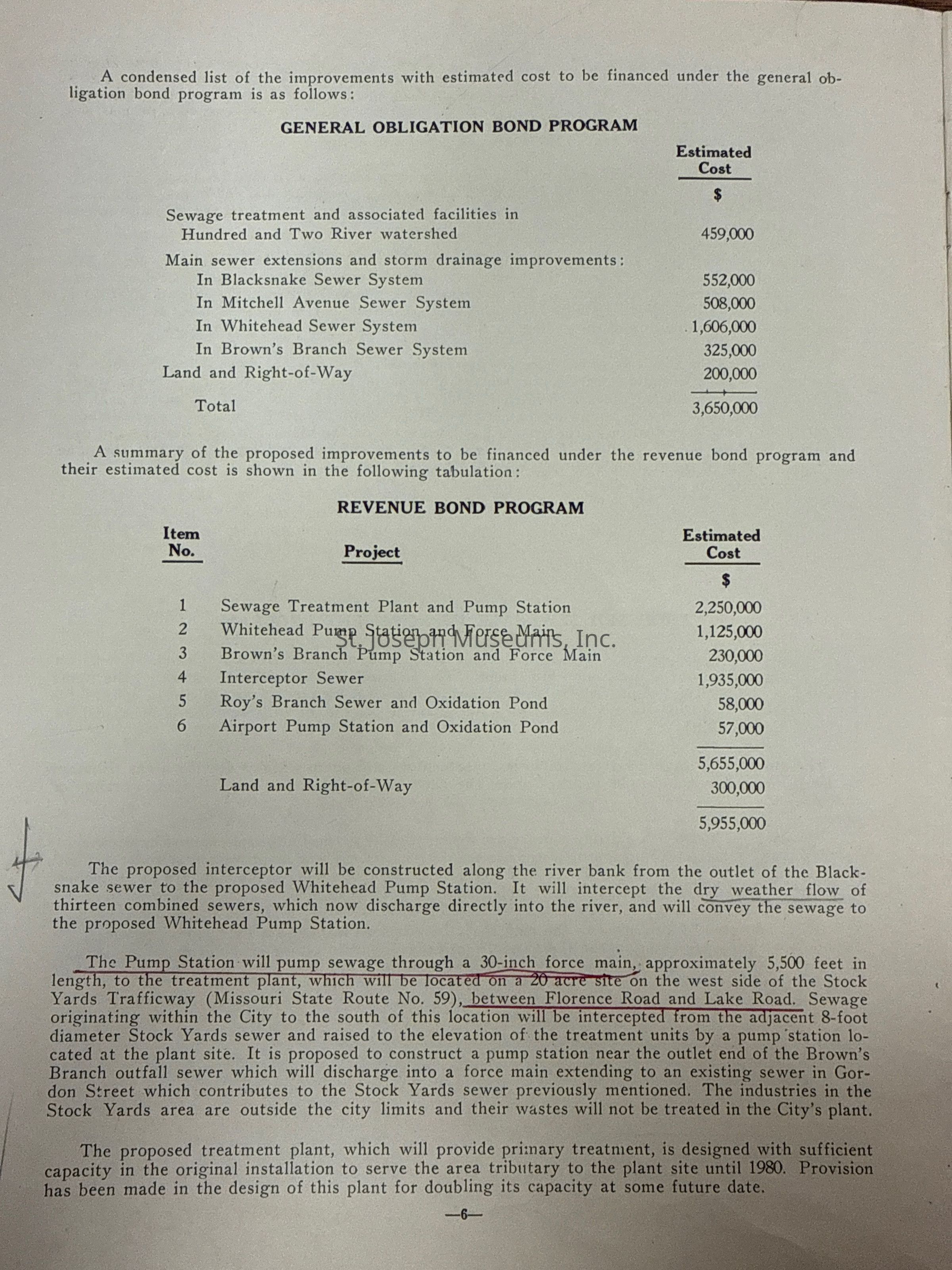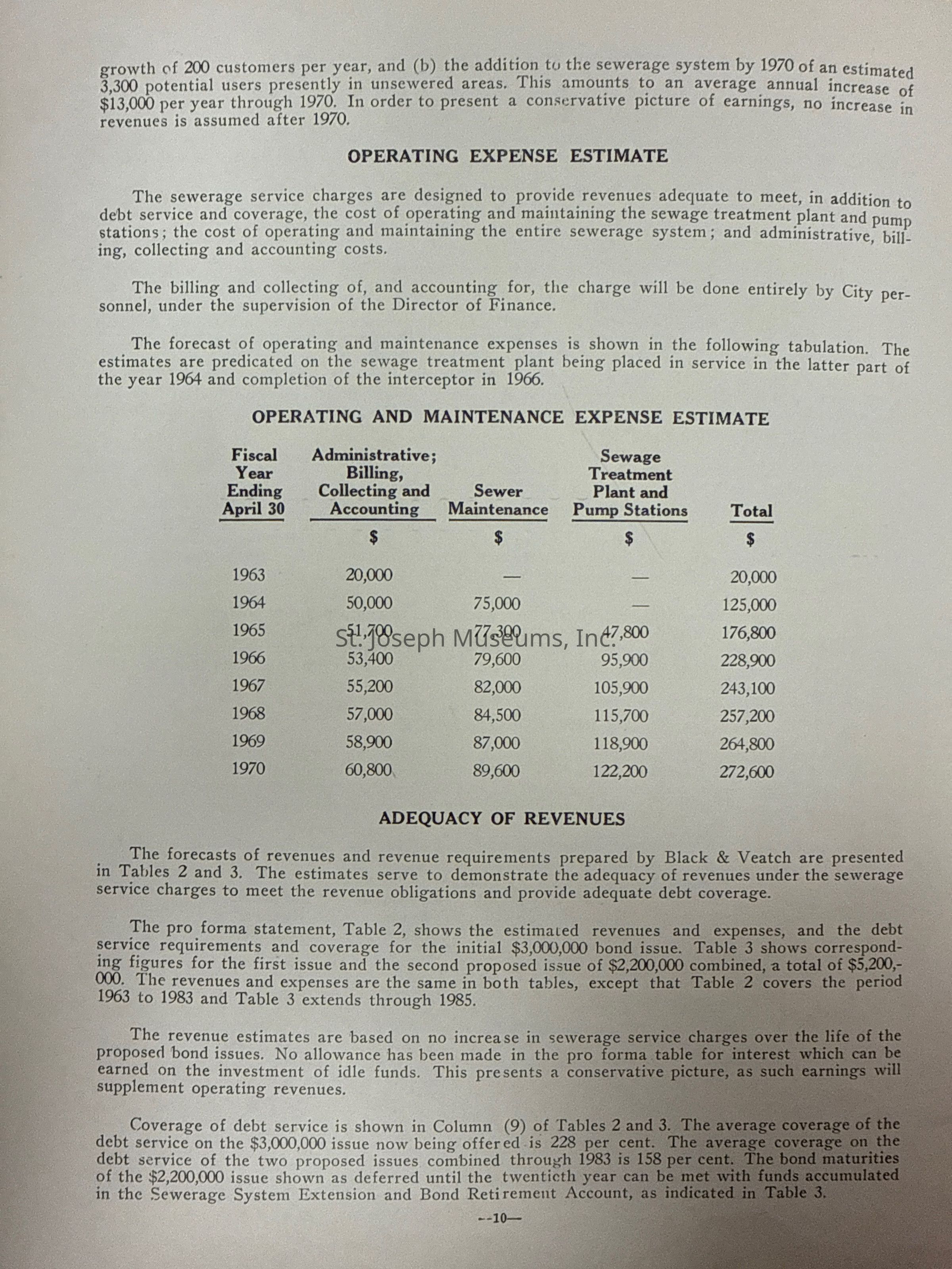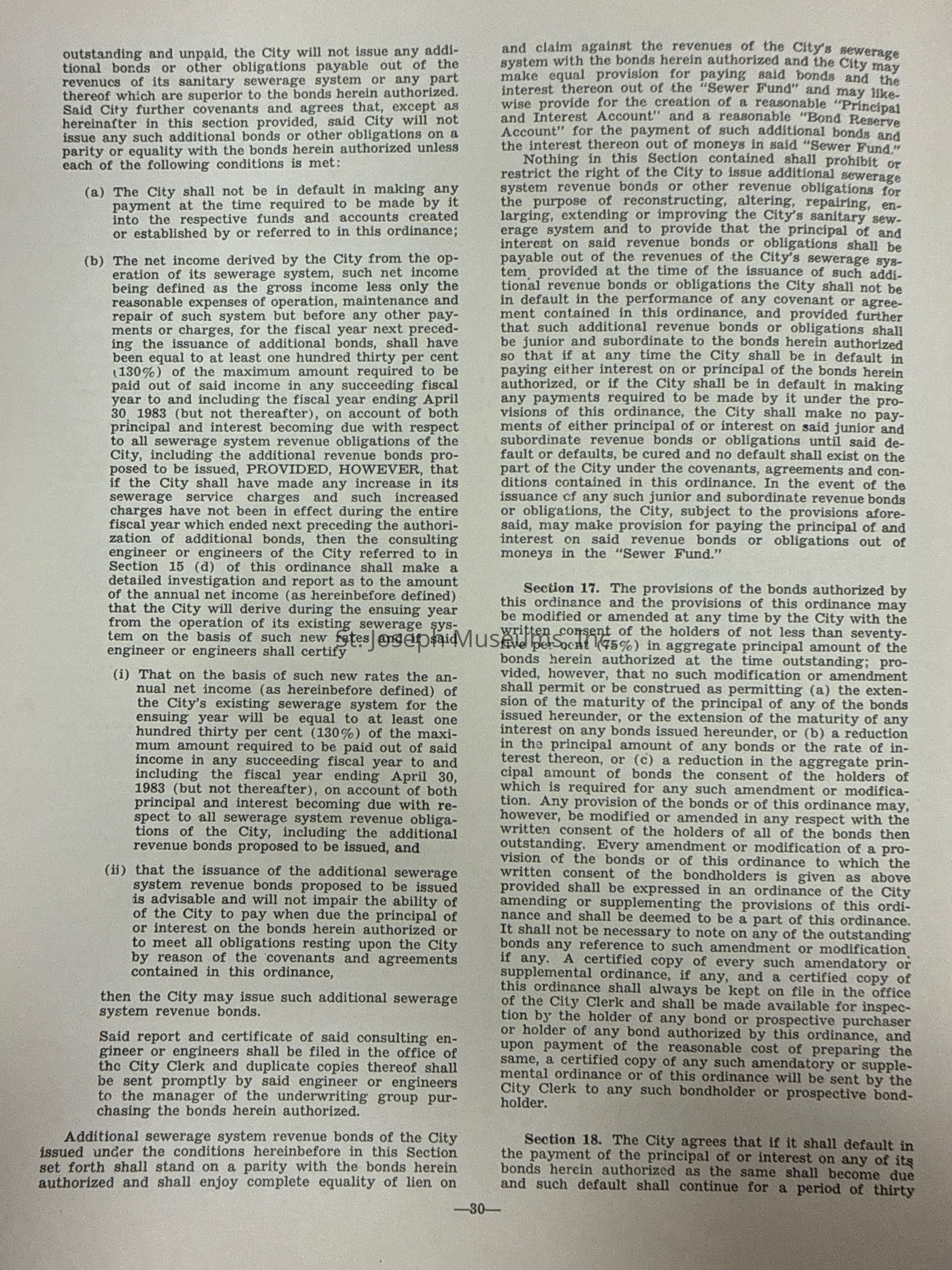 City of St. Joseph, Notice of Sale of Sewage Bonds, 1963. Booklet "Notice of Sale and Official Statement Relating to $3,000,000 City of St. Joseph, Missouri Sewage System Revenue Bonds, Series of 1963" Bids opened January 15, 1963. 31 pages. Handwritten notes throughout.