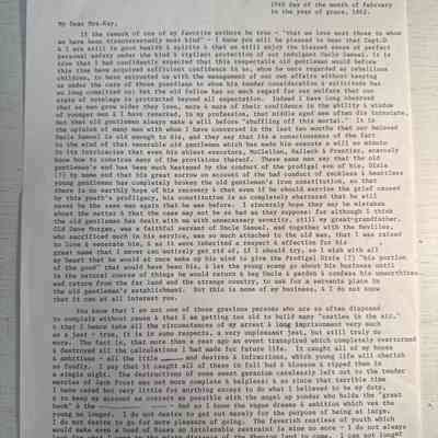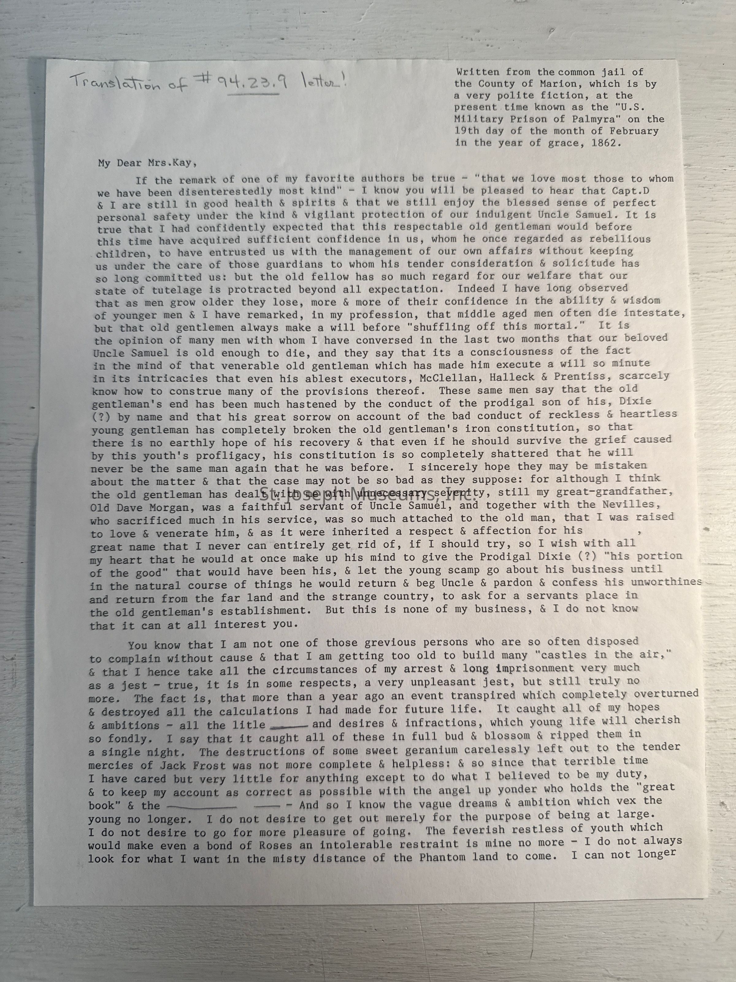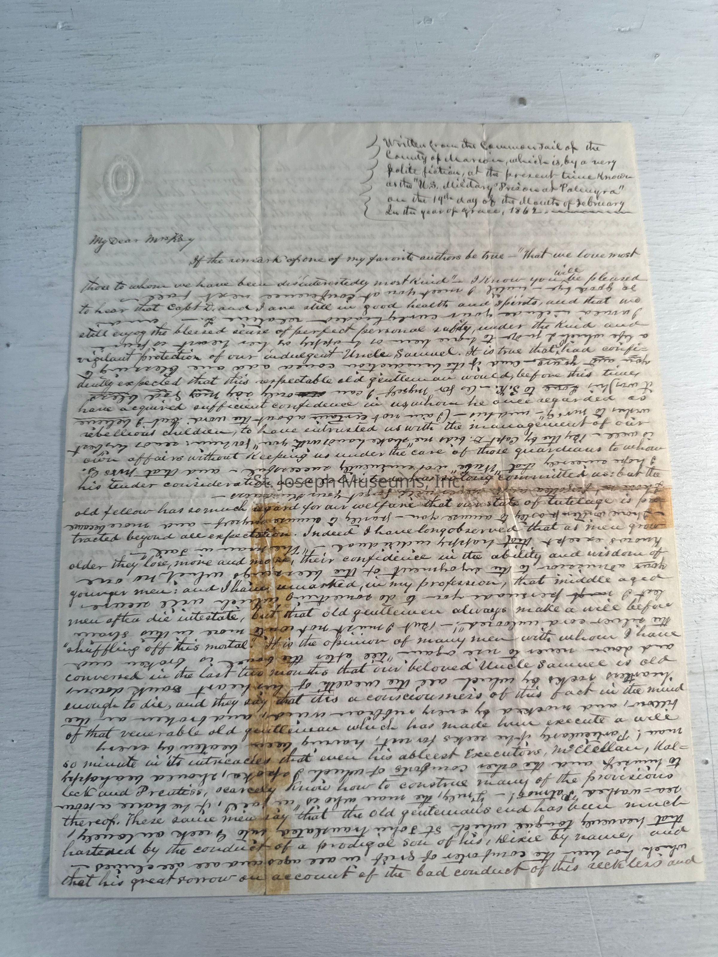 Civil War Letter: Kay, Reuben from U.S. Military Prison to Mrs. Kay, 1862 .This letter was written from the common jail of the County of Marion, Missouri the U. S. Military Prison of Palmyra February 19, 1862. The subject of his letter was about Uncle Samuel (meaning Uncle Sam or the U. S. Government).