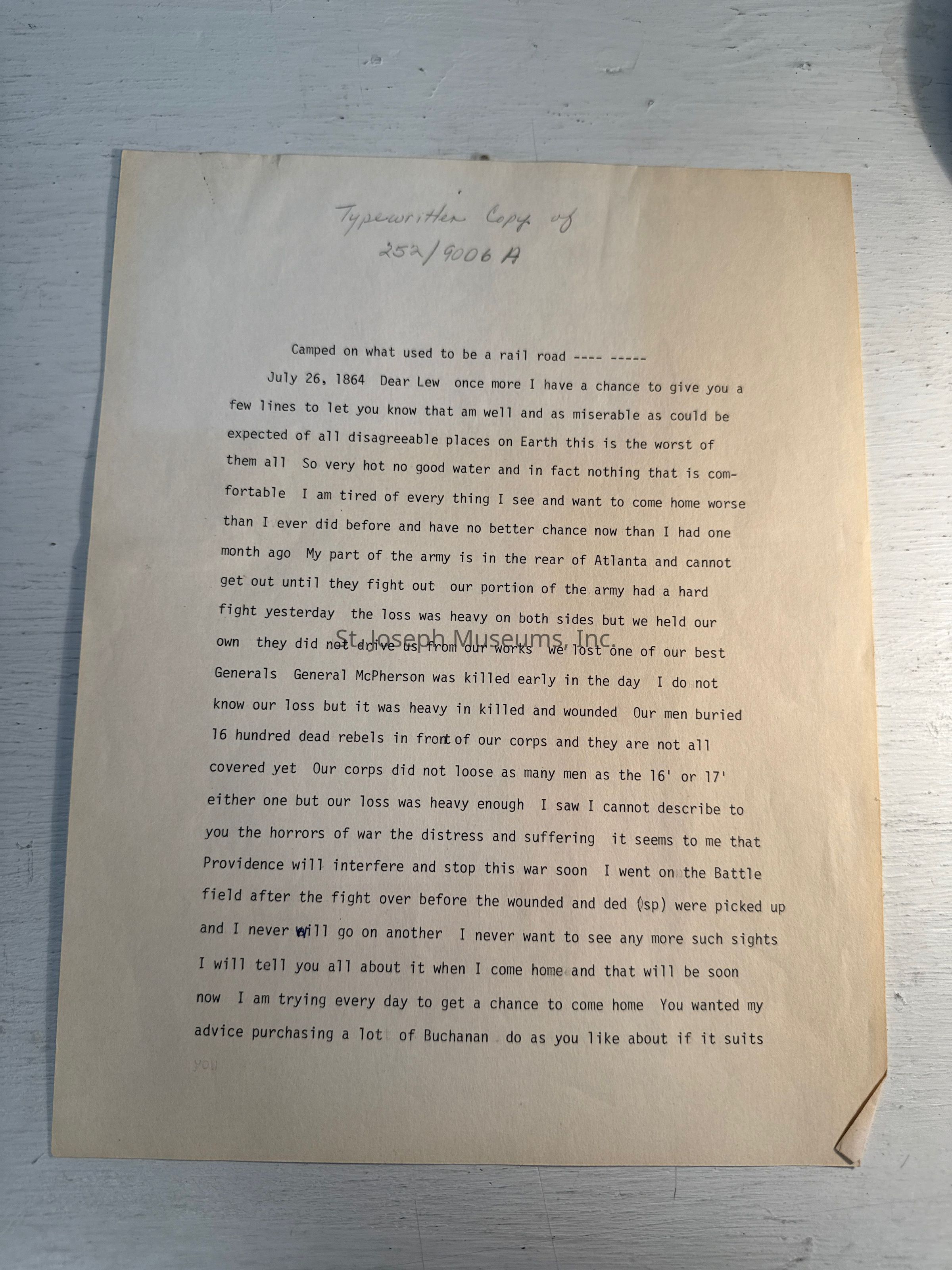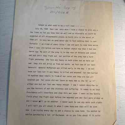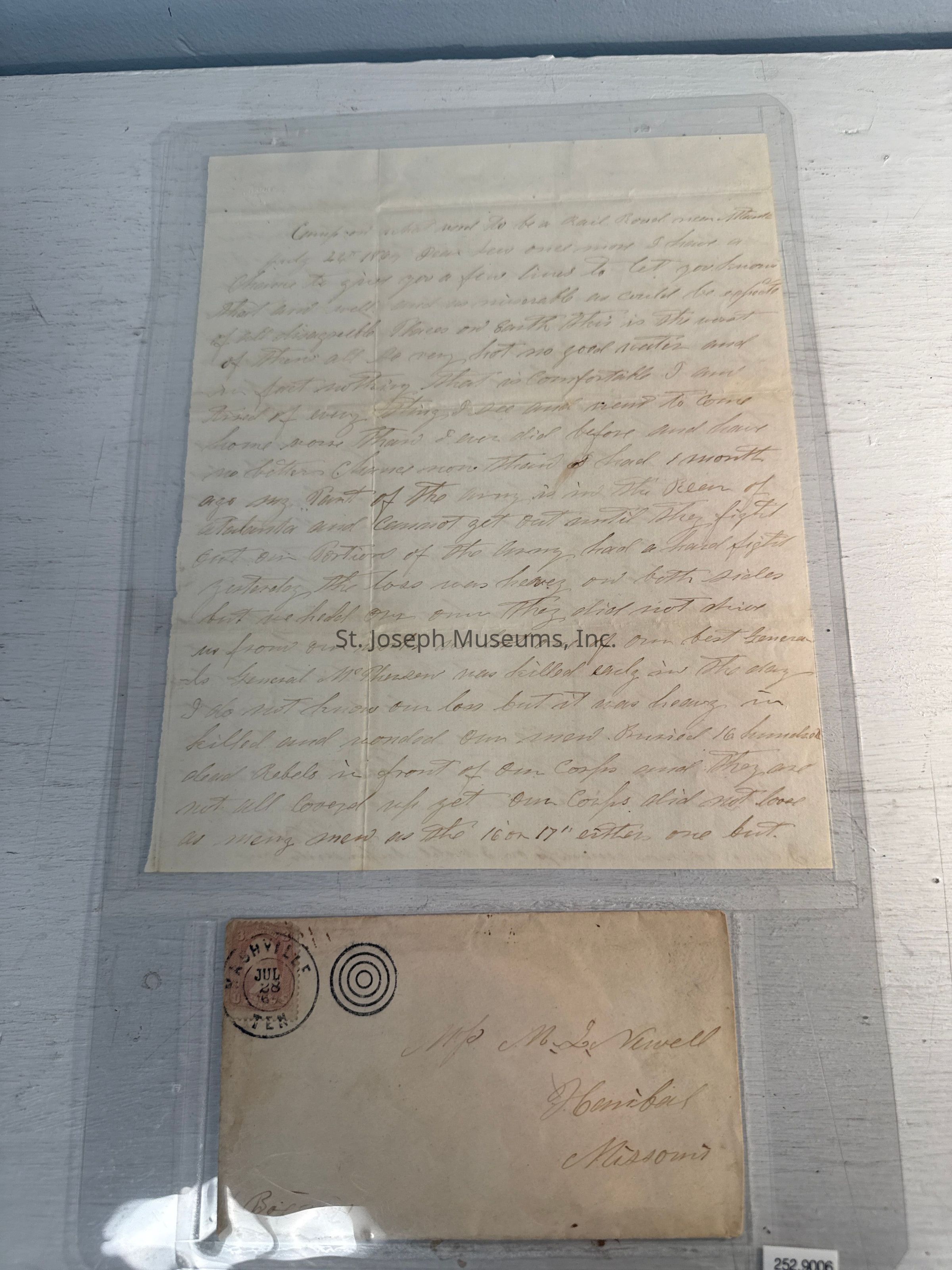 Newell, M. L. Letter (Hannibal) From Will Newell in Atlanta Georgia Civil War. Will is writing about the horrible scenes he is witnessing in the battle around Atlanta Georgia. General McPherson's death is recorded in this tetter. He also tell her the lots she wishes to purchase are okay and he will send her more money. Dated July 26, 1864.