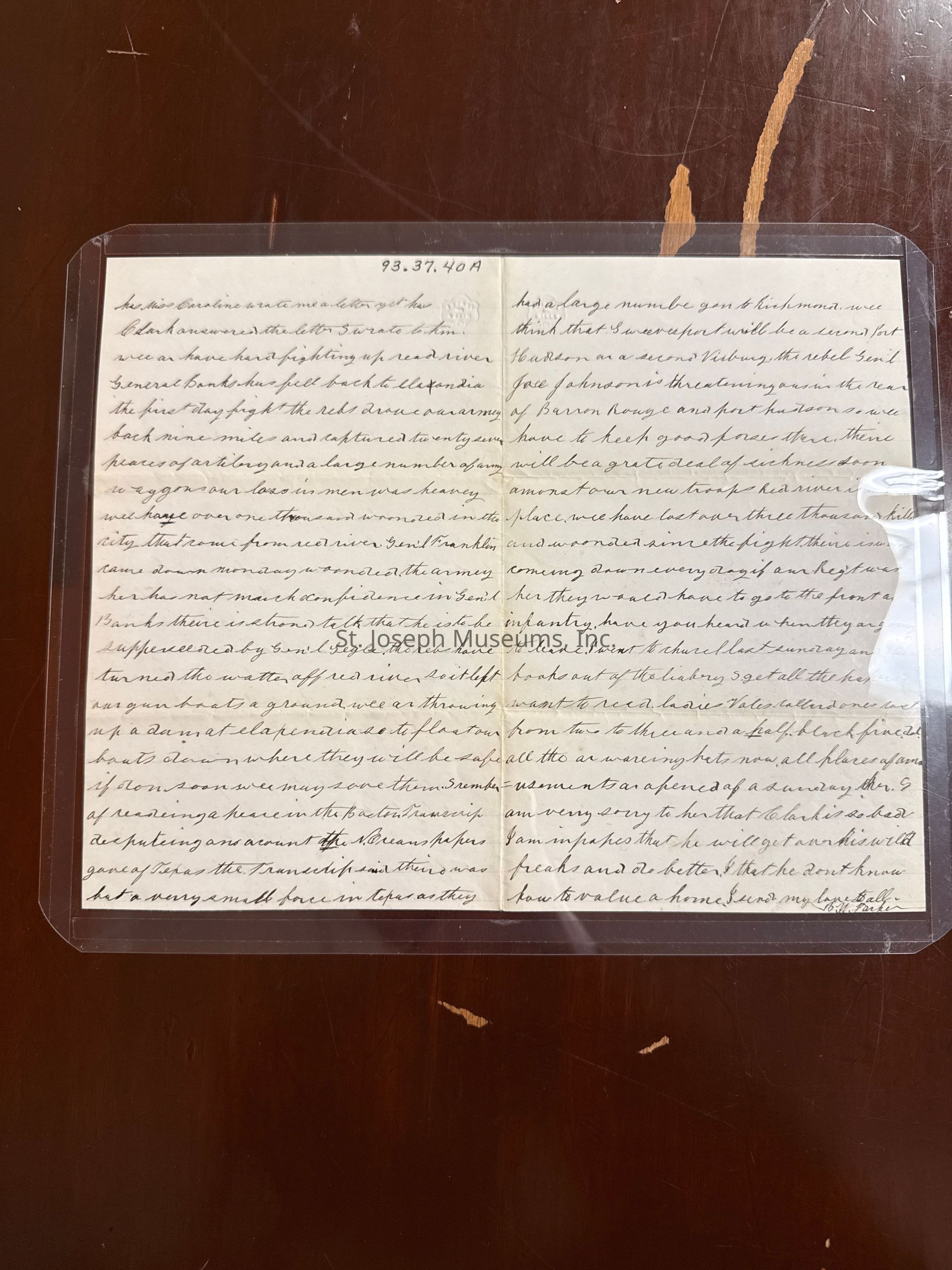 Civil War Letter: Parker, Benjamin Letter about New Orleans Fire to his Sister, 1864. He mentions a large fire uptown, He expects to go to Florida next week with prisoners,. He states that small pox is raging and many children have died. General Banks the first day fight rebs drove the Union army back 9 miles. They captured 27 pieces of artillery and a large number of army wagons. They have over 1,000 wounded. He mentions that the army hasn't much confidence in General Gegle. The rebs have turned water off so their gunboats were aground. The rebel General Joel Johnson is threatening the rear of Baton Rouge and Port Hudson and the Red river is a bad place Dated May 4, 1864. B is envelope addressed to Louisa Parker No. 42 Springfield Street, Boston, Mass. Cancelled stamp New Orleans L. A May 4. In upper left hand corner is Sanitary Commission N. E. Women's Auxiliary Association 22 Summer Street, Boston.