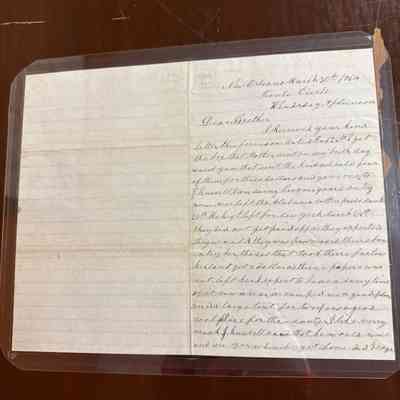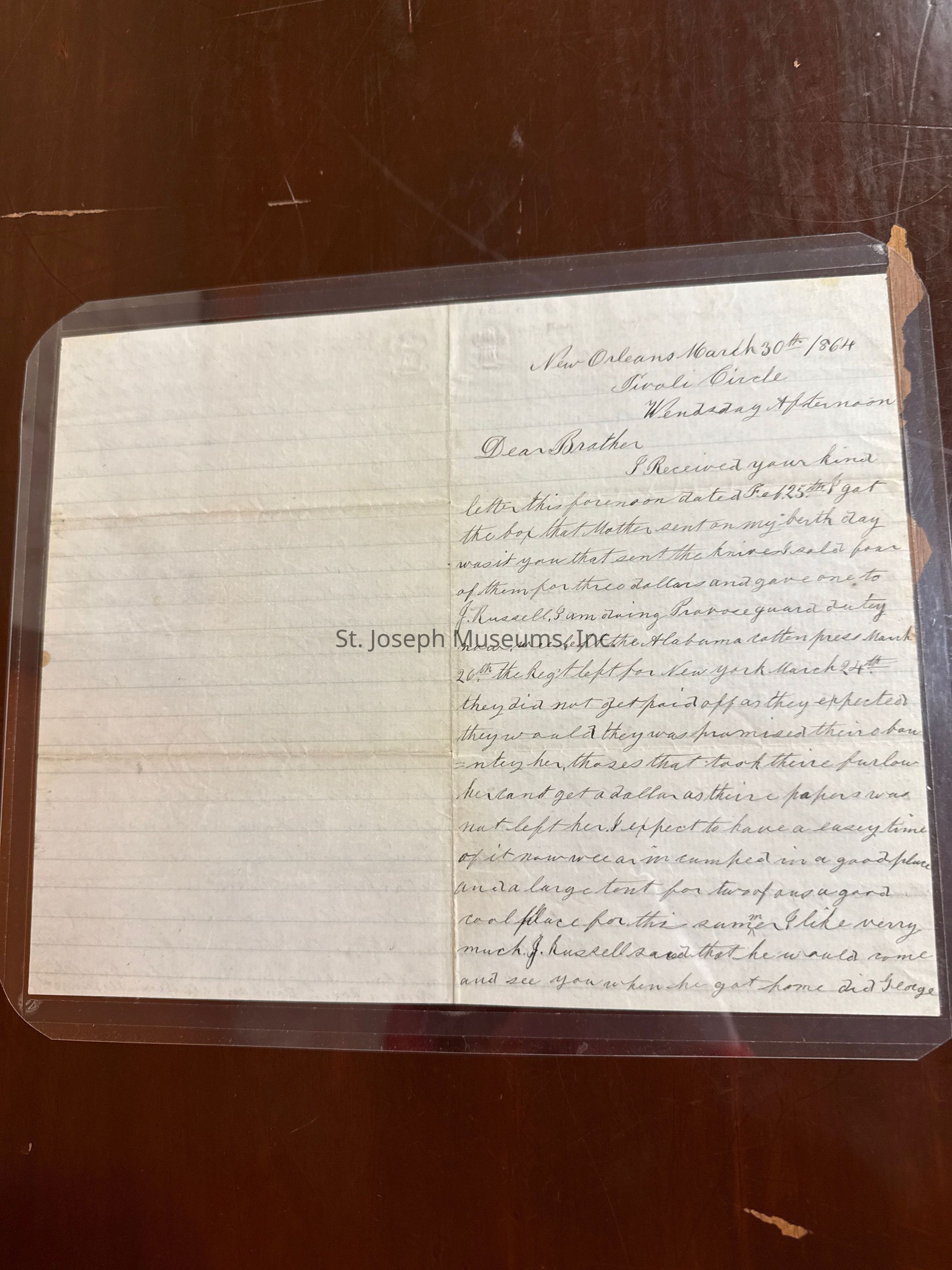Civil War Letter: Parker, Benjamin Letter, Tivoli Circle to his brother Clark, 1864. New Orleans. He had left the Alabama Cotton Press. The regiment had left for New York, They did not get paid off as expected. He writes to his brother about his brothers girls and says he will send him $20 for a suit. Dated March 30, 1864.Lexicon