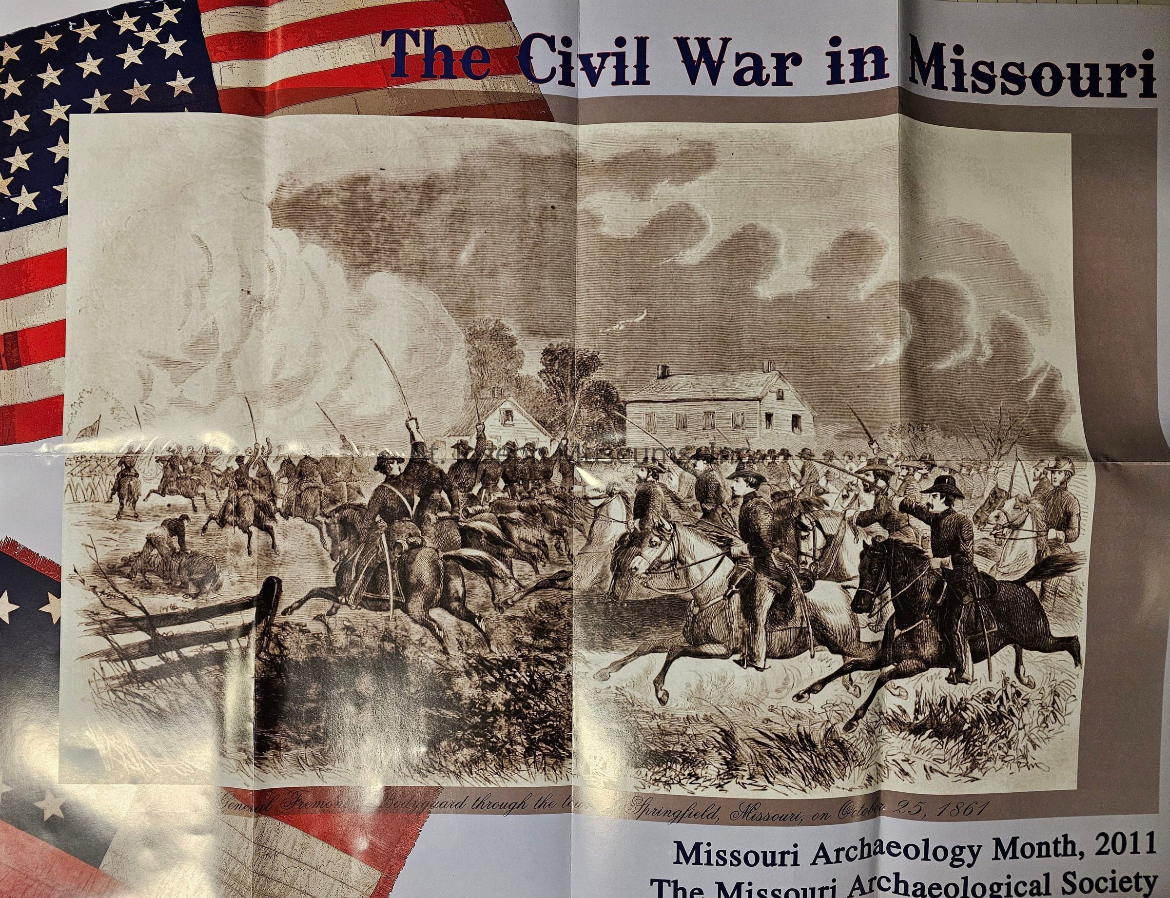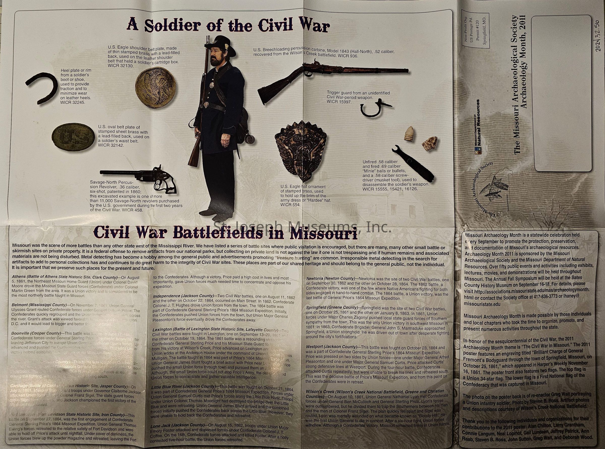 Created by the Missouri Archaeological Society for Missouri Archaeology Month 2011. One side has an image of the charge of General Fremont's bodyguard through the town of Springfield, MO on October 25, 1861. The reverse has an infographic of a soldier in the civil war and a list of civil war battlefields in MO.Context