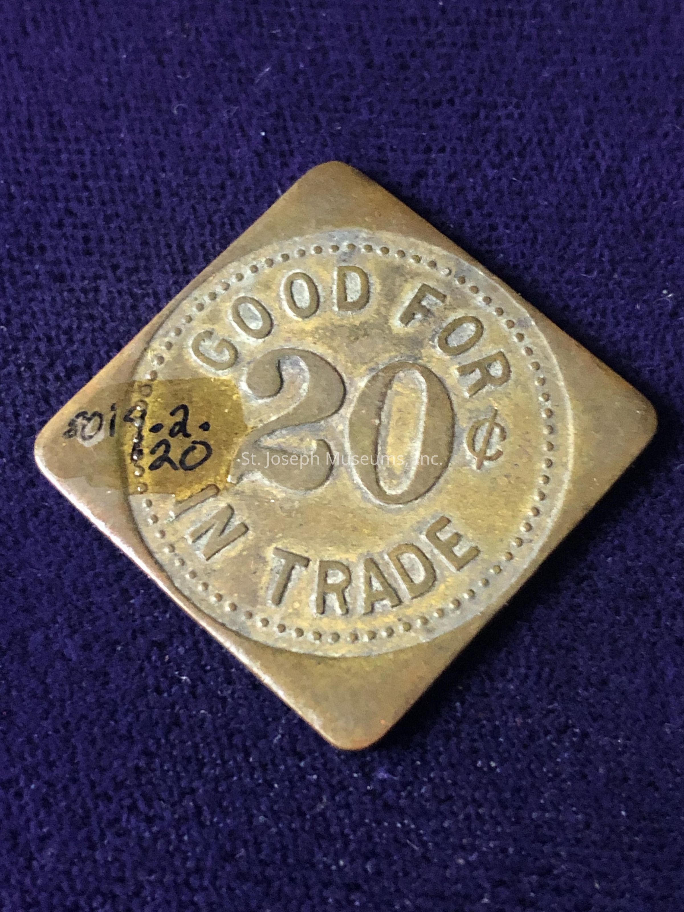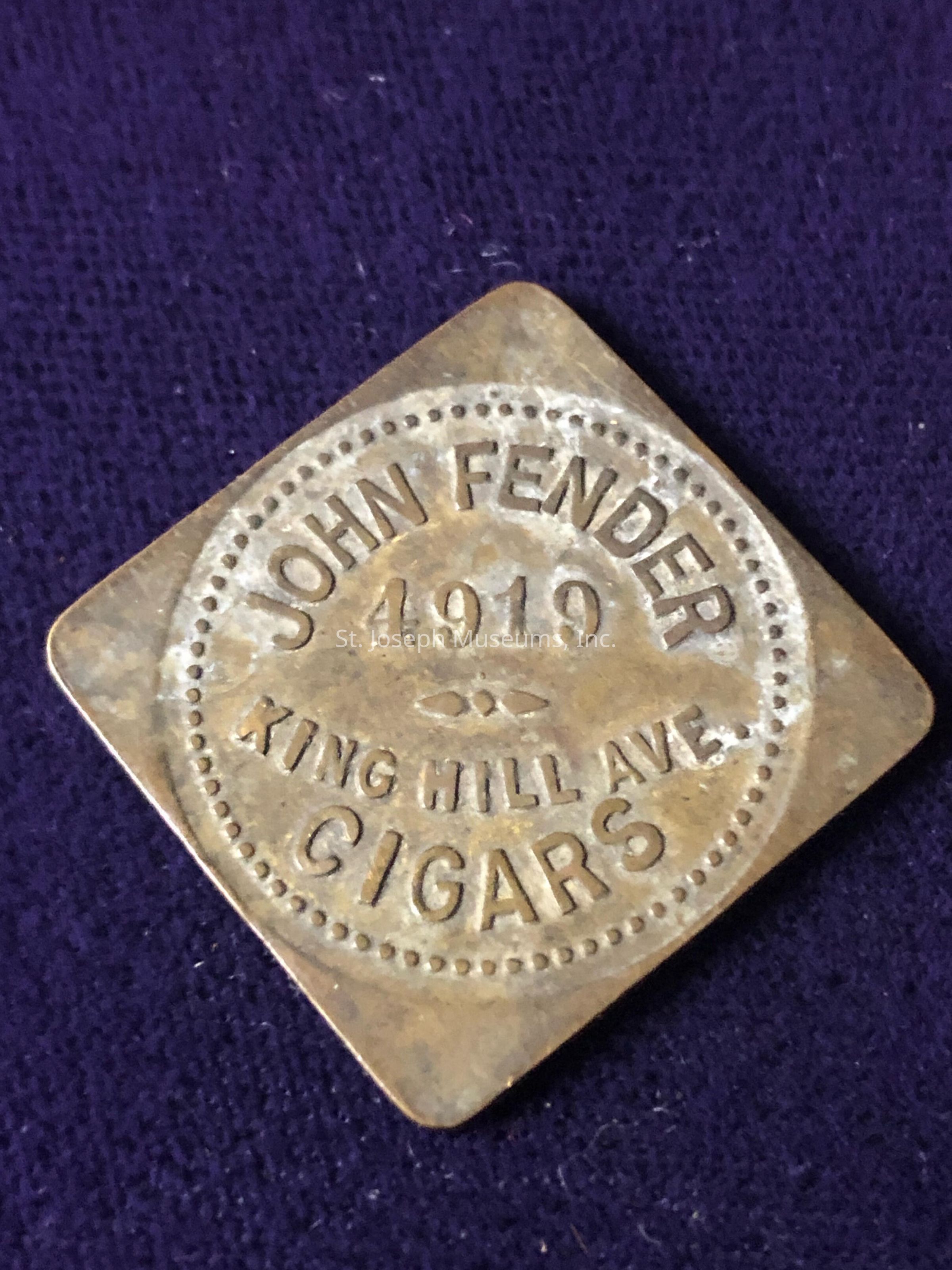 Coin, bronze. Square shaped. "Good for 20 cents in Trade" "John Fender 1919- King Hill Ave- Cigars"