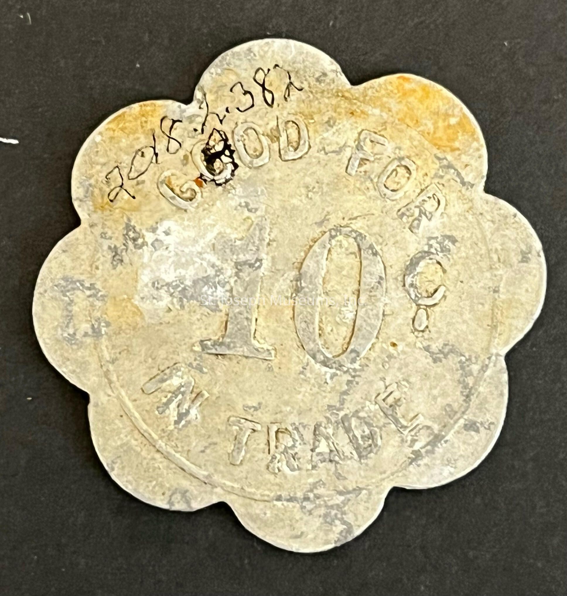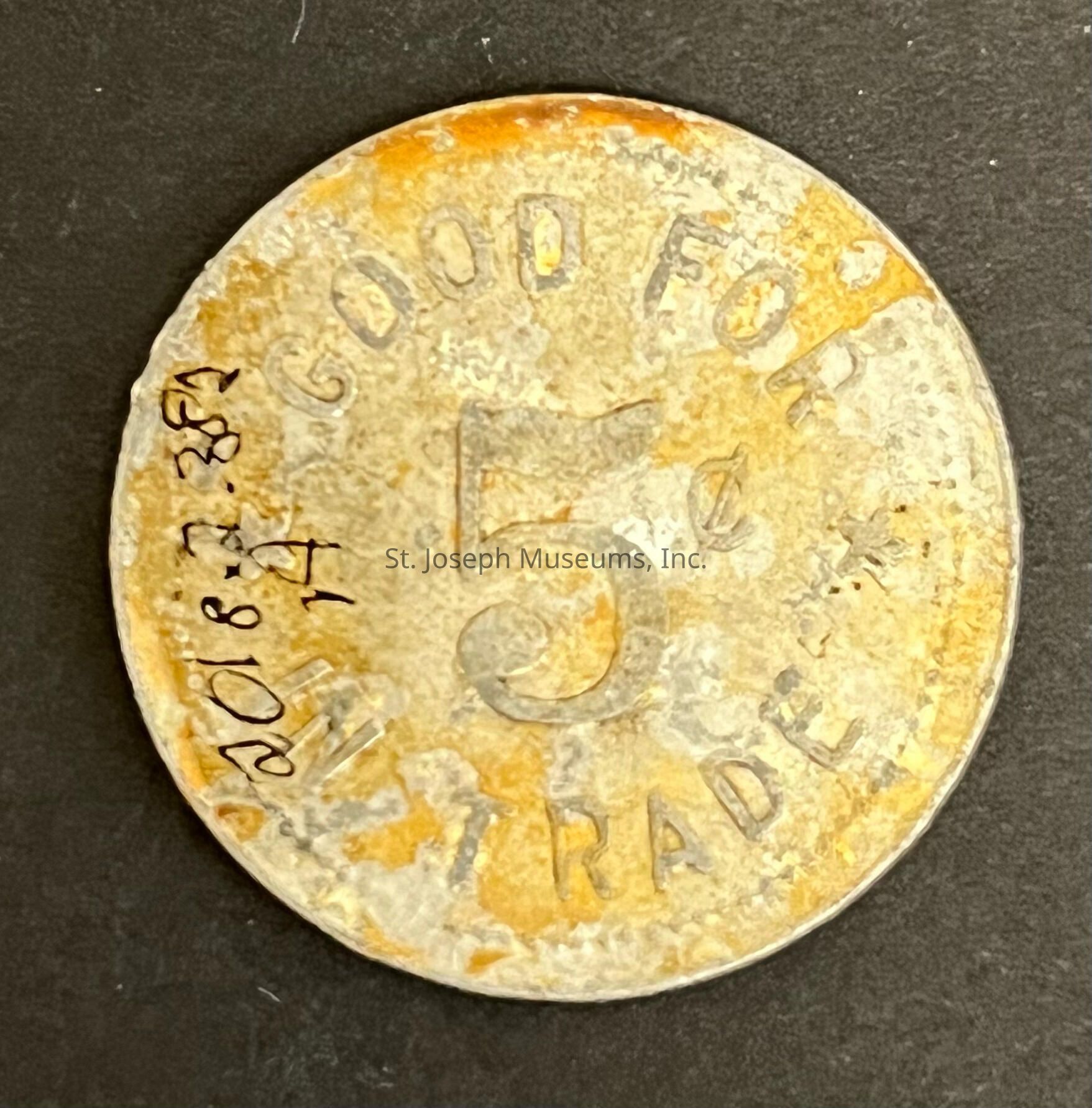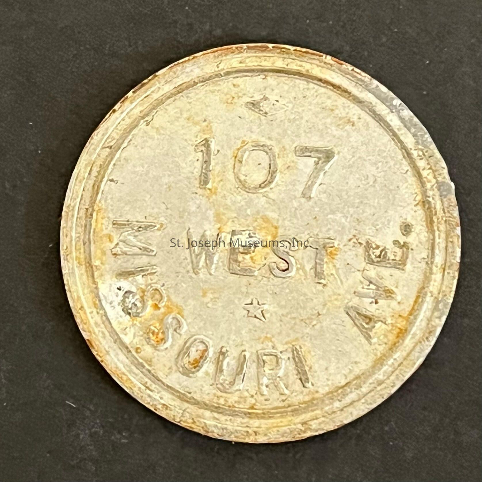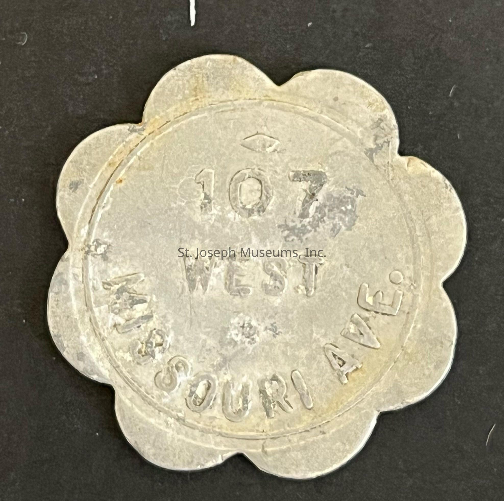 A. ONE/SILVER COLORED/METAL/107 W. MISSOURI AVE. ON ONE SIDE/GOOD FOR 5 C ON OTHER SIDE. B. ONE/SCALLOPED EDGED/SILVER SOLORED/107 W. MISSOURI AVE. ON ONE SIDE/GOOD FOR10 C ON OTHER SIDE