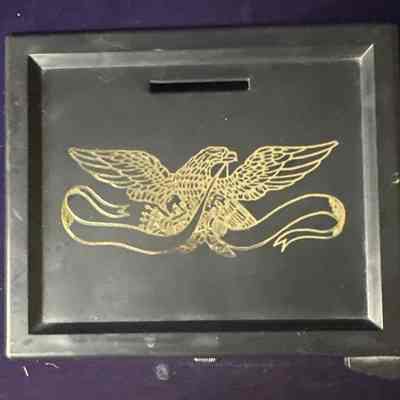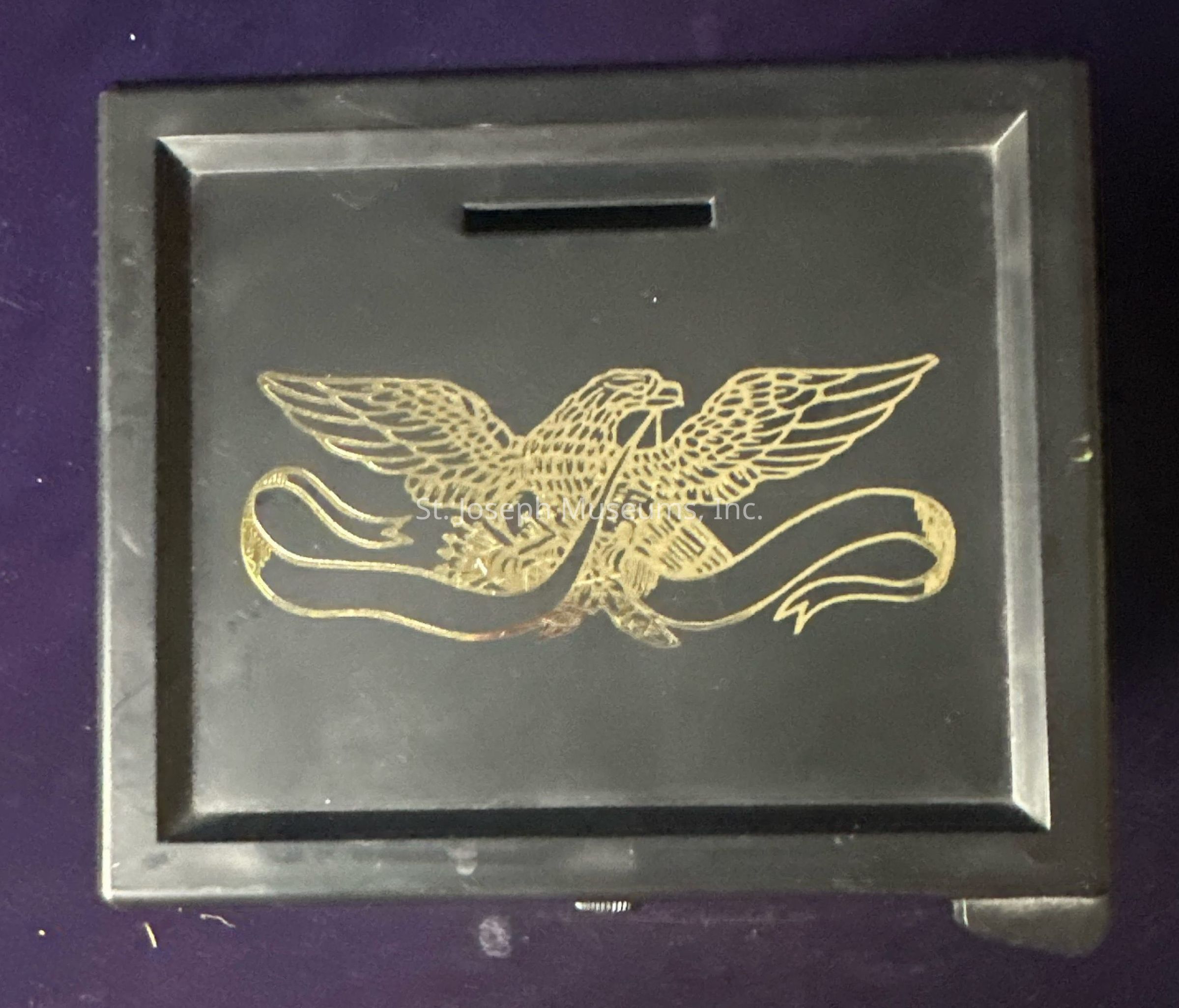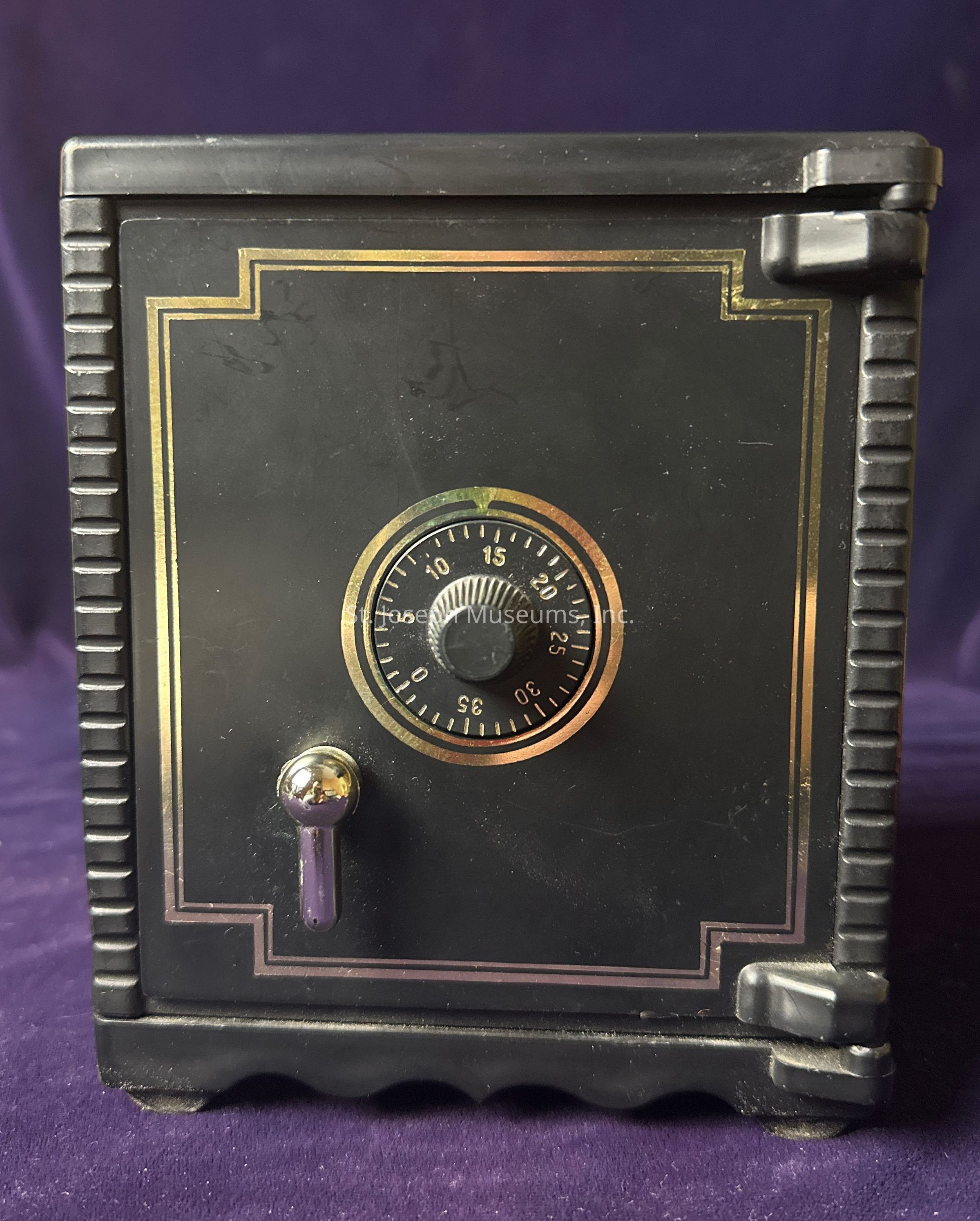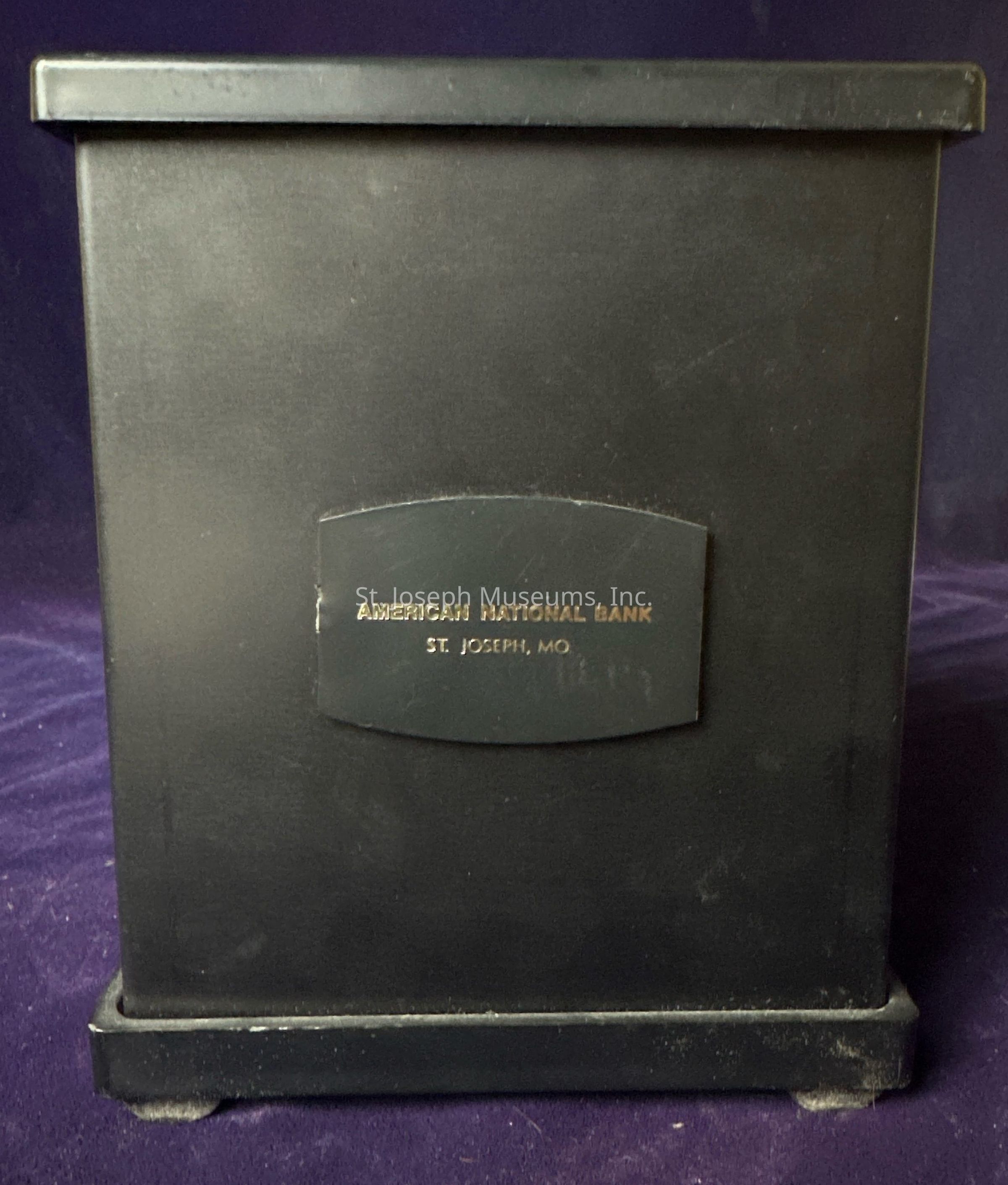 Small tin coin bank in the shape of a black and gold safe advertising the American National Bank in Saint Joseph, Missouri.
