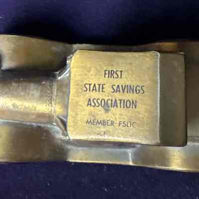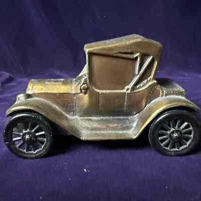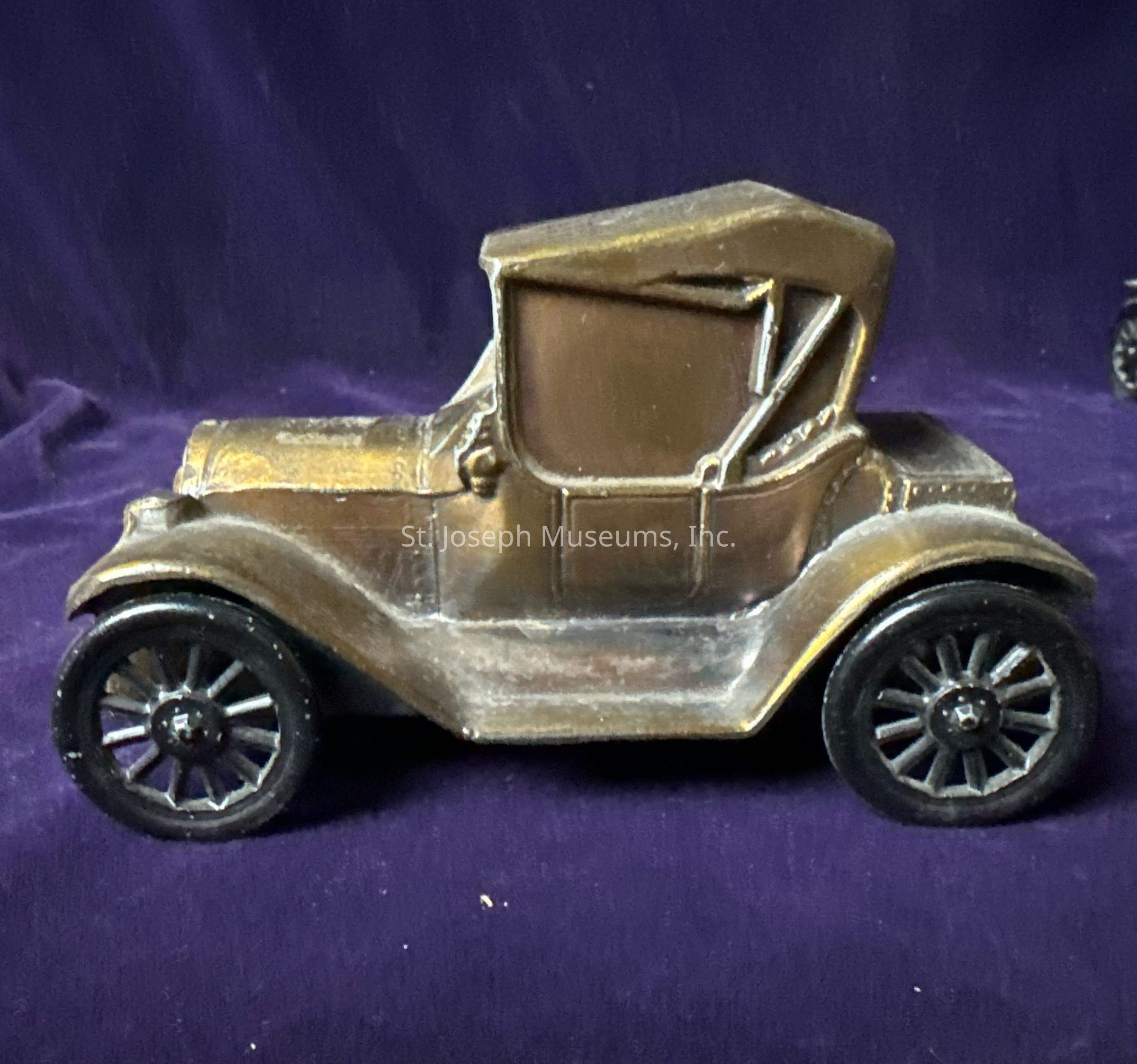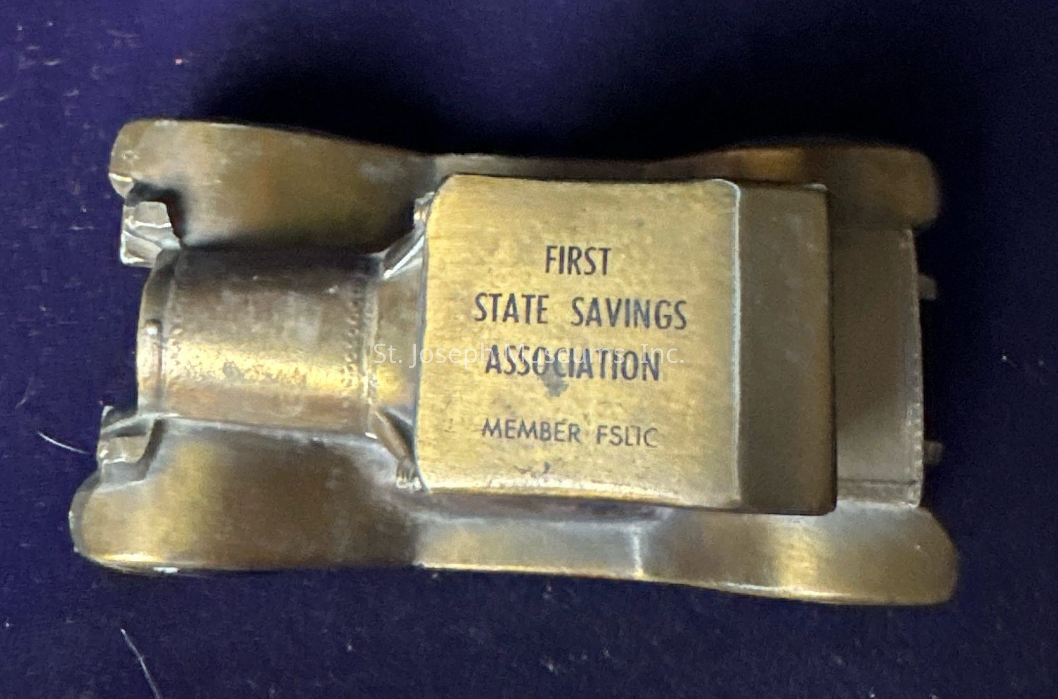 Metal coin bank in the shape of a car advertising the First State Savings Association of Saint Joseph, Missouri.