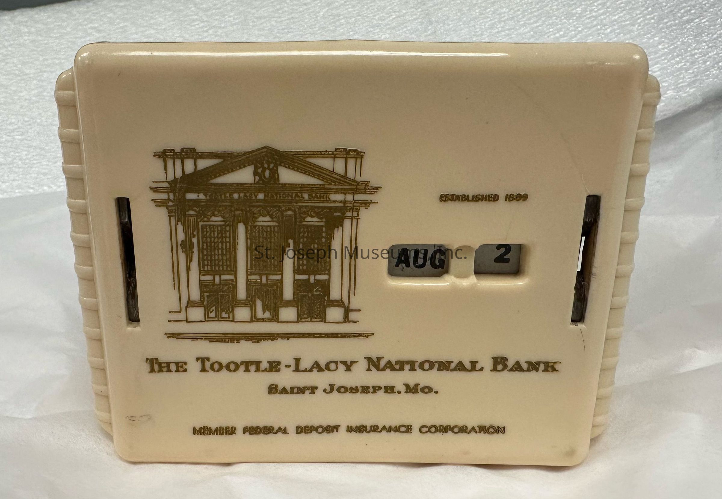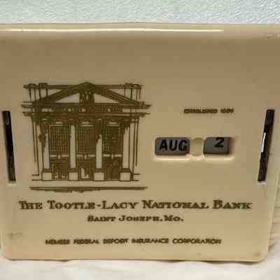 A plastic coin bank with an advertisement for the Tootle-Lacy National Bank.