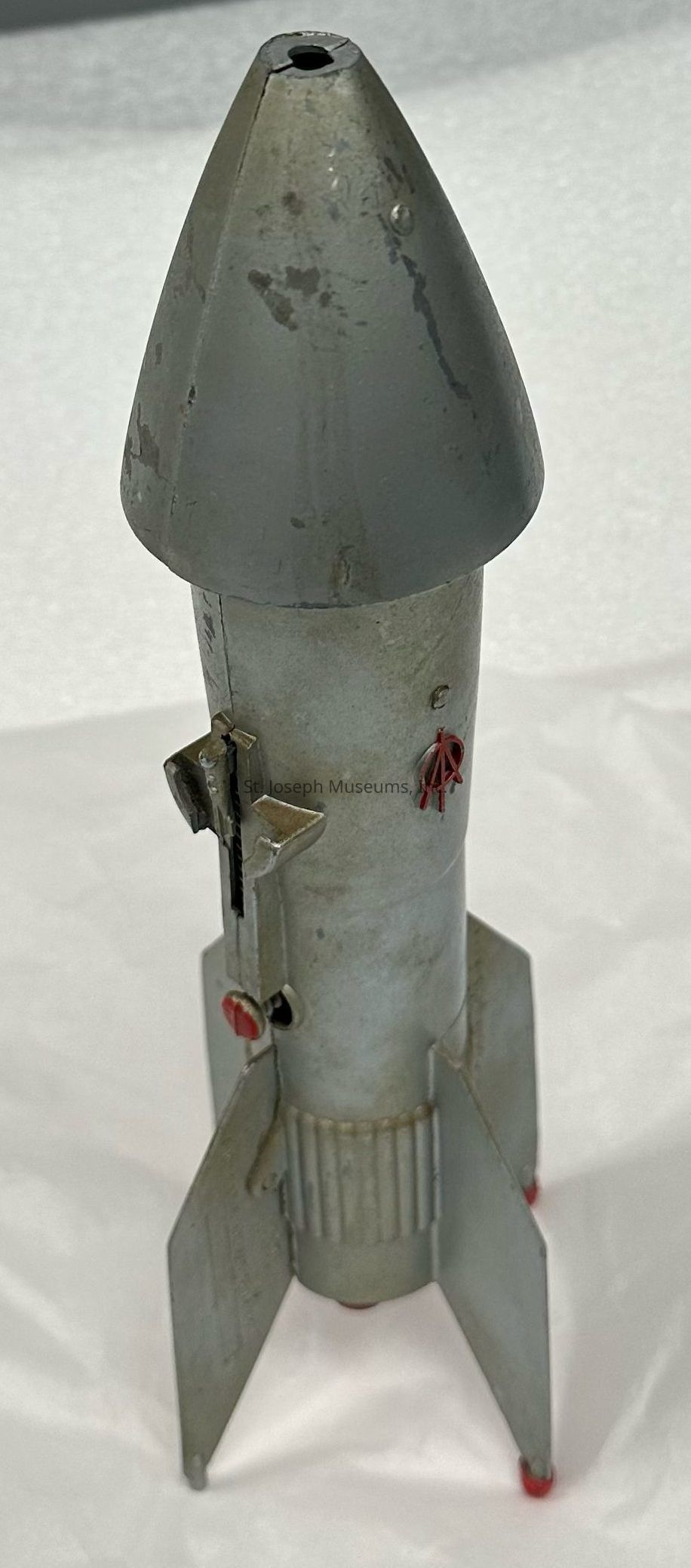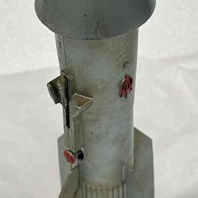 A metal coin bank in the shape of a silver rocket.