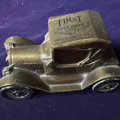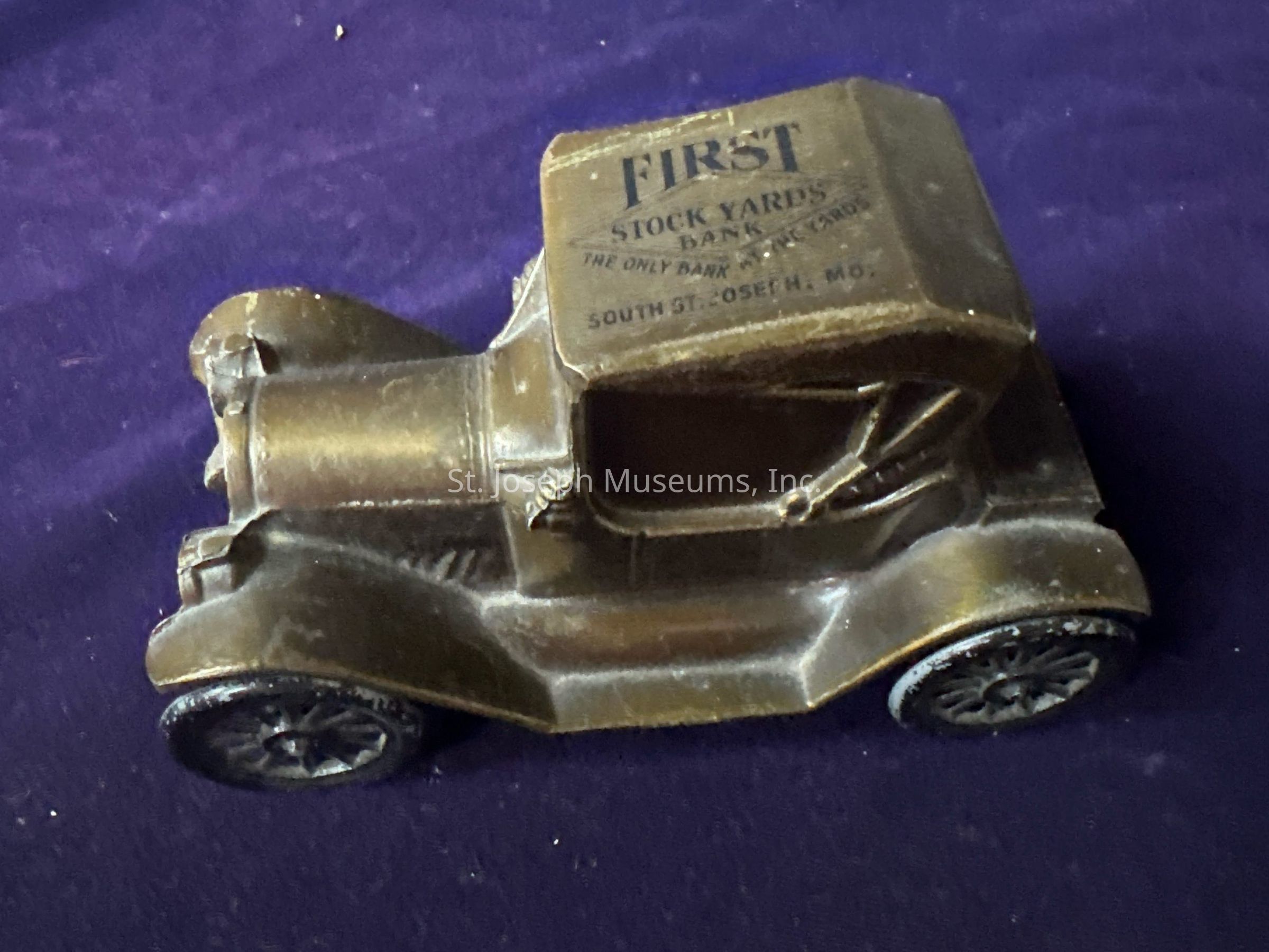 Metal coin bank in the shape of a car advertising the First Stock Yards Bank of Saint Joseph, Missouri.Relationships