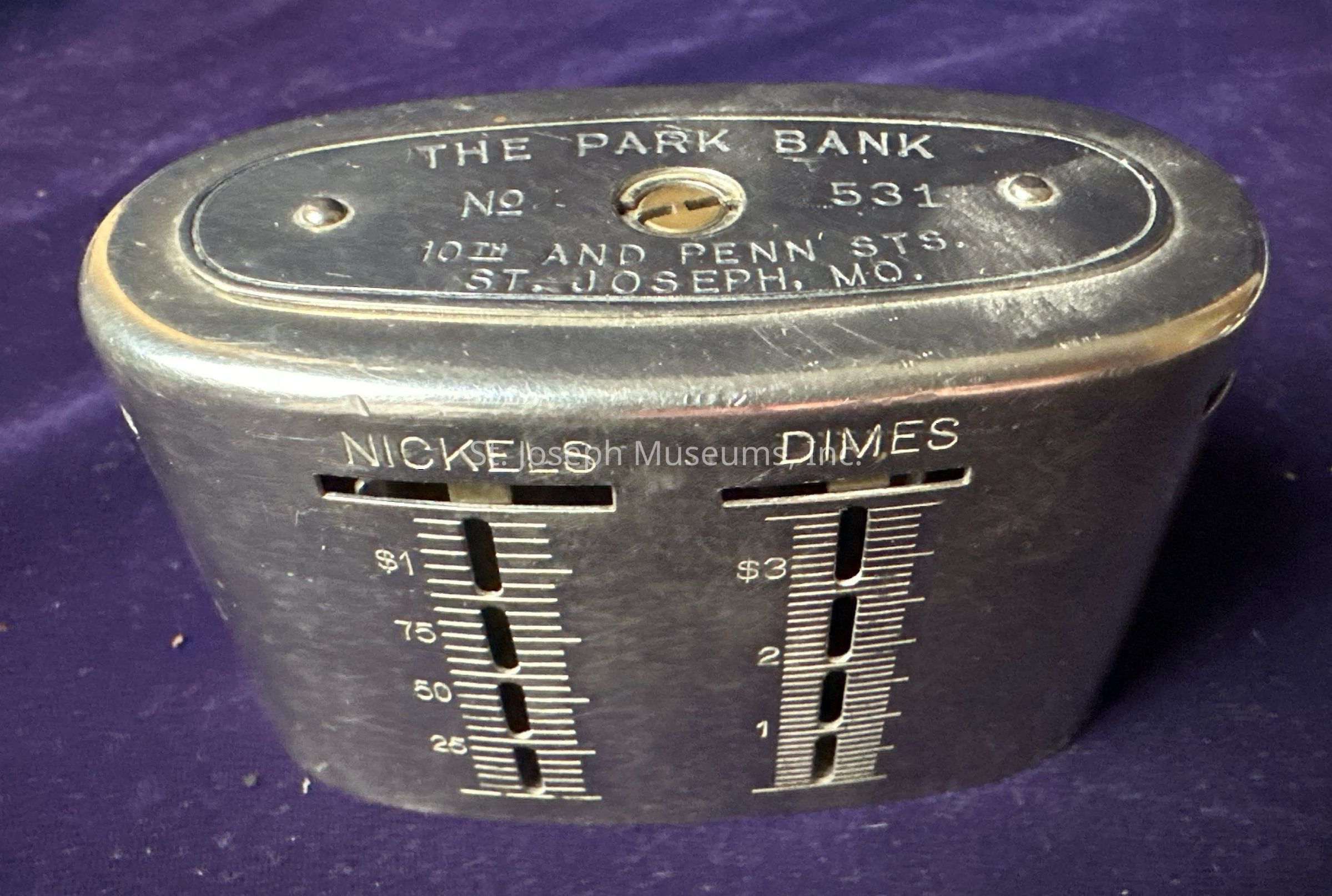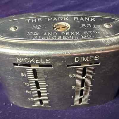 Metal coin bank advertising The Park Bank of Saint Joseph, Museums.Relationships