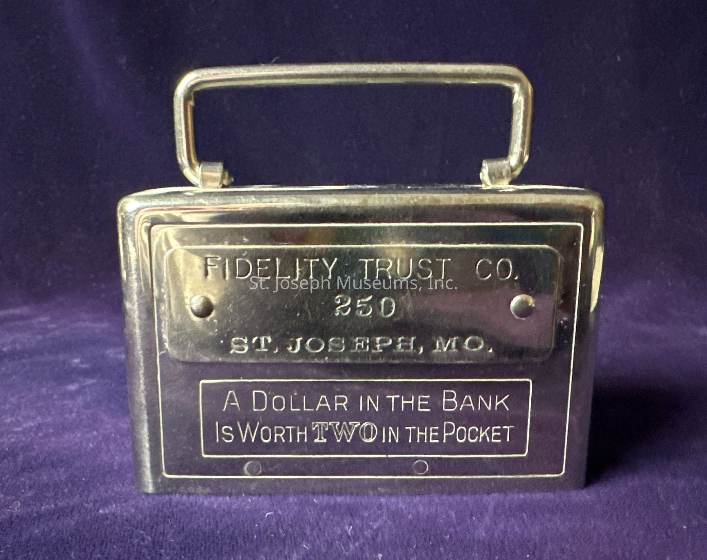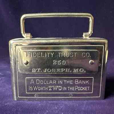 Metal coin bank with handle advertising the Fidelity Trust Company of Saint Joseph, Missouri, along with the slogan: