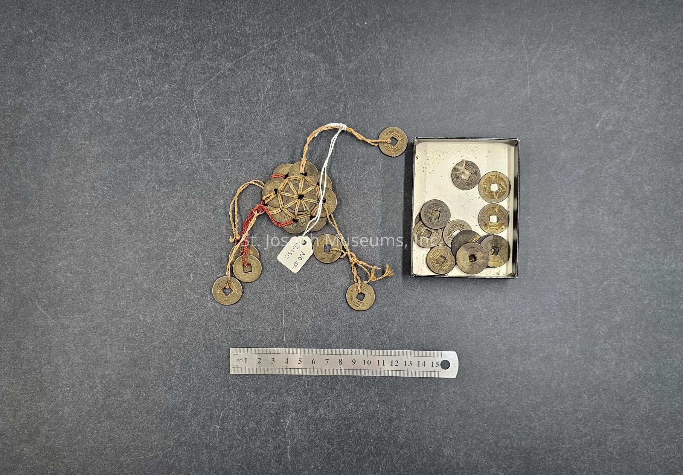 This is a medallion that would have hung from a coin sword like the ones seen on display here. The coin swords are made from loose coin currency, all of which are minted/created in the 19th century. The year of the coins is very specific, as the people who make the coin swords want coins from particularly auspicious years. Chinese coins in general are a very important historical artifact. Ancient China was one of the first in the world to create and use coined money. Before coins were invented, civilizations used shells or other easily identified items as a modified currency or people bartered with each other (traded one item for another item). The shape and style of Chinese coins has remained consistent for over 2,000 years. In the 7th century CE, Ancient China became the first place to invent paper money.