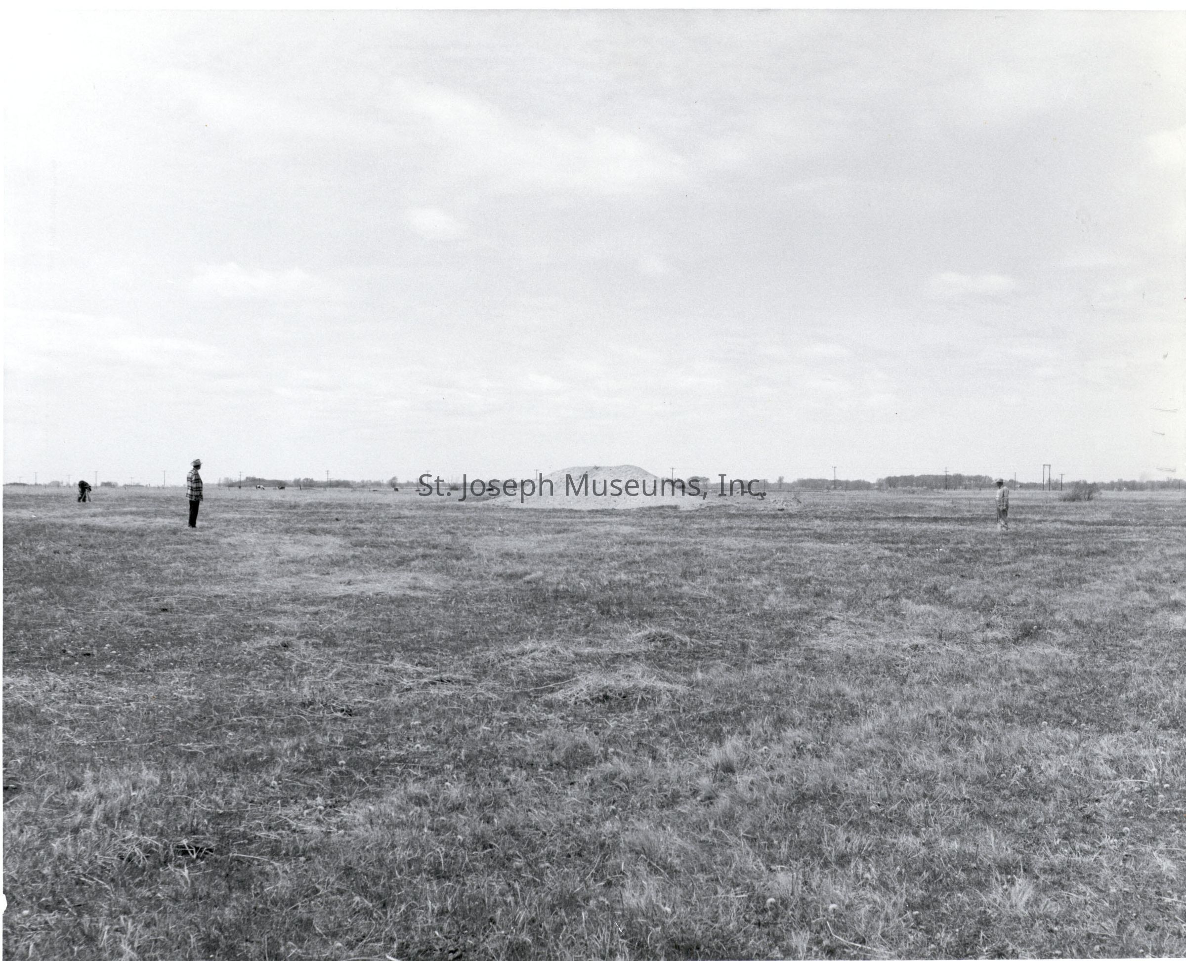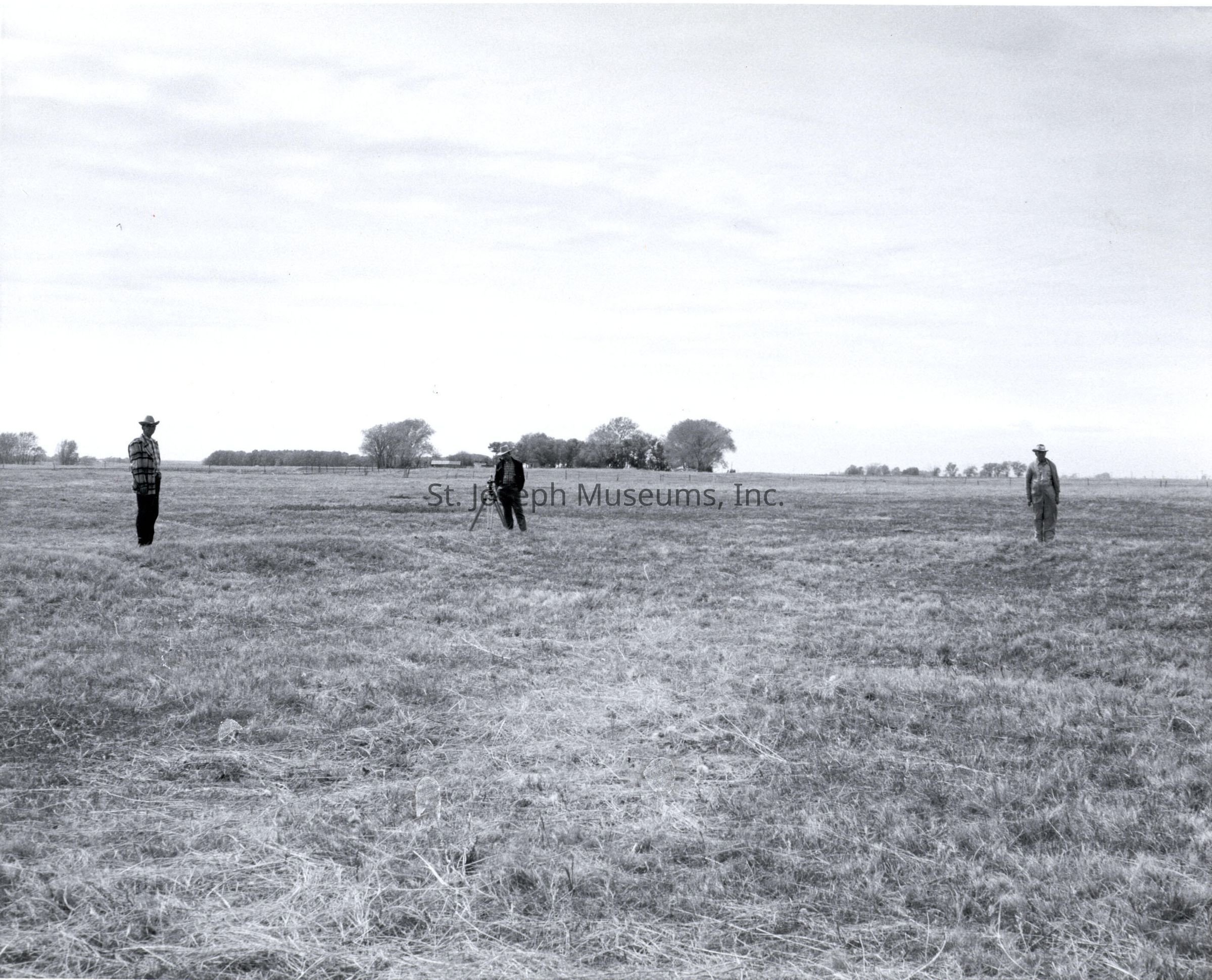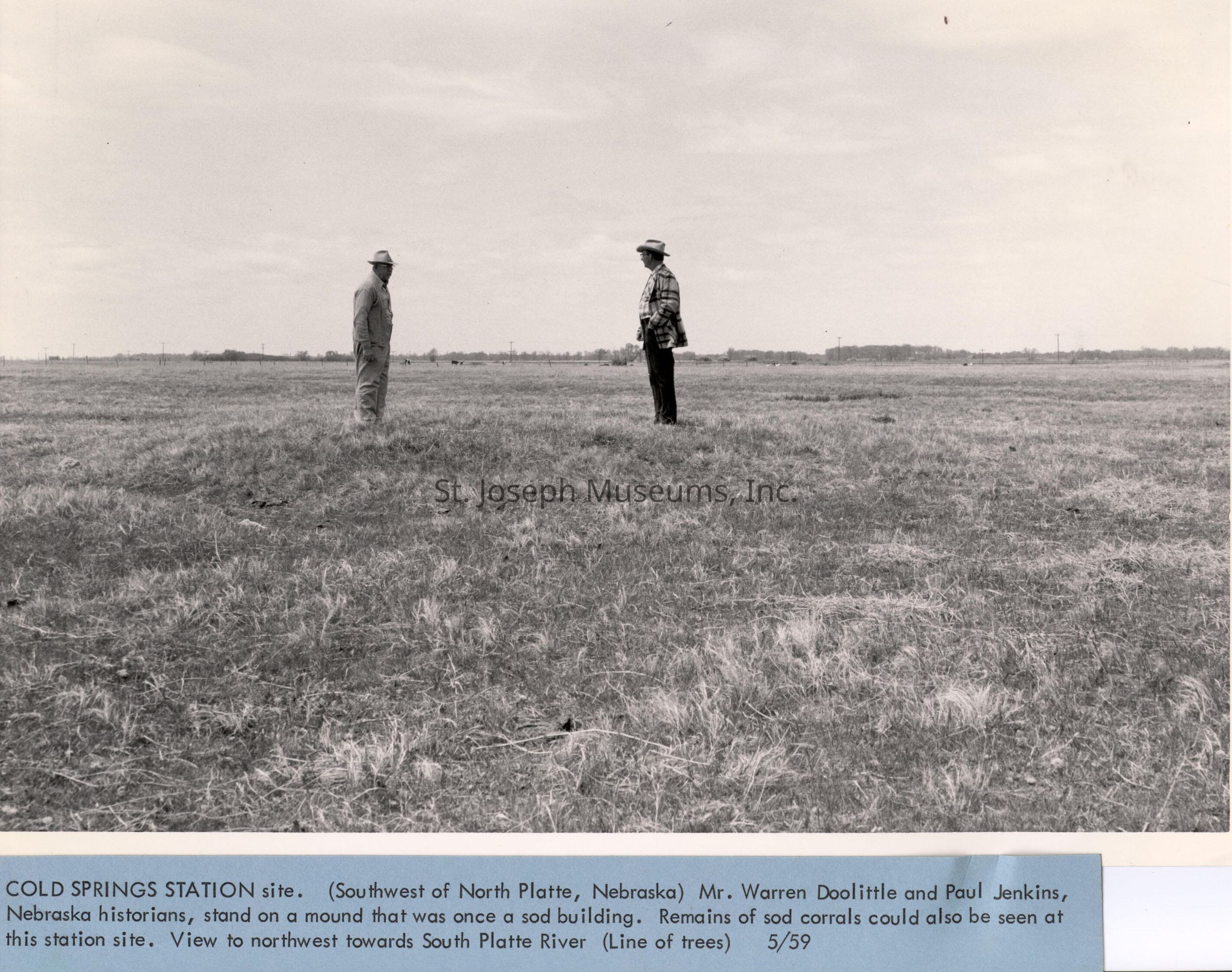 Cold Springs Pony Express Station Site, Nebraska, Photos, May, 1959. Four photos of the area where the Cold Springs Station was located, now a grass land. b/w 95.1P.394 = Two men standing in grassy field. a sunken circle at their feet barely visible. Legend : "Sod house ruin at Cold Springs Station Site." 95.1P.395 = Two men standing in grassy field on either side of slightly raised hump. Legend: Cold Springs Station Site. View to N.W. Mound is the ruins of small sod building." Also: "Cold Springs Station site. (Southwest of North Platte, Nebraska). Mr. Warren Doolittle and Paul Jenkins, Nebraska historians, stand on a mound that was once a sod building. Remains of sod corrals could also be seen at this station site. View to northwest toward South Platte River (Line of trees). 5/59" 95.1P.396 = Three men, center one with tripod, standing in grassy field, line of trees in background. Man on right and left standing on raised hump. Legend: "Cold Springs Station Site. View to S.W. Ruin of sod house at right. Corral fence ridge at left. 5-59." 95.1P.397 = Two men standing in grassy field, Dirt hill in background. Legend: "Cold Springs Station Site. View to N.W. Located S.W. of North Platte, Nebr. on property of Warren Doolittle. Figures indicate extent of corral. 5-59." old digital file names: NE-ColdSpgsStation-NE-ColdSpgsStation4
