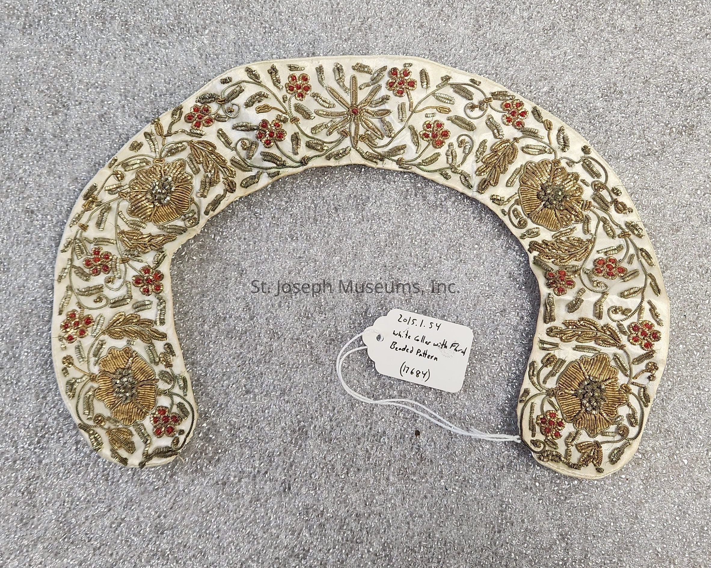 Collar/white nylon/beaded/floral design/metal clasp/"Hand made in India" Boar and Bears, Inc. N.Y.