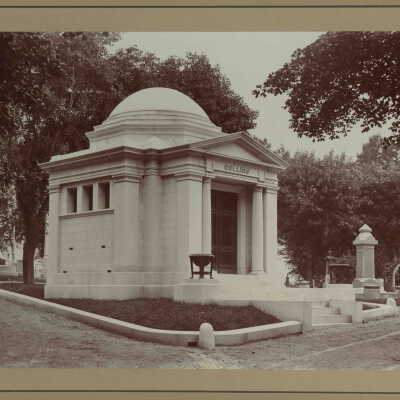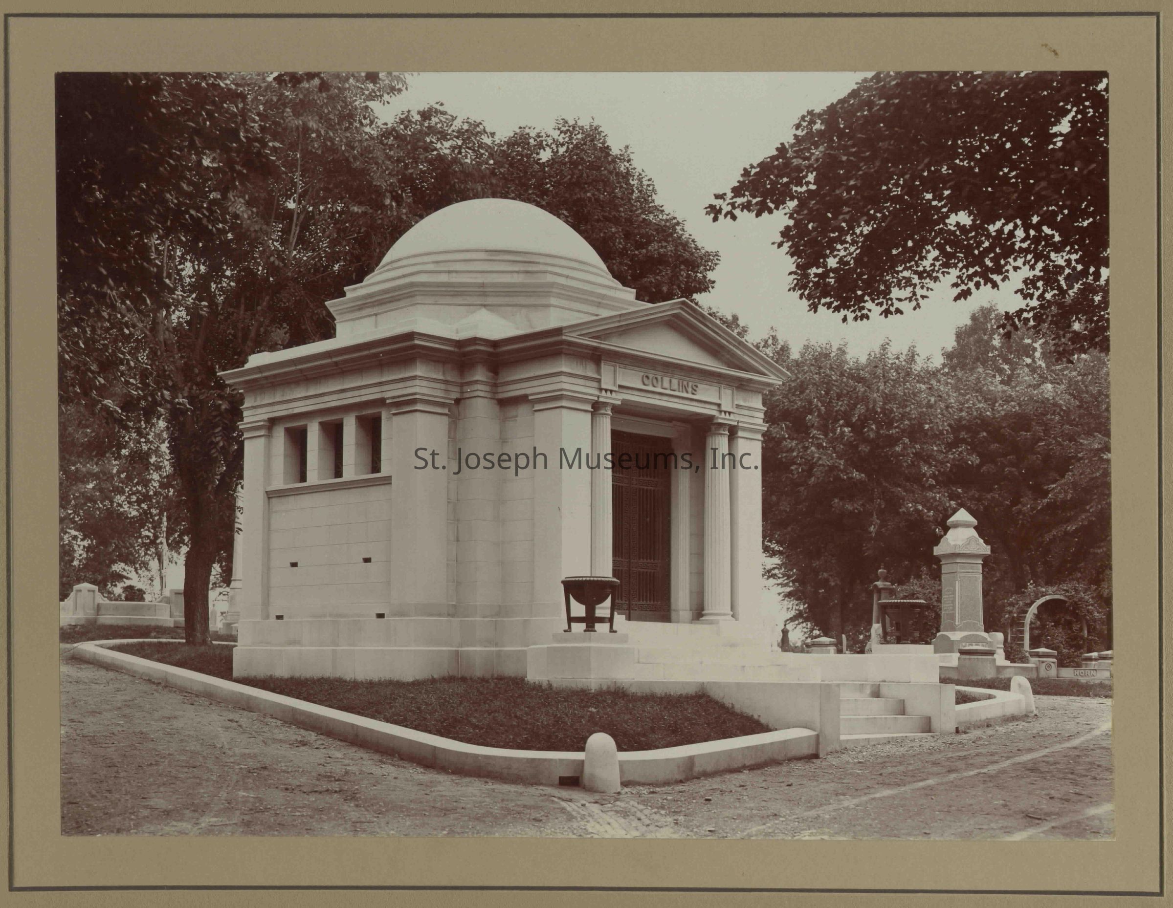 Collins, John Burnett Mausoleum, Mt. Mora Cemetery, 1910. Designed by E.J. Eckel, Architect. Mausoleum constructed in 1906. An un-numbered photo is oversized and located in Drawer B.