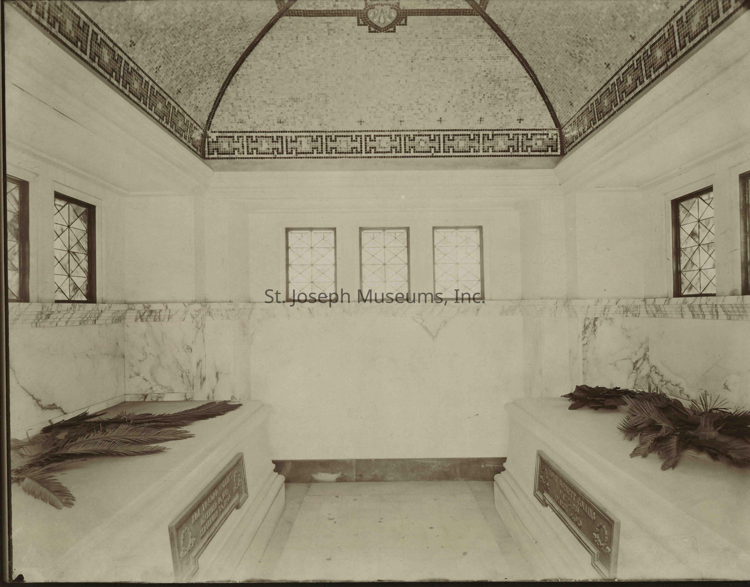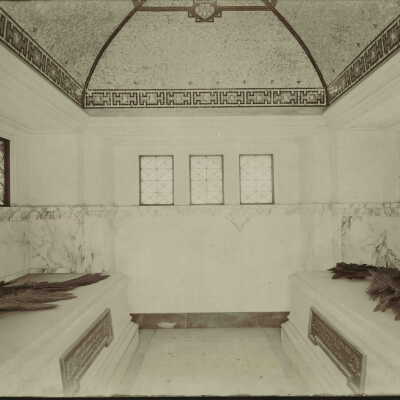 07.33.825B Interior View, White marble lined walls, with vaulted mosaic ceiling with decorative border, leaded glass windows. Name plate for tomb on left is "Ada McCord Collins", dod 1906, Tomb on right is "John Burnett Collins", dod 1910. Palm fronds adorn the top of each tomb.Collection