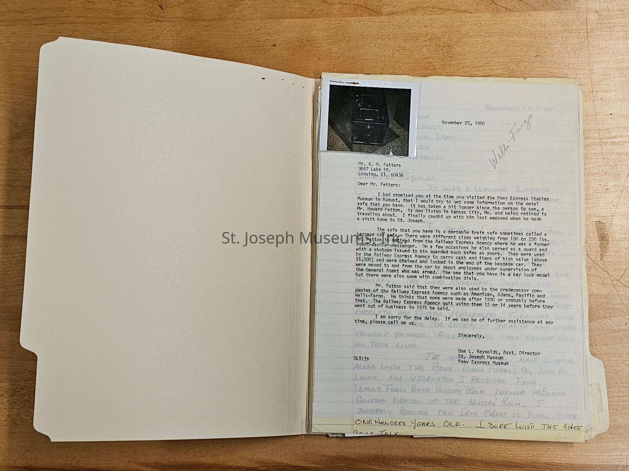 Various letters between Don Reynolds and others related in some way to Wells Fargo. Most are about artifacts as well, like a safe and a belt buckle