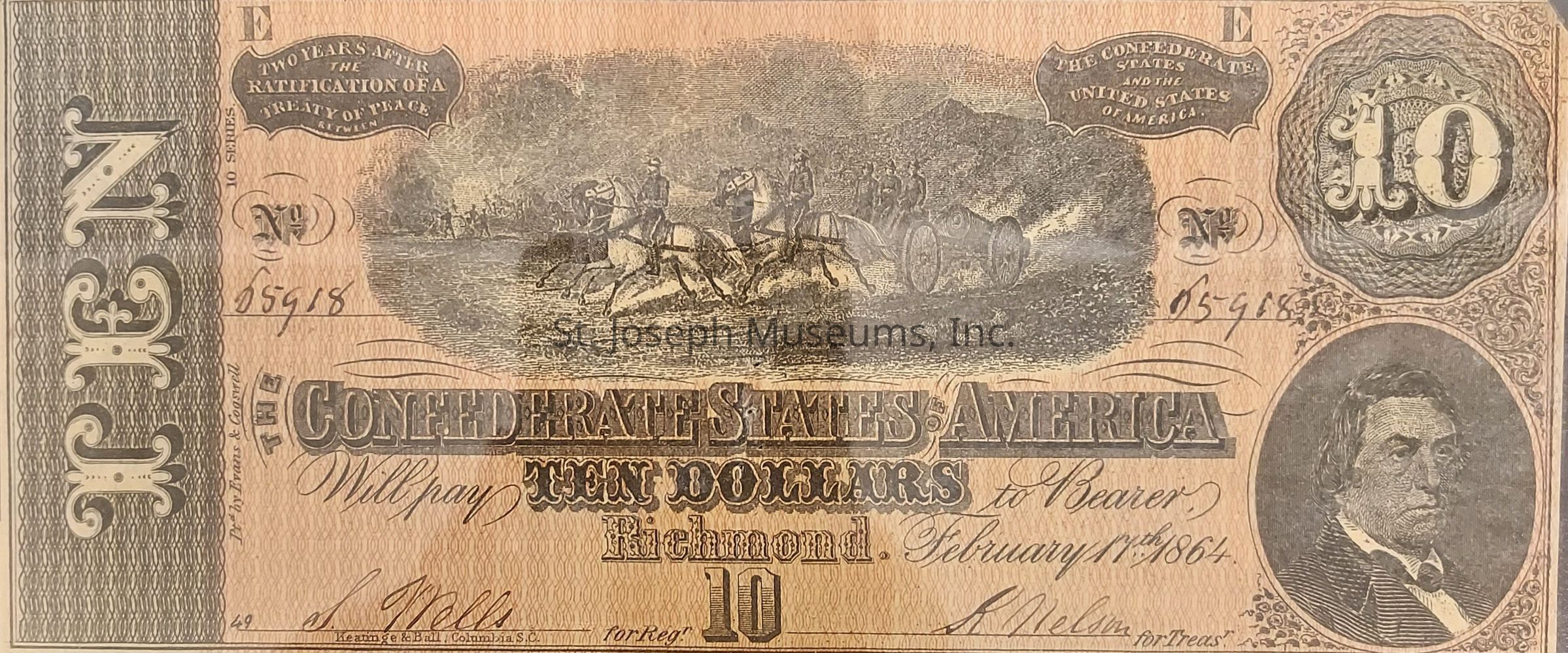 Printed by Evans and Cogswell, 10 Series. Number 25918. Signed by S. Wells and R. Nelson. Payable two years after the ratification of a treaty of peace between the Confederate States and the United States of America. Engraved by Keating and Ball of Columbia, South Carolina.