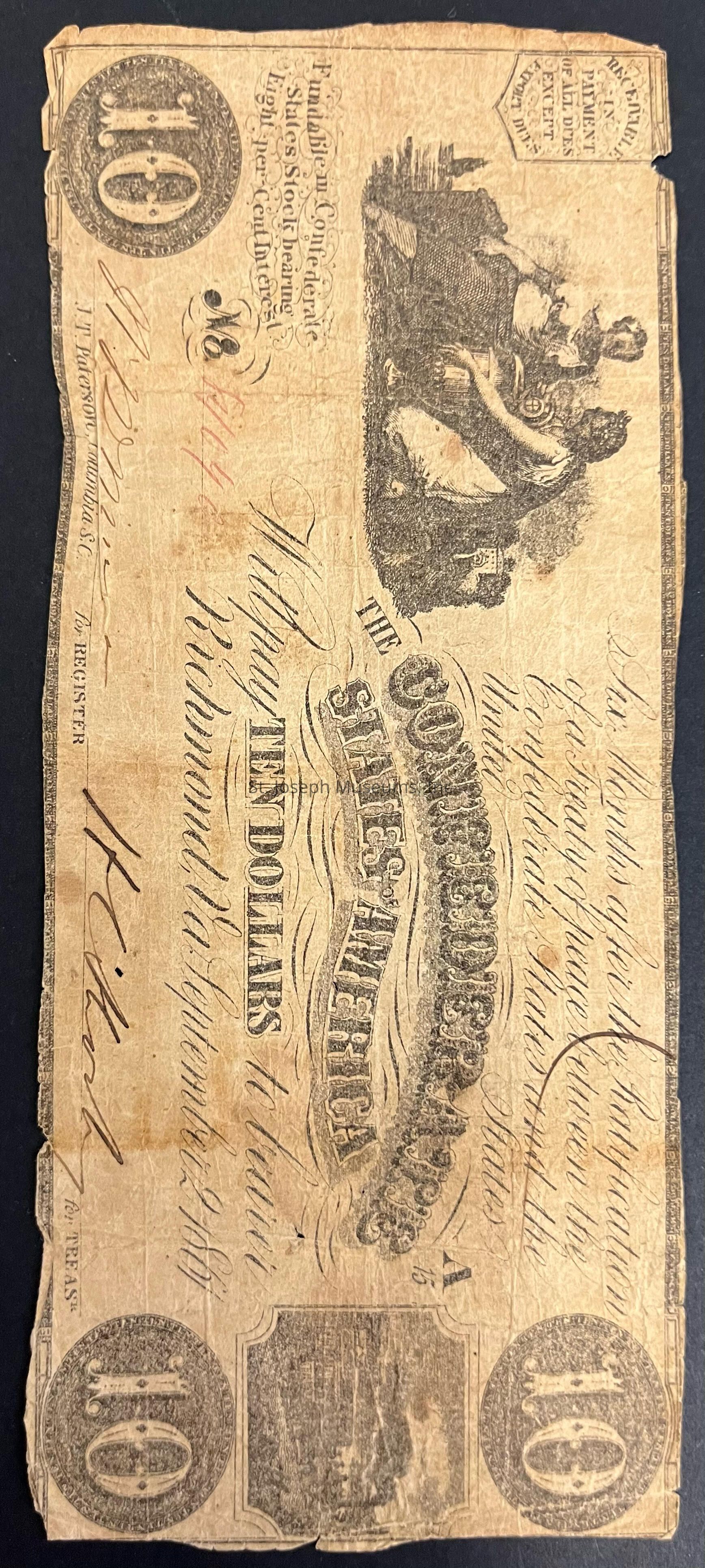 Confederate ten dollar bill, September 2nd, 1861. Front: Upper left corner reads "RECEIVABLE IN PAYMENT OF ALL DUES EXCEPT EXPORT DUES". Next to that is a picture of two women holding an urn. Below them reads "Fundable in Confederate States Stock bearing Eight per Cent Interest". Main writing reads "Six Months after the Ratification of a Treaty of peace between the Confederate States and the United States", "THE CONFEDERATE STATES OF AMERICA Will Pay TEN DOLLARS to bearer", "Richmond, Va September 2nd, 1861". To the right is a small picture of a train. No. 1040. Bill is discolored and edges are worn. 7.25"lx3"hCollection