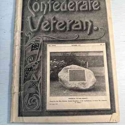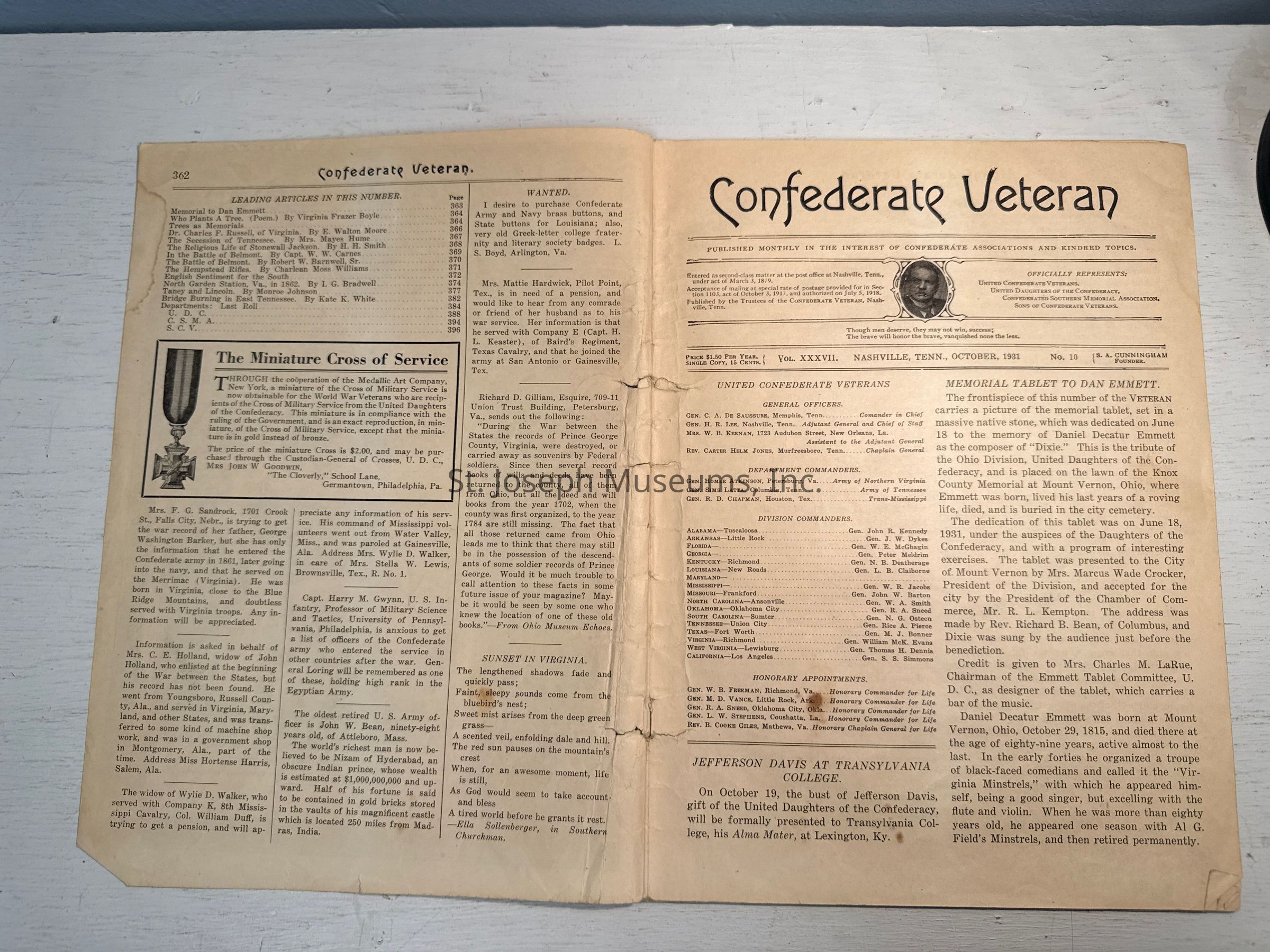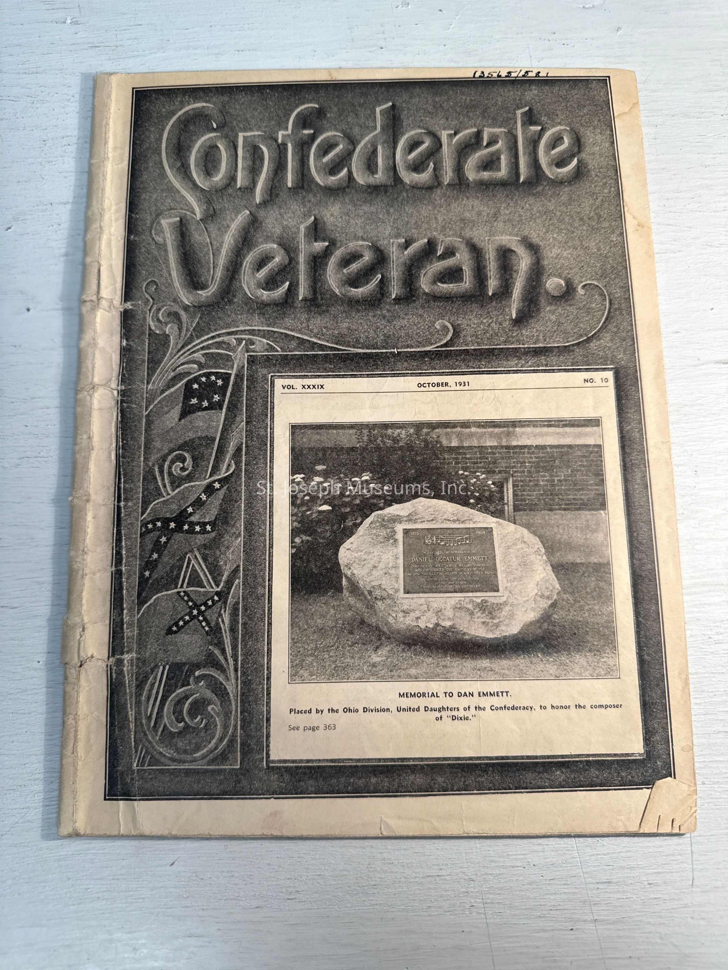 Confederate Veteran October 1931, This is Vol.XXXIX. On the front cover is large stone with a plaque as a memorial to Dan Emmett. It was placed by the Ohio division, United Daughters of the Confederacy, to honor the composer of "Dixie".