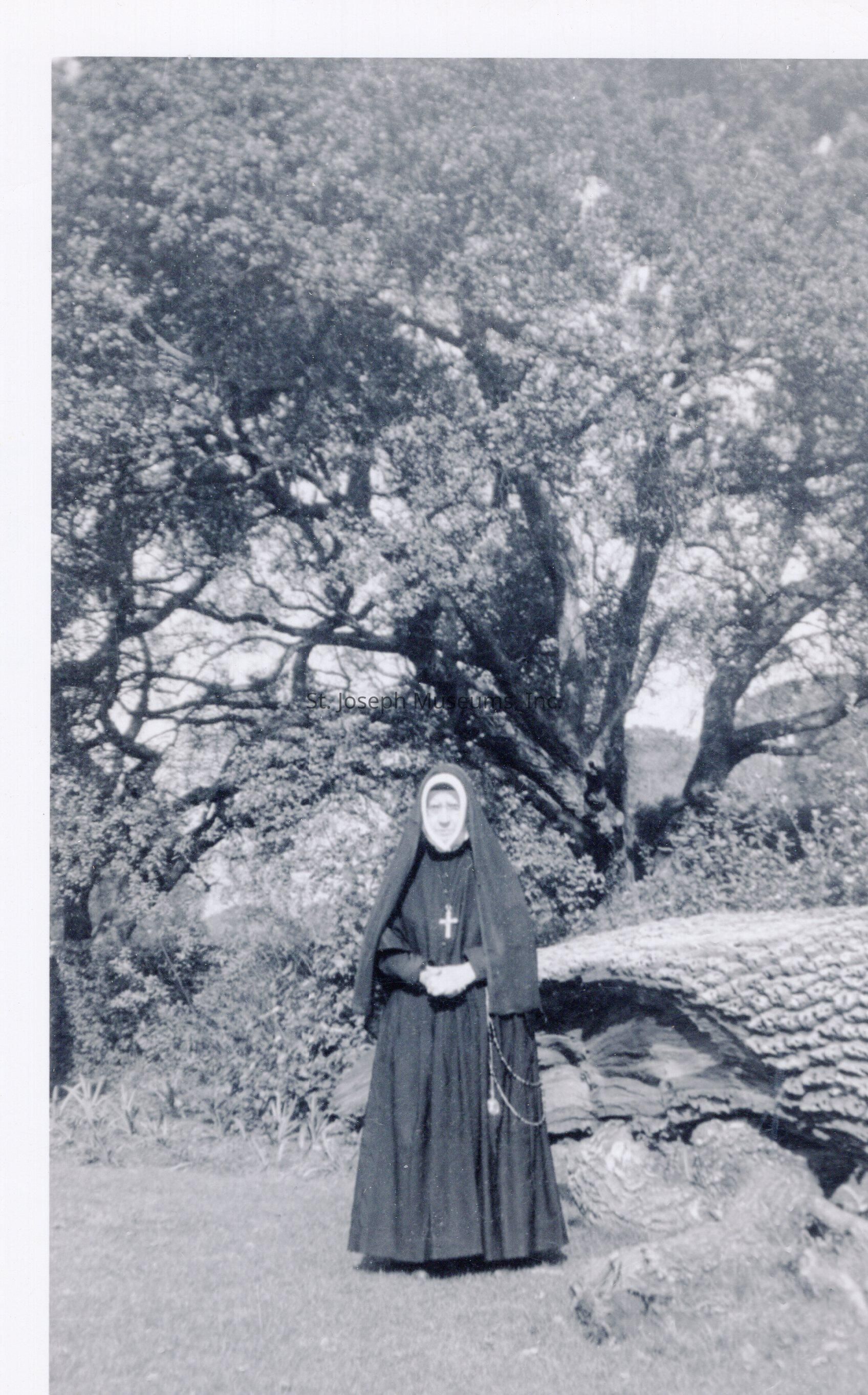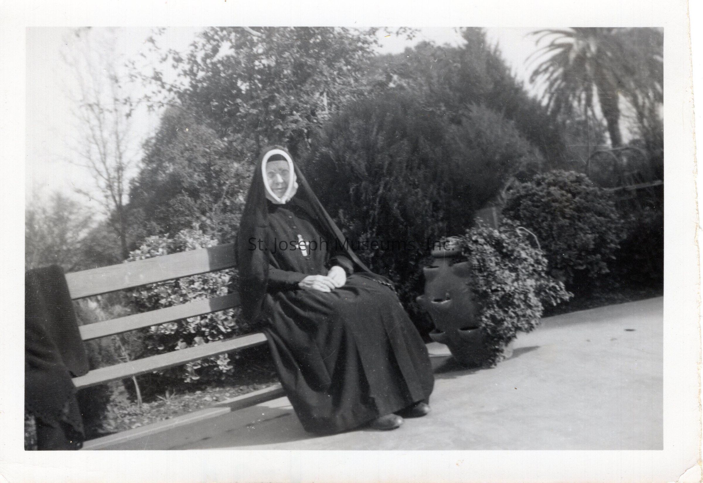 Conrad, Agnes: Photos as Nun, 1910-1962. Snapshots and formal portrait of Agnes Conrad, daughter of Thomas & Mary Ivory, after she entered the Religious Society of Sacred Heart. By 1962 she was Mother Conrad, located at Menlo Park, California. A&B = Snapshot of two nuns wearing habits in office setting. The older nun is Mother Agnes Conrad; the younger nun is her niece, Genevieve Clarke, daughter of Agnes's sister, Martha. b/w. 5" x &7". Handwritten on back: "Mother Agnes Conrad (on right) Sr. Genevieve Clarke (on left) at Convent in Menlo Park, CA, 1962. Religious Order of Sacred Heart." 2 copies. C = Snapshot of nun in habit sitting on park bench in garden. b/w 3¼" x 5". Handwritten on back: "Agnes at Menlo. Mother Agnes Clarke (sic), R.S.C.J."* *Religious of the Sacred Heart of Jesus-- in French. D&E = Studio portrait of Agnes Conrad, upon entry into religious order. Bust view. She is wearing a black hat, a dark coat with large up-turned collar, and dark dress, undated, but could be c. 1910. Uhlman Photographer. Sepia, 3¼" x 5". 2 copies. Handwritten on back: "Agnes Conrad" and Label: "Agnes Conrad, now Madame Conrad, Menlo Park, Calif." F = Snapshot of Mother Agnes Conrad in habit, posing against trunk of fallen tree. b/w. 3½" x 5". Handwritten on back: "Agnes" and Mother Agnes Clarke (sic, should be Conrad). R.S. C. J.
