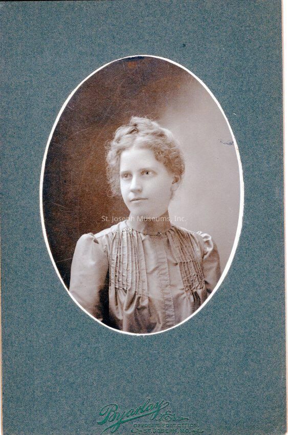 Conrad, Agnes: Portraits as Young Woman, 1898-1902. Five studio sittings of Agnes Eugenia Conrad from her high school graduation to the year 1902 when she entered a religious order. Agnes is the youngest child of Thomas & Mary Ivory Conrad. (Also see archives catalog entry 15.22.45 for adult photo of Agnes) A = Photo of young woman, age 28, bust view in oval, matted. She is wearing her hair up, and a medium color dress with high collar and long sleeves, placated front with tight pleats. b/w. 4 ¼" x 6½". Byarlay Photographer. Handwritten on back: "Agnes Conrad, St. Joseph, Mo. 1902" B = Same sitting as above, but seated on bench, with hand on low rail. She is wearing shiny blouse with plain straight skirt. b/w. 4 ¼" x 6½". Byarlay Photographer. Label on back: "Agnes Conrad, sister of W.I. Conrad, St. Joseph, Mo. Entered Society of Sacred Heart 1902. Died June 29th, 1964, Menlo Park, Calif." C = Photo of young woman. b/w Bust view. Her light hair is worn up on her head. She is wearing a dark dress with rows of white flecks, two white ribbons lined across upper bodice, pouf sleeves, high collar. 4¼" x 5¾" in brown mat 5¼" x 7¼". Uhlman, Photographer. Handwritten on back: "Agnes Conrad, 1902" D-G = Photo of young woman, just younger than A-C. b/w. Bust view. Her light hair is worn up on her head. She is wearing a lower-cut, patterned dress with flounced collar and flounced sleeves, a cameo pinned at center. Uhlan, Photographer. Handwritten on back: D = "Agnes Conrad, 1902"; E = "Miss Agnes Conrad, St. Joseph, MO., 1898" F = "Agnes Conrad, St. Joseph, MO, 1898. Later, Mother Conrad, Religious of the Sacred Heart, Menam Park, Calif." G = "Agnes Conrad, ROSY, St. Joseph, MO 1898, Later Mother Conrad, R.S.C.J., Men's Park, Calif." H&I = Photo of teen girl. Sepia. Full length. She is wearing long white dress with flounce at base of bodice, ¾ length sleeves with large lace cuffs. She is holding a fan and wearing a pendant necklace and has a bracelet on her right arm. A pair of long white gloves are draped over a table on her left. Her light hair is pulled back and tied with ribbon. 2 copies. Uhlman, Photographers. 4¼" x 6½" Handwritten on back: "Agnes Conrad, Graduation, Age 18, 1891"