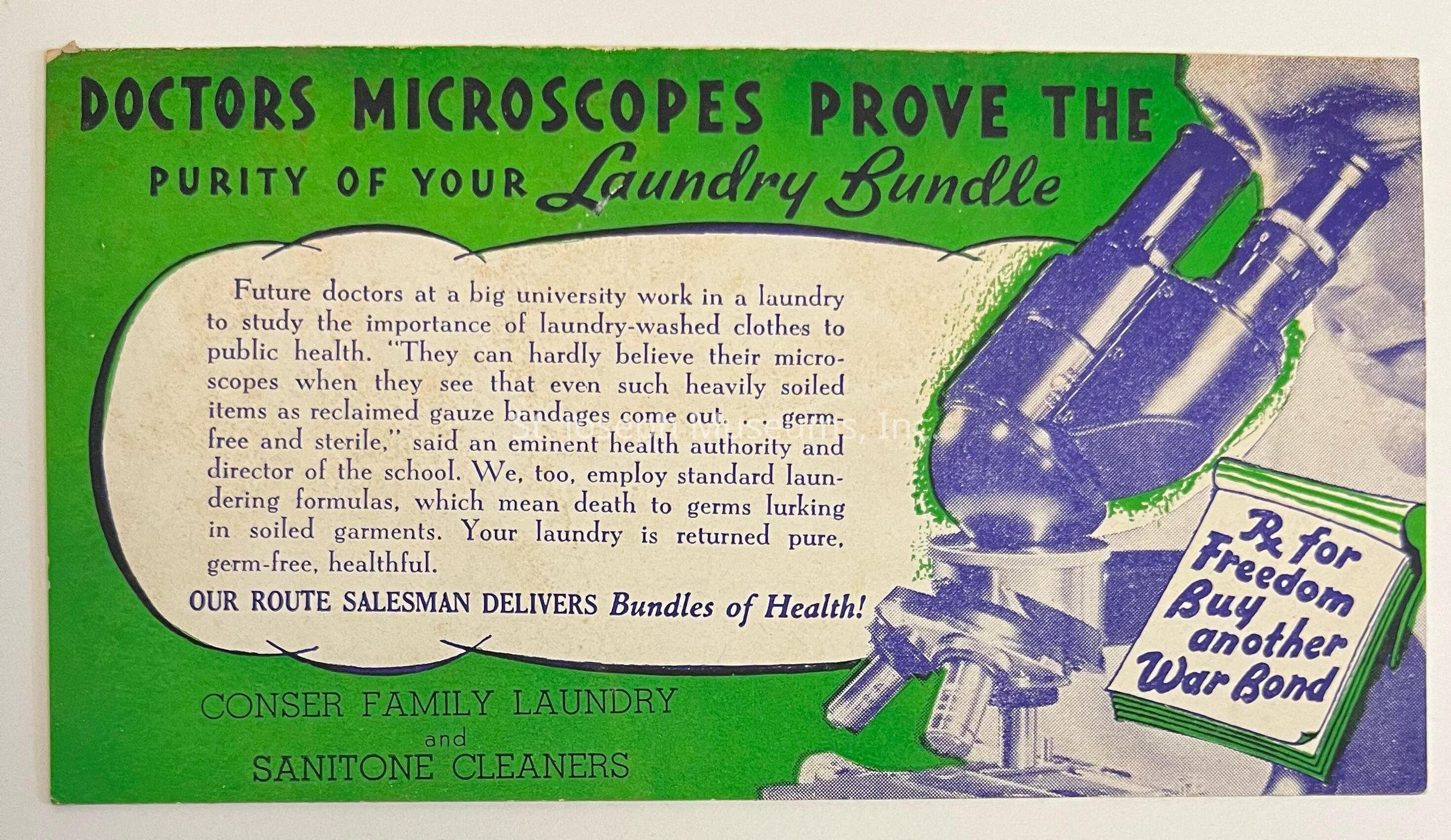 Conser Laundry Advertising Trade Card, c. 1942. Conser Family Laundry and Sanitone Cleaners. Green card with photo of doctor looking into microscope. "Doctors Microscopes Prove the Purity of your Laundry Bundle. Our Route Salesman Delivers Bundles of Health" "Rx for Freedom, Buy Another War Bond.