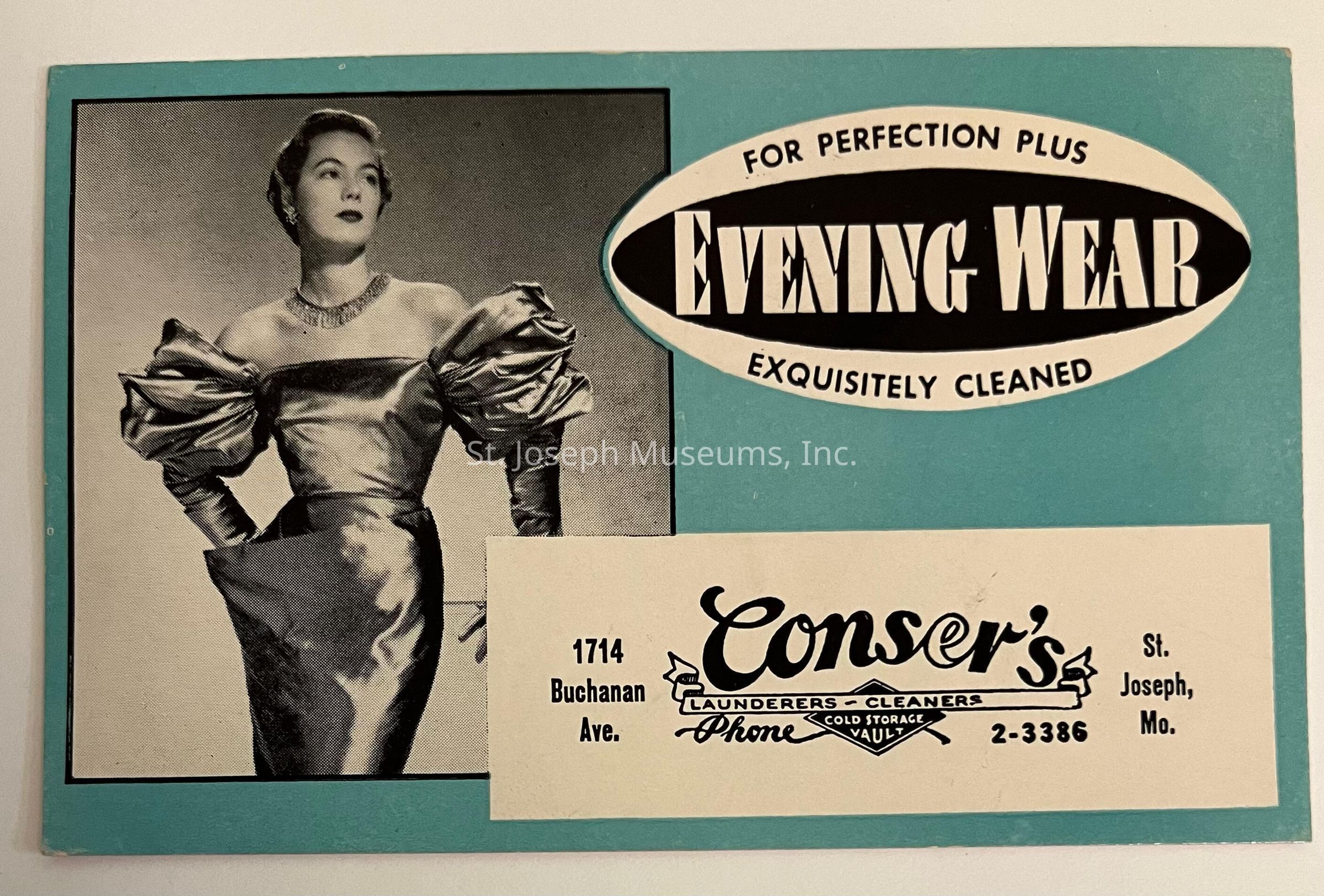 Conser Laundry Evening Wear Advertising Trade Card, c. 1942. Postcard-size blotter with photo of young woman in satin evening gown, with puff sleeves. "Perfect for Evening Wear, Exquisitely Cleaned. Conser's Launderers-Cleaners, 1714 Buchanan Ave. St. Joseph Mo., 2-3386.Lexicon