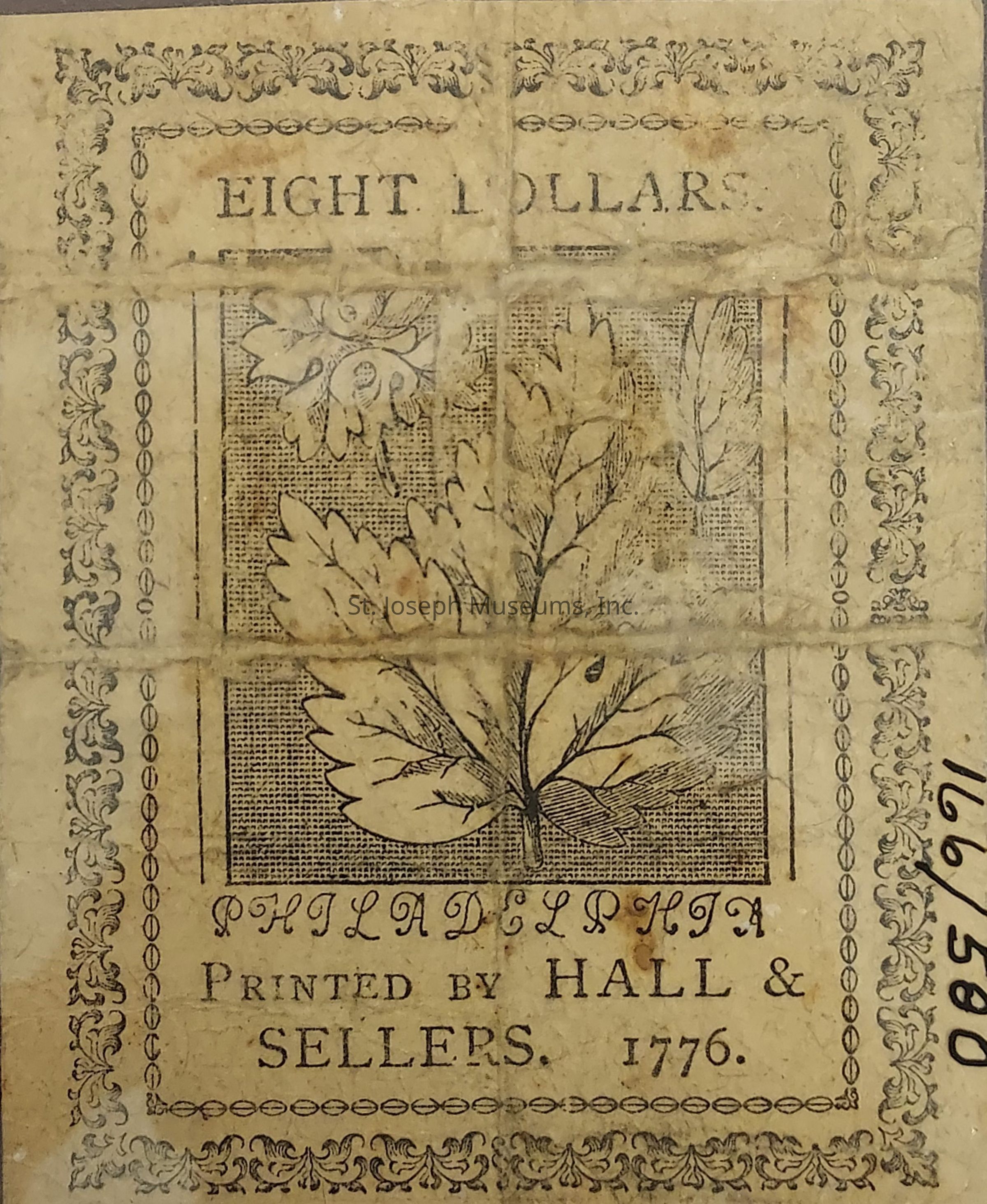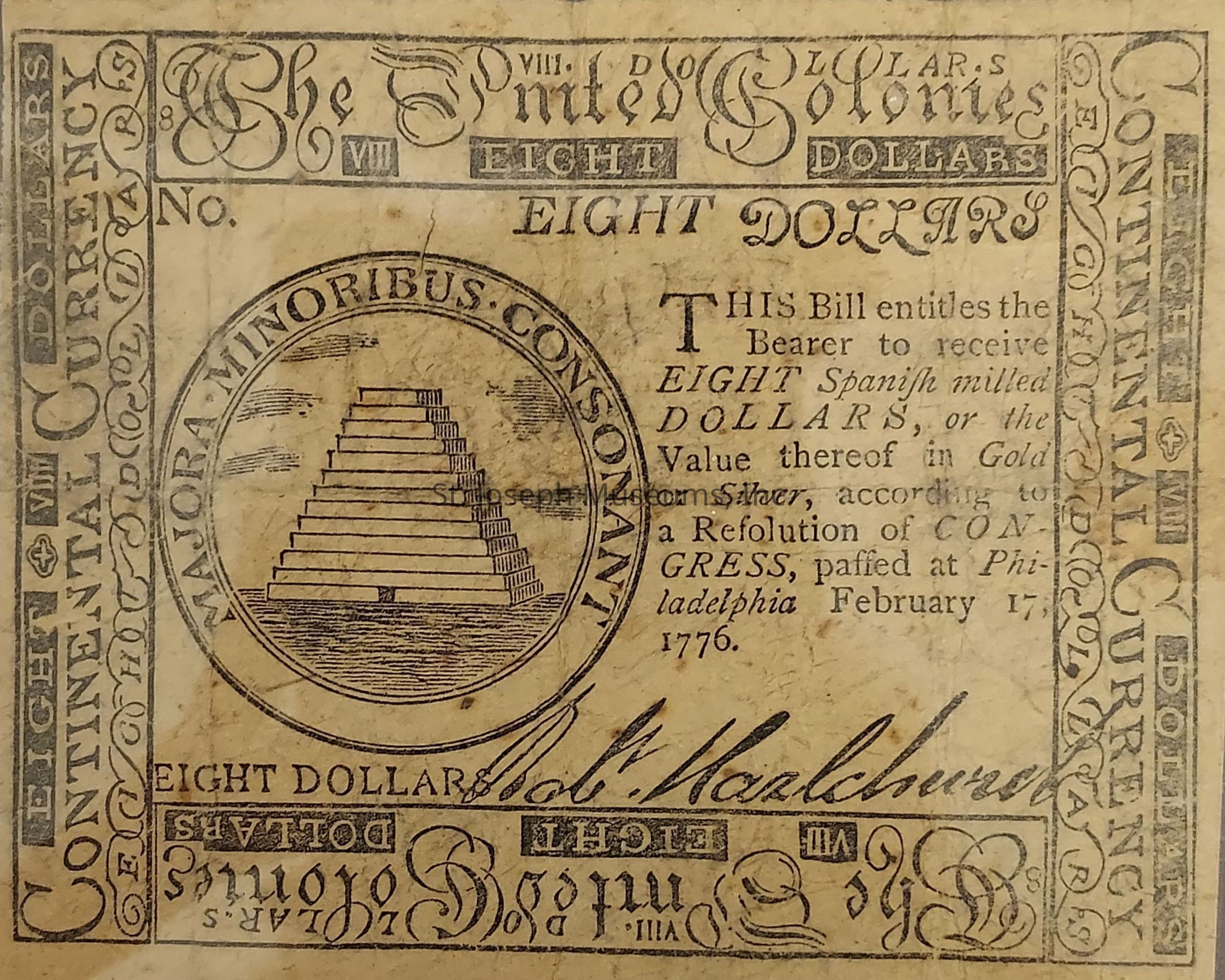 Continental Currency, Eight Dollars, 1776. An 1876 Reproduction. The reproduction was for a YMCA benefit for a reading room in Springfield, MA. Original Eight Dollar Continental Currency had a seal of a Harp with 13 strings, and the Fifty later had a more elaborate step pyramid with a small triangle above the door, and the words Perrenis, which means Everlasting. Front Printed around the left and right side, Eight VIII. Dollars, Continental Currency, Eight Dollars; top and bottom, VIII. Dollars, The United Colonies, VIII. Eight Dollars. Seal is of a step pyramid with the wording Majora-Minoribus-Consonant, which means The Larger are in harmony with the smaller. Text in the center reads This Bill entitles the Bearer to receive Eight Spanish milled Dollars, or the Value thereof in Gold or Silver, according to a Resolution of Congress, passed as Philadelphia February 17, 1776. Signed on front, no note number. Reverse Print reads Eight Dollars, and Philadelphia, Printed by Hall & Sellers. 1776. Image of a henebit leaf and two buttercup leaves.