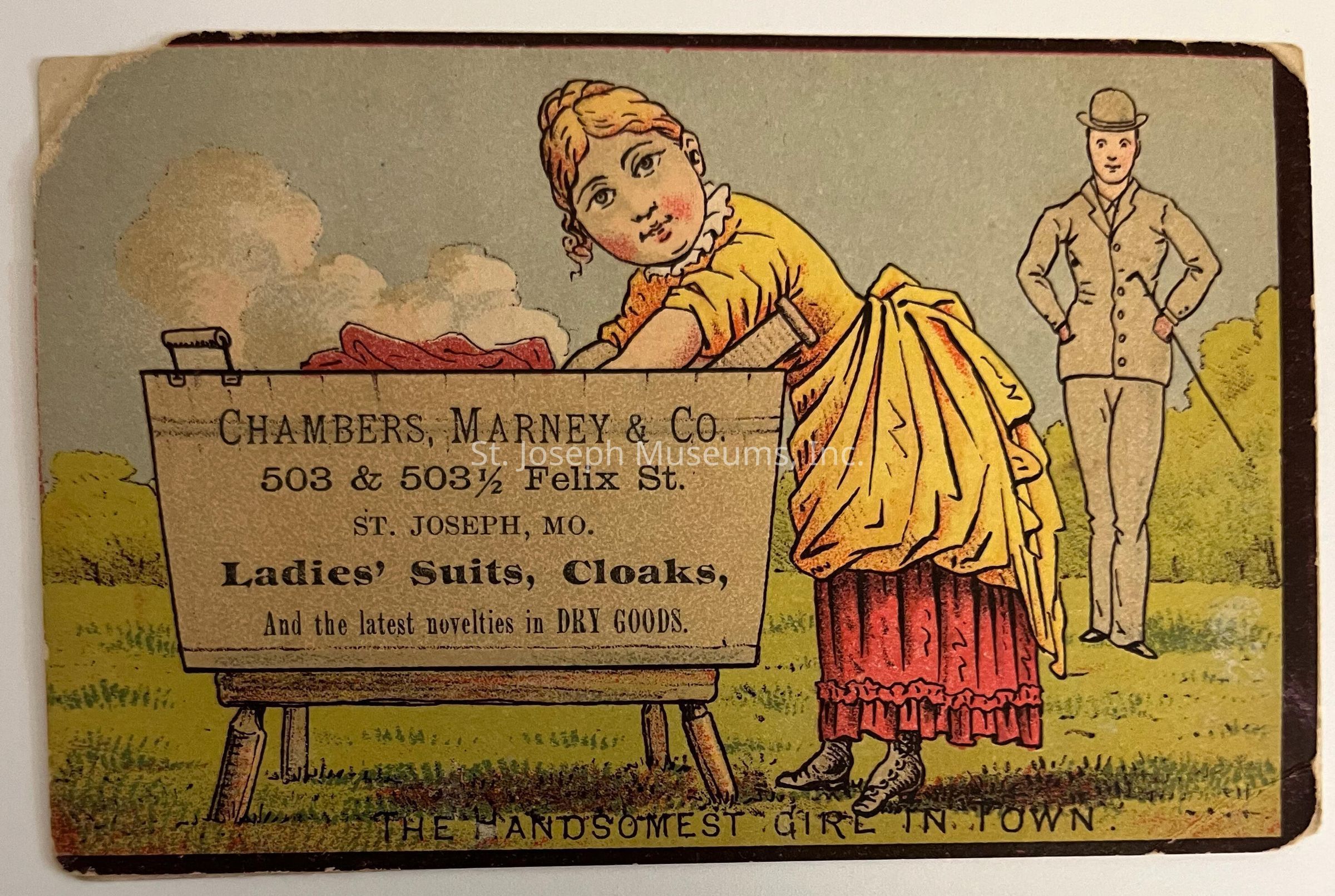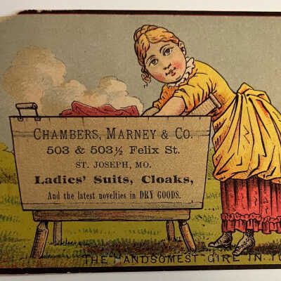 Chambers, Marney & Co Ladies Suits & Cloaks, Business Card, undated. Color illustration of woman washing clothes in a tub with man in suit in background. "The Handsomest Girl in Town". c. 1895