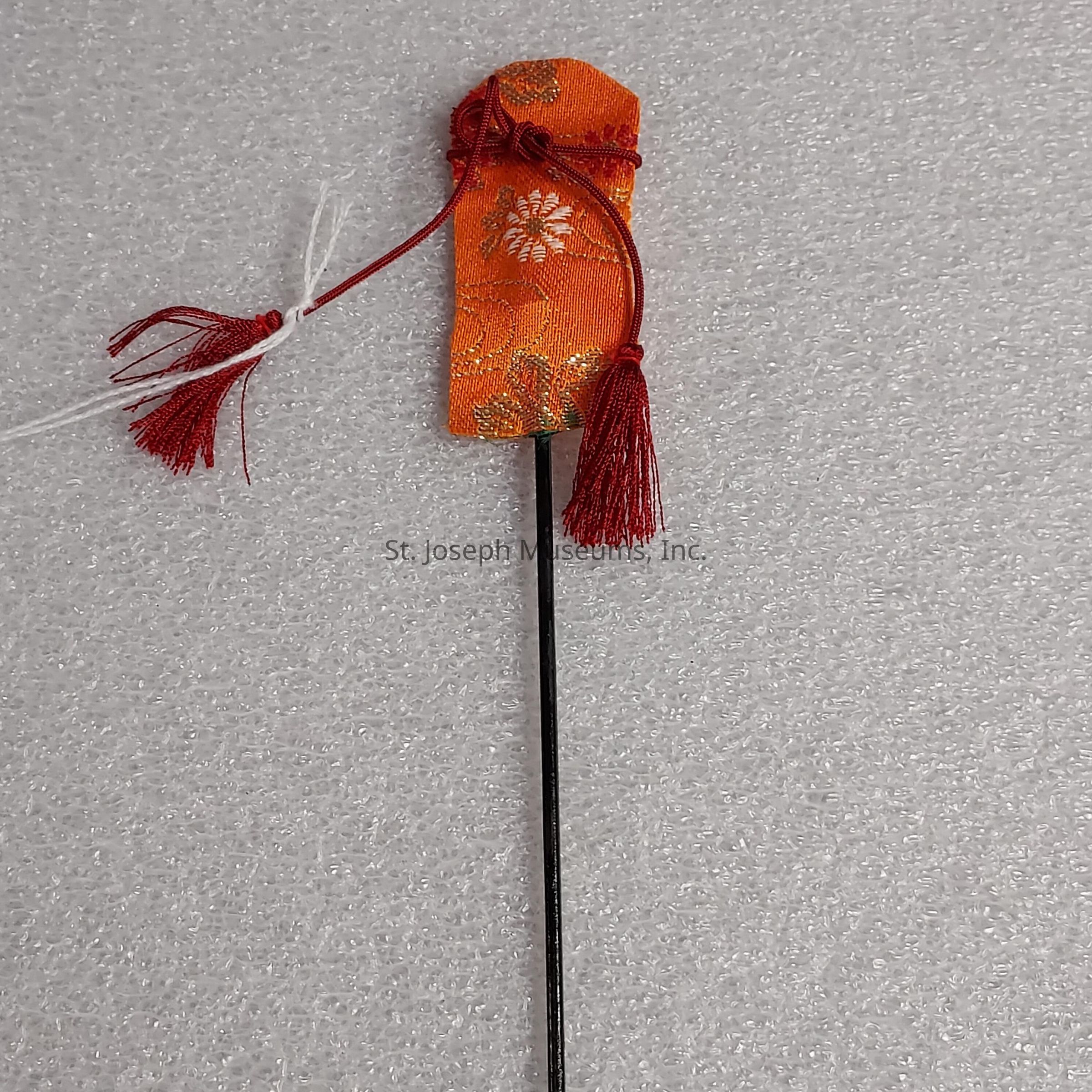 Black pole from palanquin with a matching orange banner to the roof of the carrier. Banner has red rope and tassels tied around it.