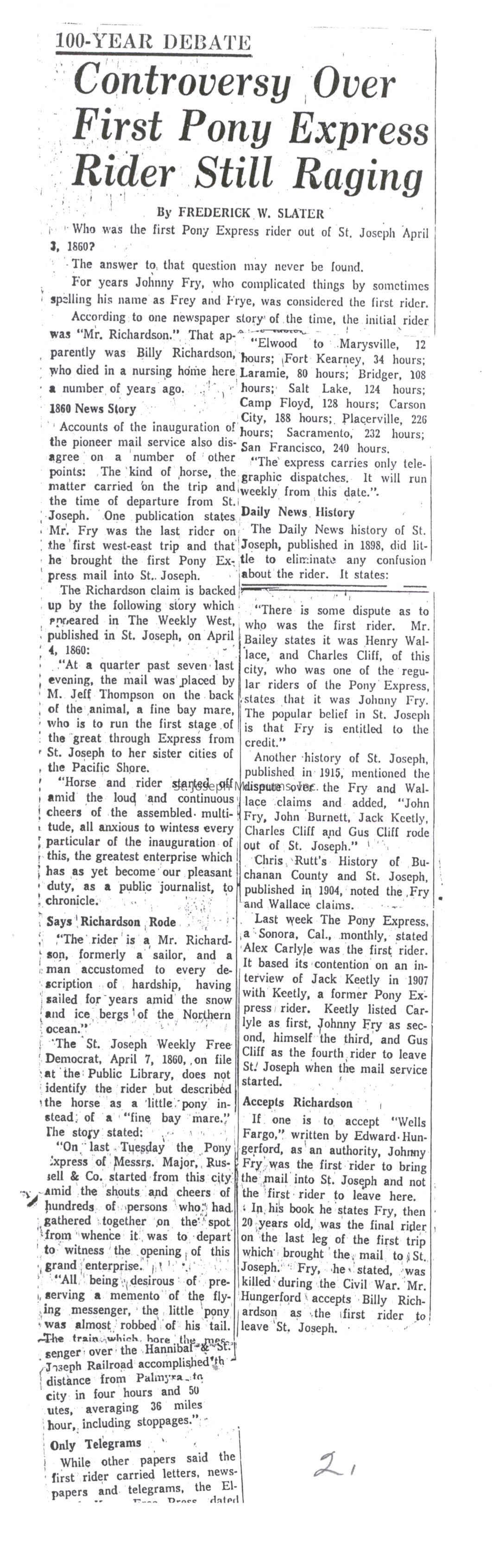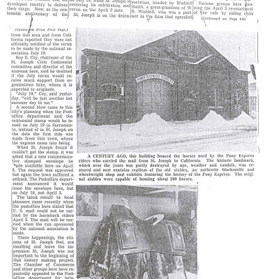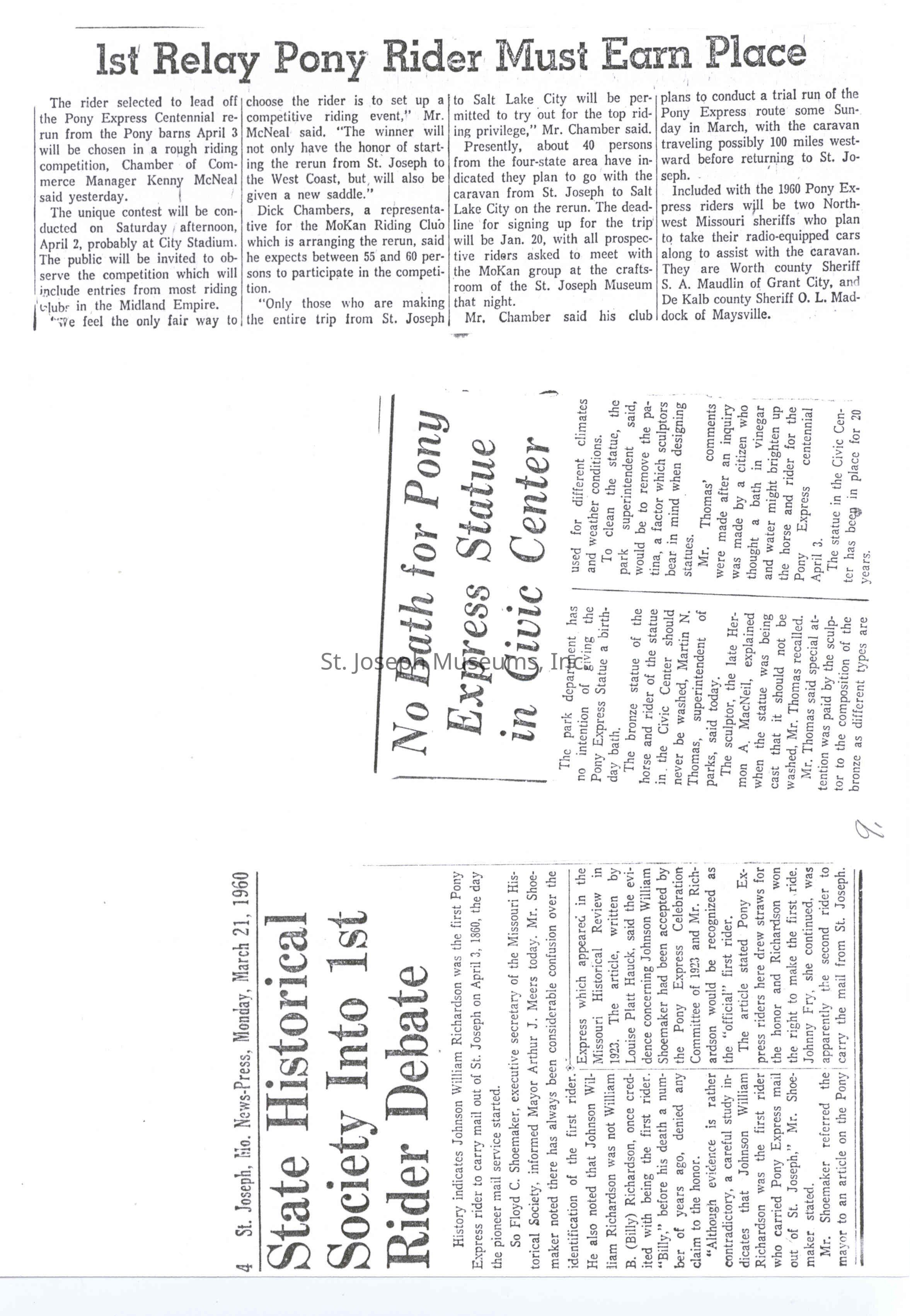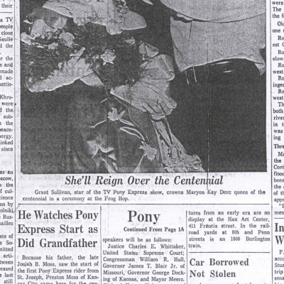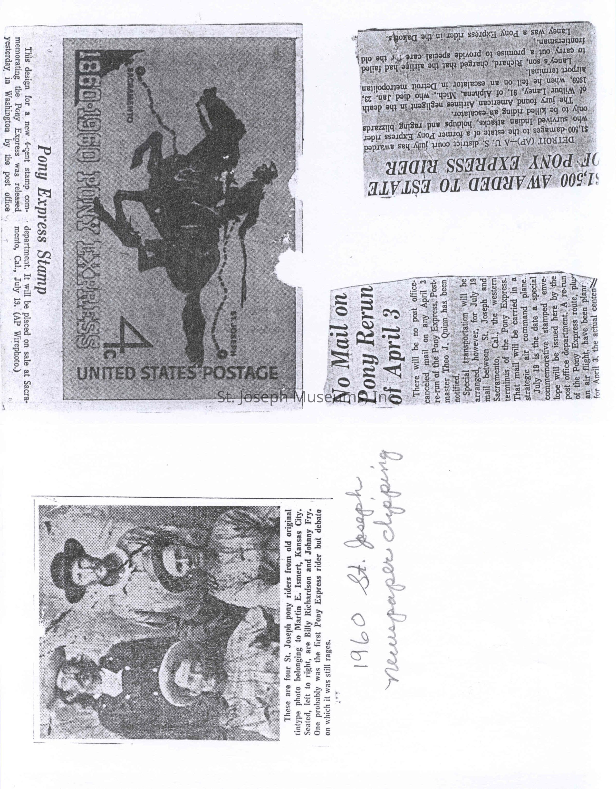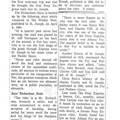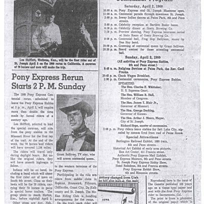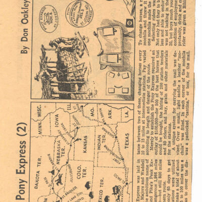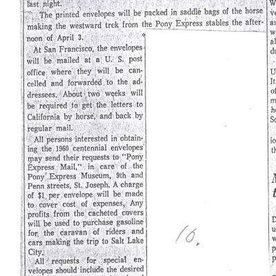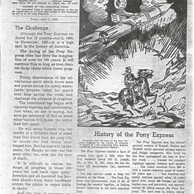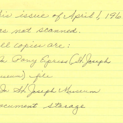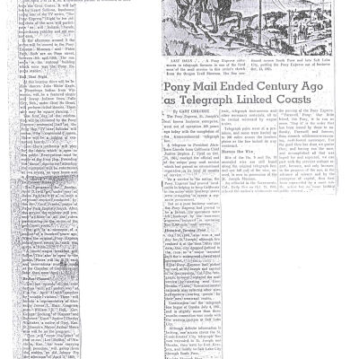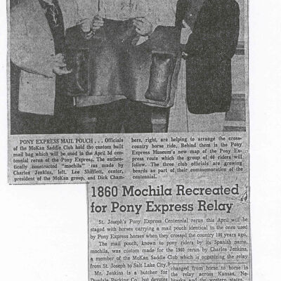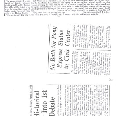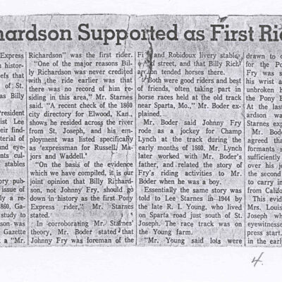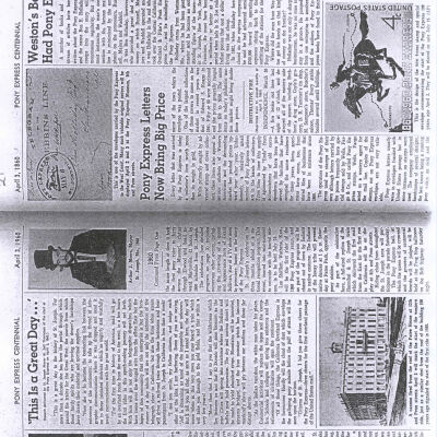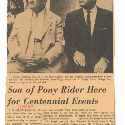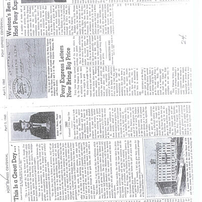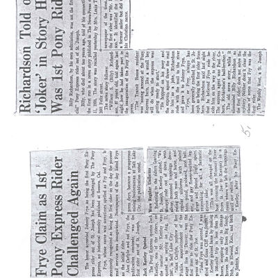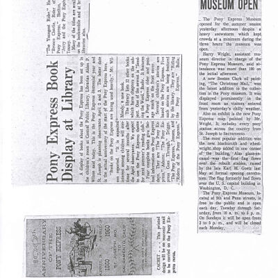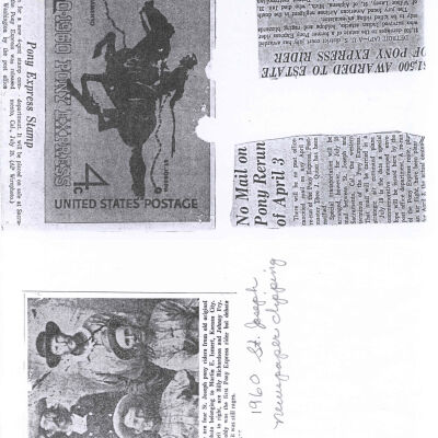 Files contain correspondence with Pony Rider descendants, Pony Express rider biographies, newspaper clippings related to the Pony Express, and miscellaneous records, photos, and documents collected from major private and University libraries among other sources. NOTE ABOUT ORIGIN OF LIBRARIES FILE. Prior to the opening of the renovated Pony Express Museum in 1993, St. Joseph Museum staff did extensive research on the Pony Express. All of the libraries in this folder were visited and copies of all material related to the Pony Express were made. This was done from 1991 to 1993. Information from this research was used in the new exhibits of the Pony Express Museum and in preparation of the book On the Winds of Destiny. In 2015, the file from the Pony Express Museum was added. Jackie Lewin 7/27/15 CD containing scans of actual documents found in Pony Express Research Files located in file cabinets in Document Storage II area.